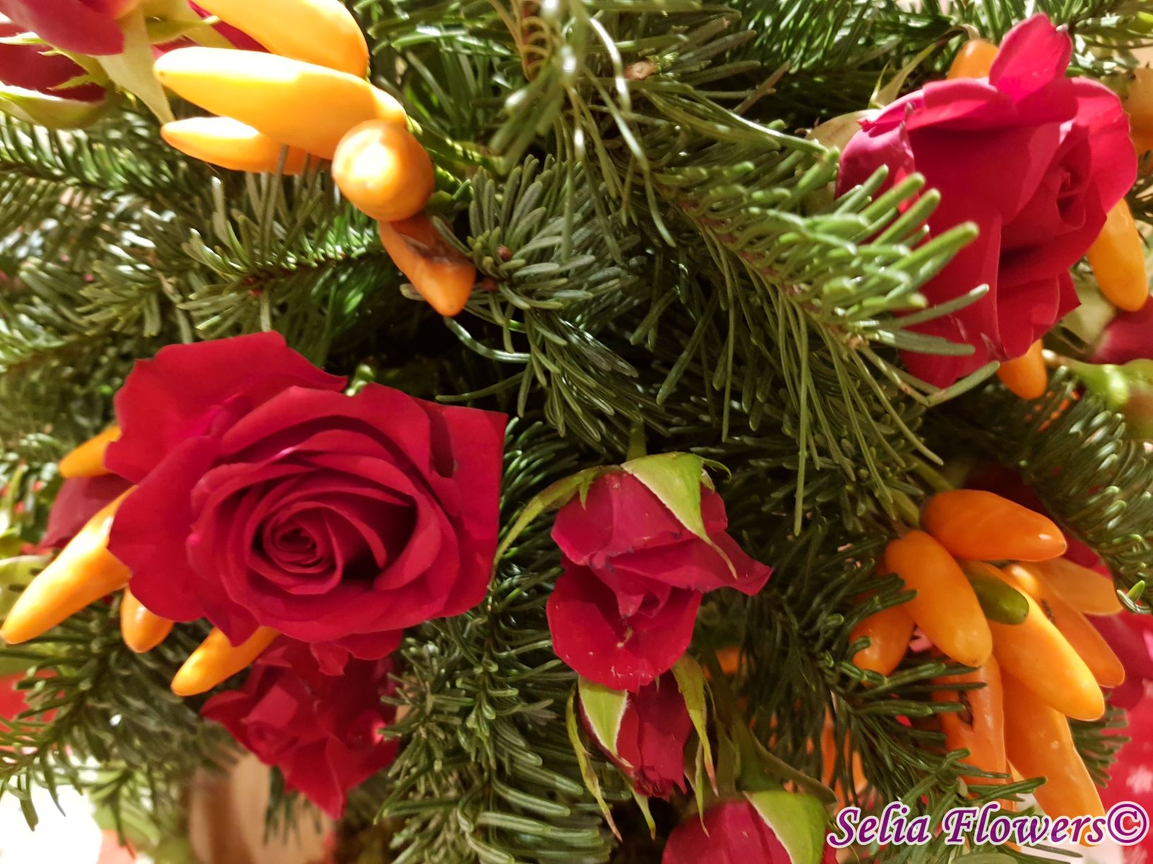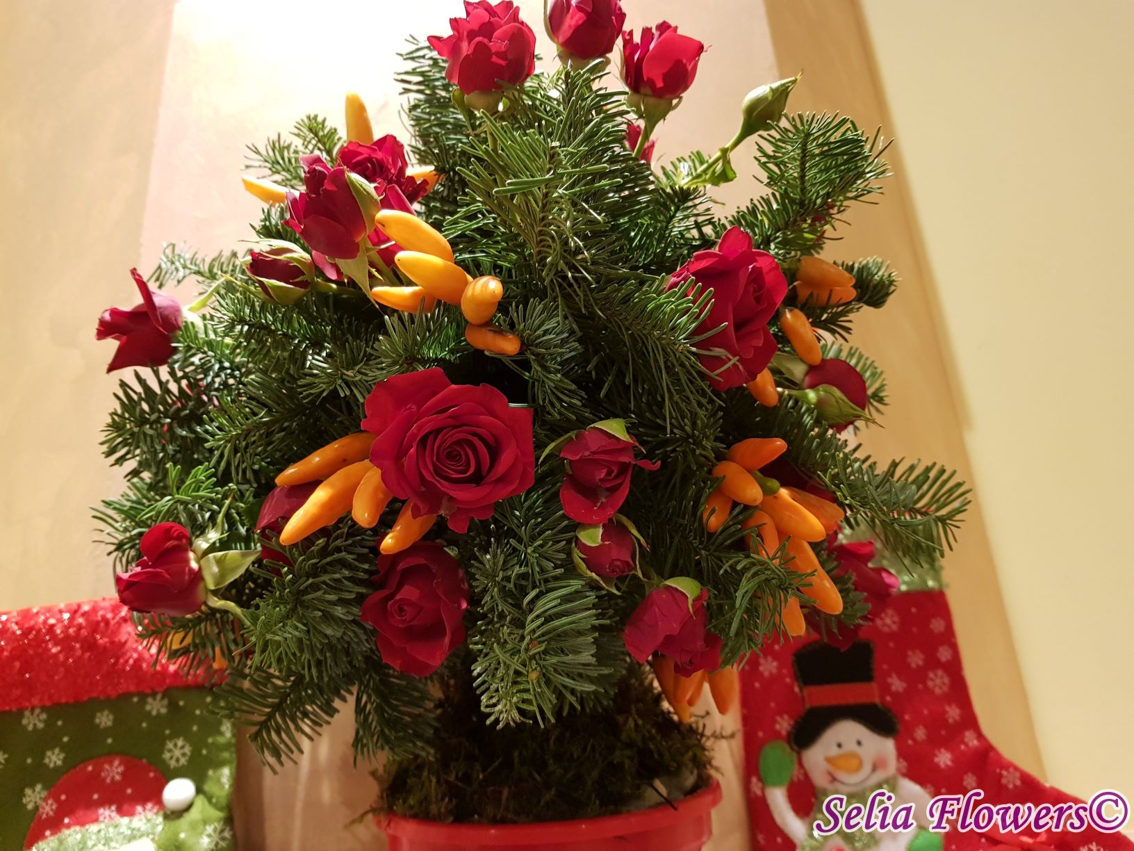 Un brăduț handmade din brad Nobilis, miniroze și ardei decorativ, construit pe suport de burete umed în formă de sferă care asigură hidratarea plantelor.