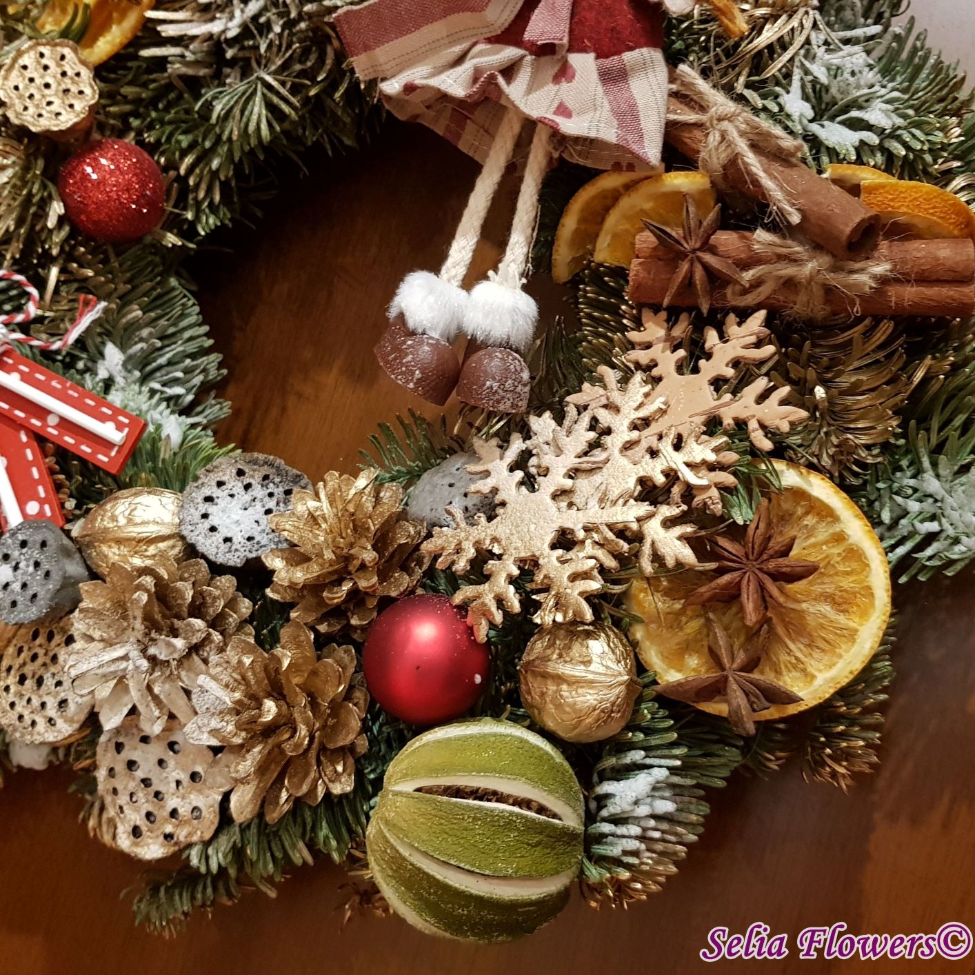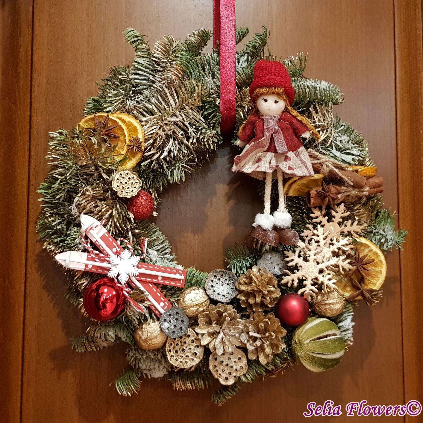 Coronița este construită din crenguțe de brad nobilis blue, elemente decorative aromate ( batoane de scorțișoară, lime, felii deshidratate de portocală, anason). Este accesorizată cu decorațiune fetiță nuci, conuri și accesorii de sezon. Diametrul coroniței este de 32-35 cm.