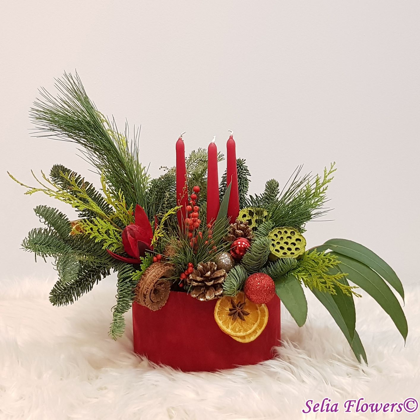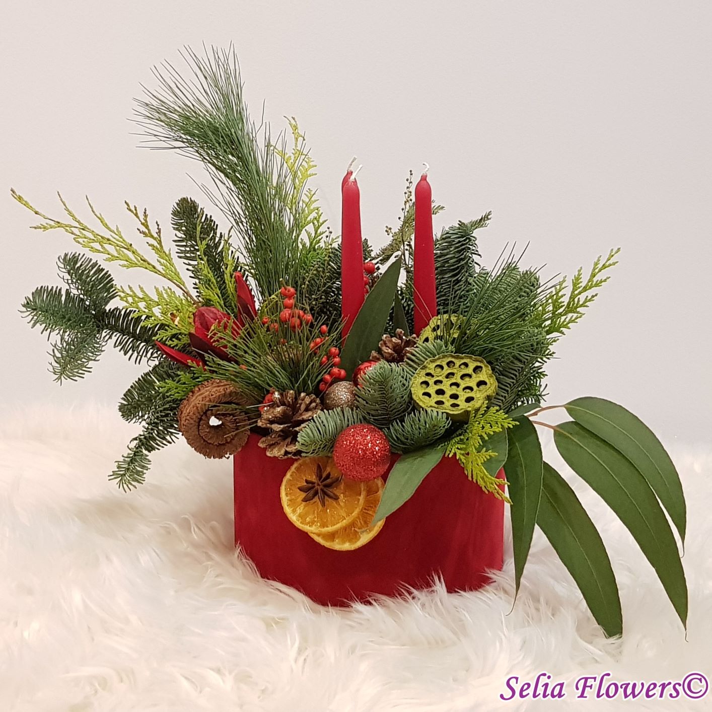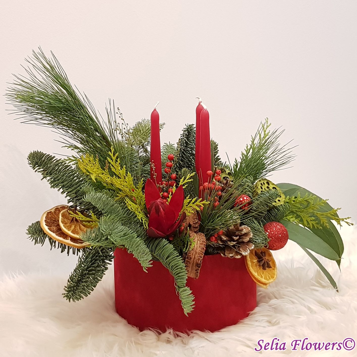 O poveste de Crăciun într-un aranjament rafinat realizat în cutie roșie de catifea din: brad nobilis blue, pin, tuia, crenguțe de eucalypt și ilex. Este accesorizat cu lumânări, felii de portocale deshidratate, batoane de scorțișoară, steluțe de anason, conuri, globulețe și alte accesorii de sezon.