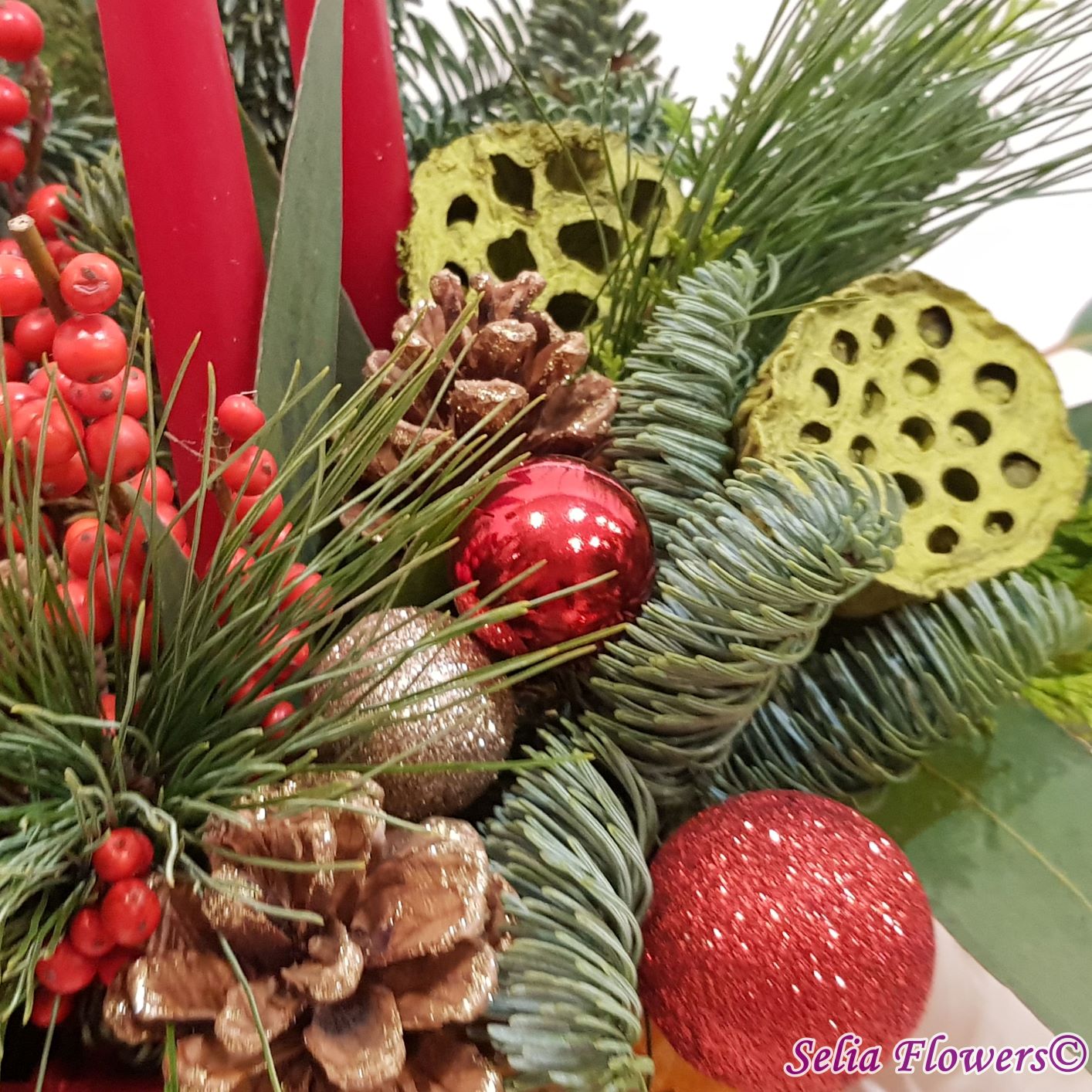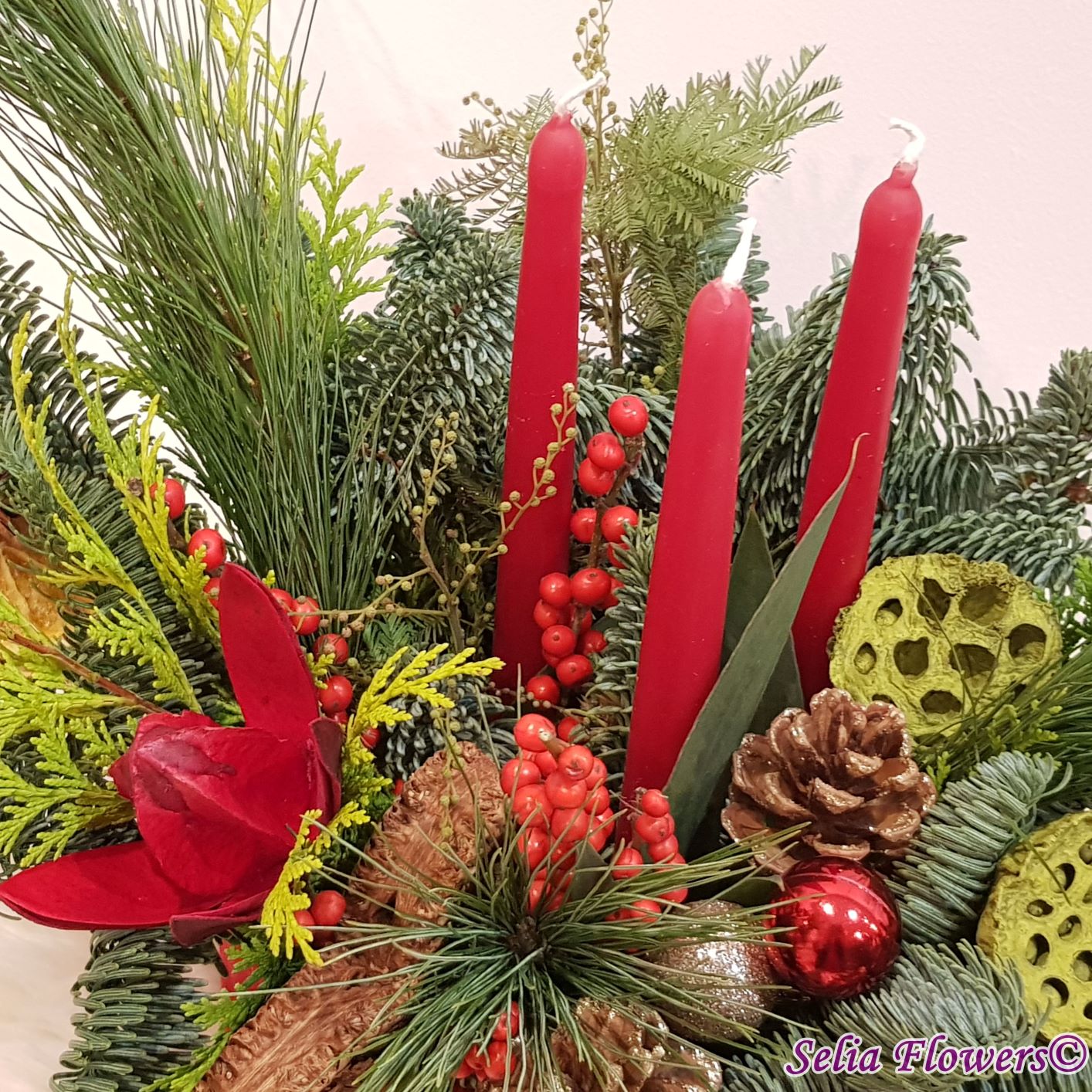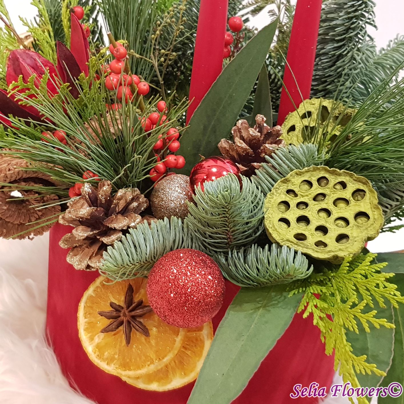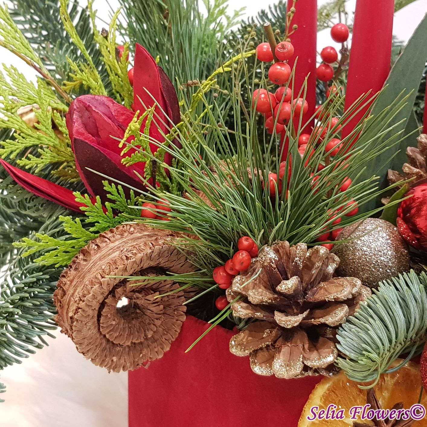 O poveste de Crăciun într-un aranjament rafinat realizat în cutie roșie de catifea din: brad nobilis blue, pin, tuia, crenguțe de eucalypt și ilex. Este accesorizat cu lumânări, felii de portocale deshidratate, batoane de scorțișoară, steluțe de anason, conuri, globulețe și alte accesorii de sezon.