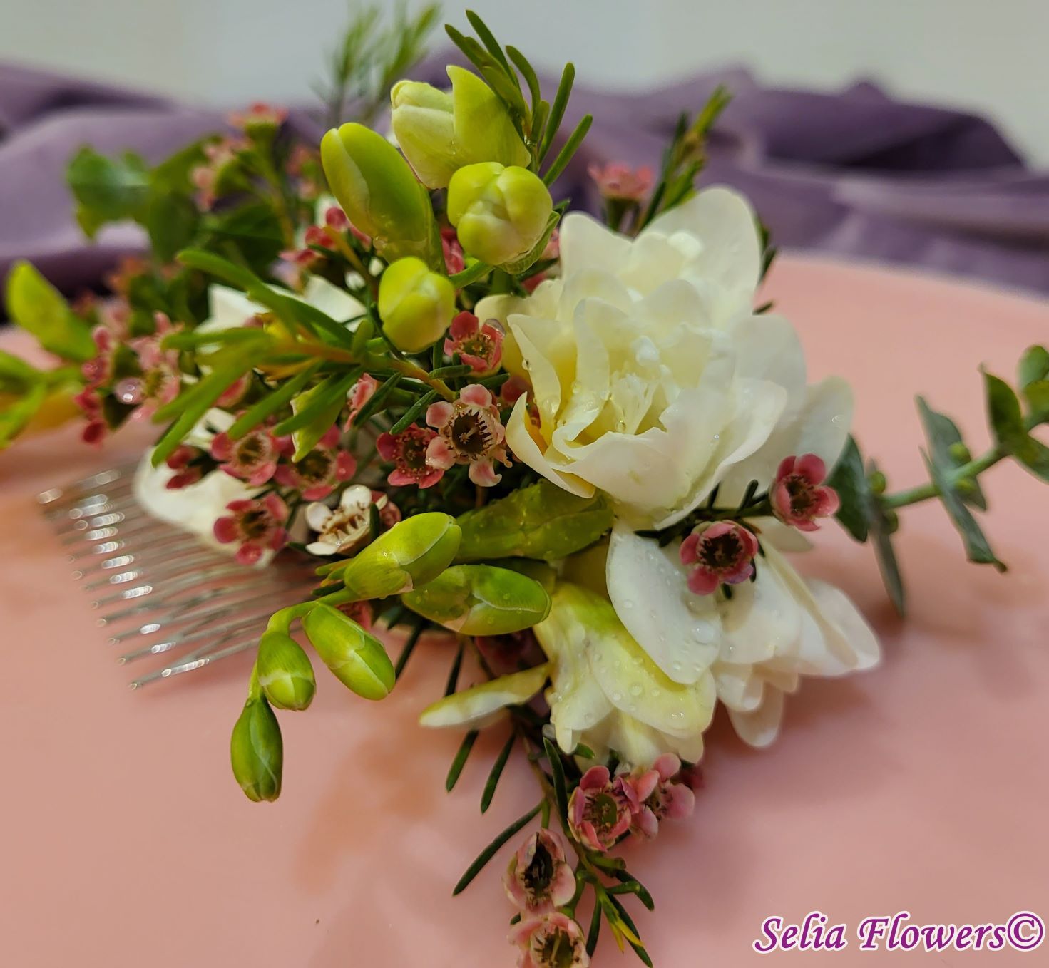 Compoziție florală: frezii, flori de mathiola, wax flowers, eucalipt.