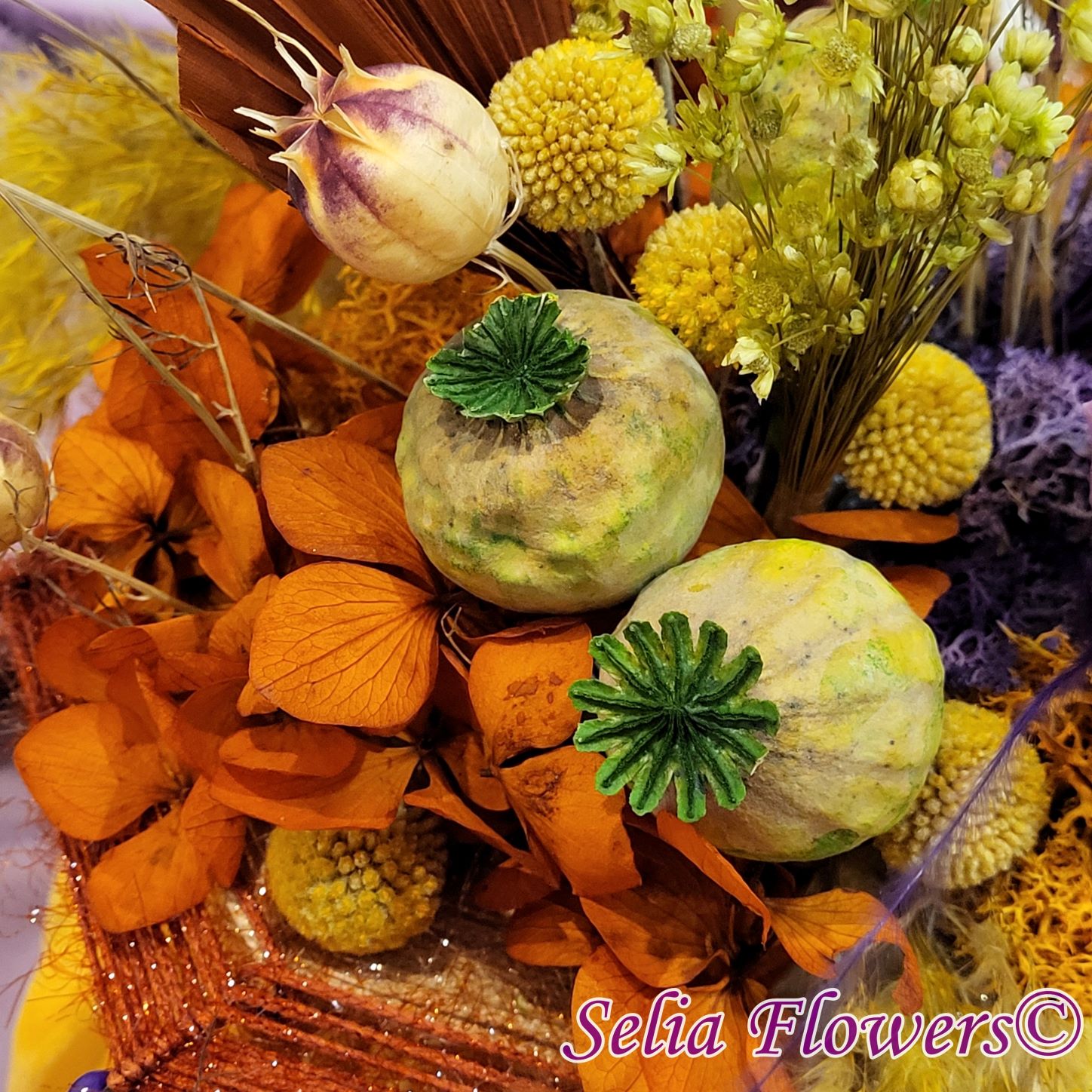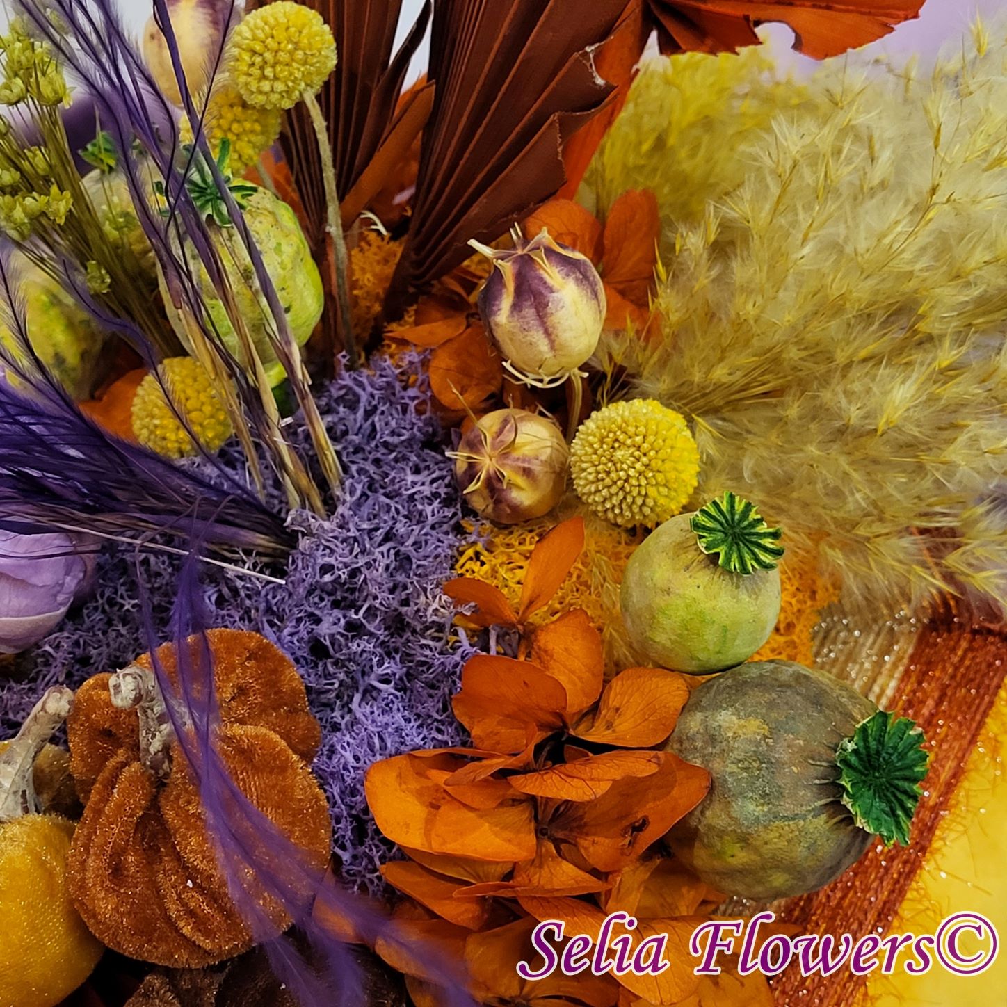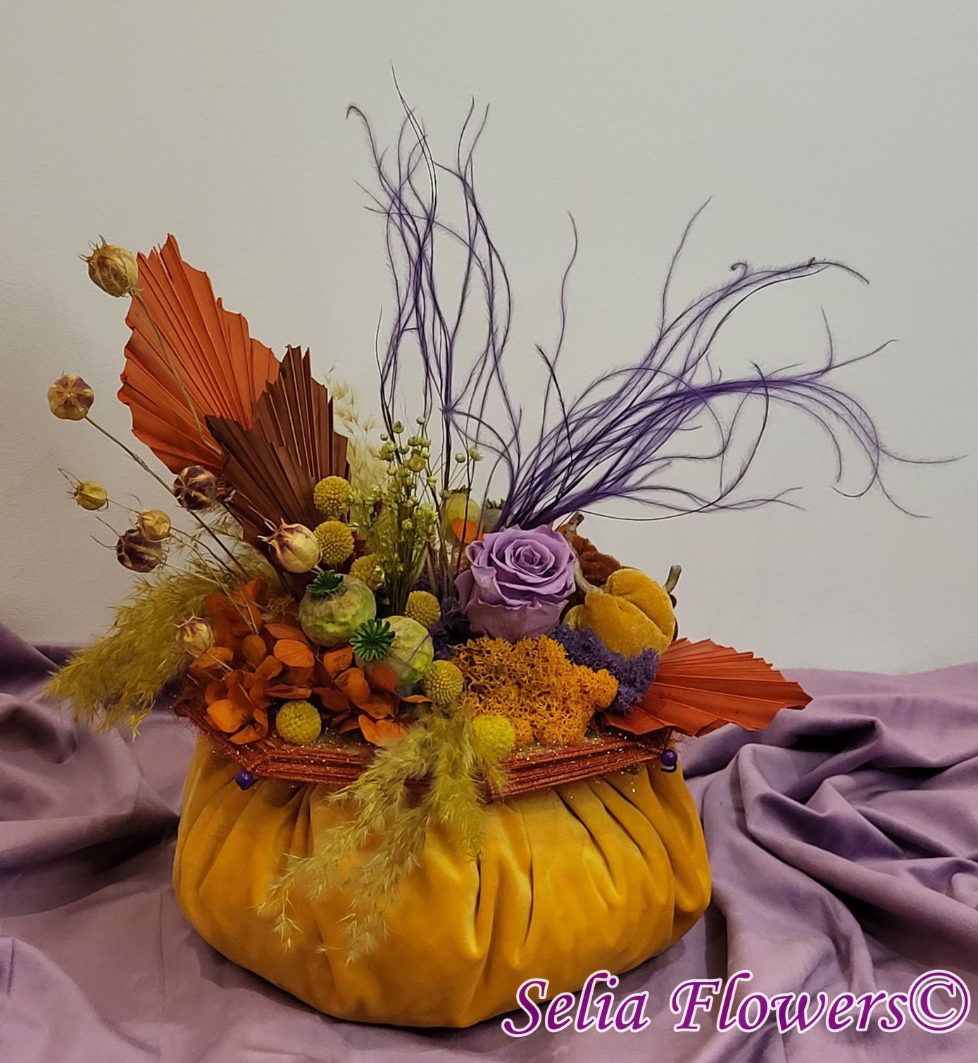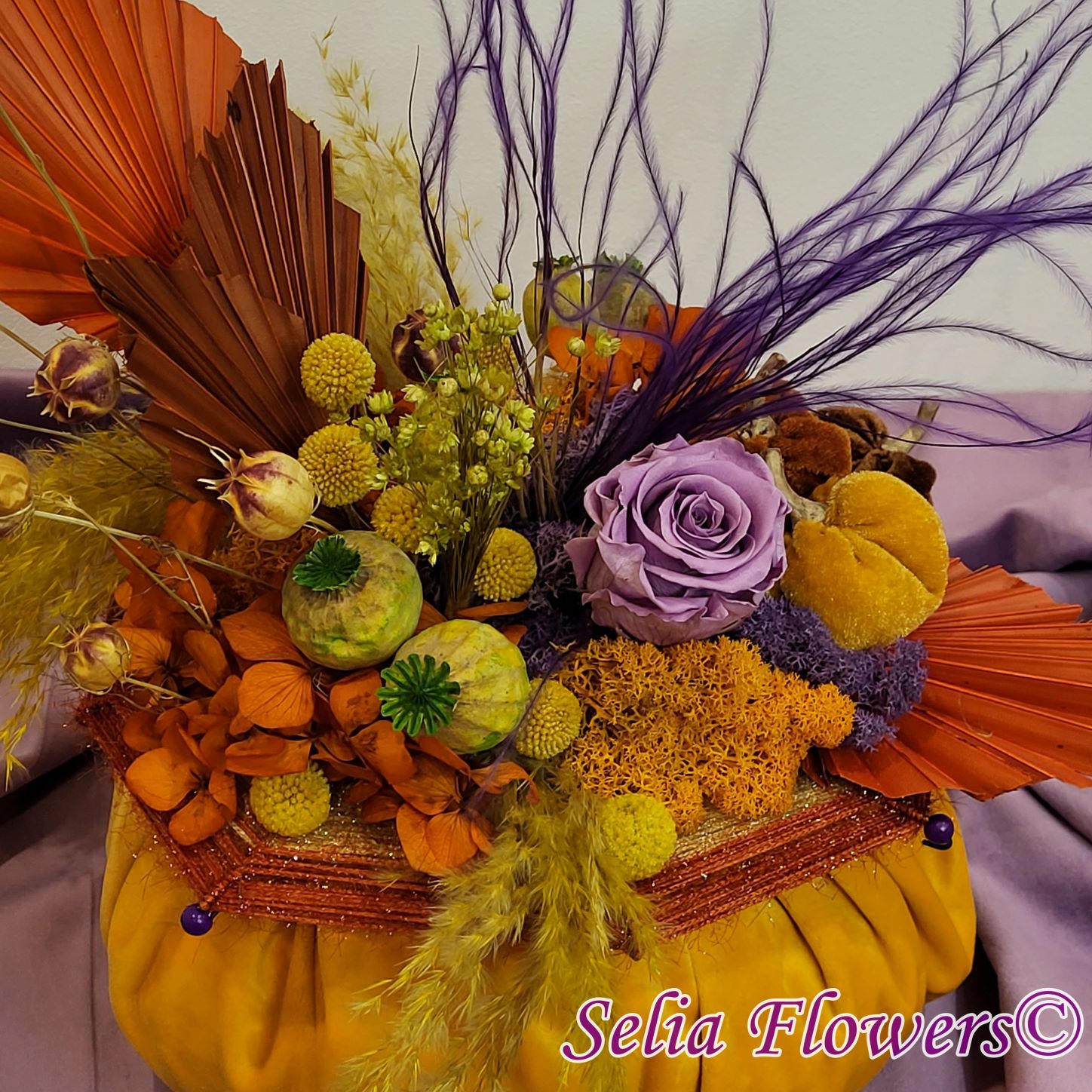 Un dovleac handmade, realizat în cromatica toamnei. Are o structură spiderweb construită și este decorat cu flori naturale permanente: hortensie și trandafir criogenate, craspedia, stipa, nigella, capsule de mac și iarbă de pampas. Este accesorizat cu licheni naturali stabilizati, minidovleci din material textil și frunze de palmier.