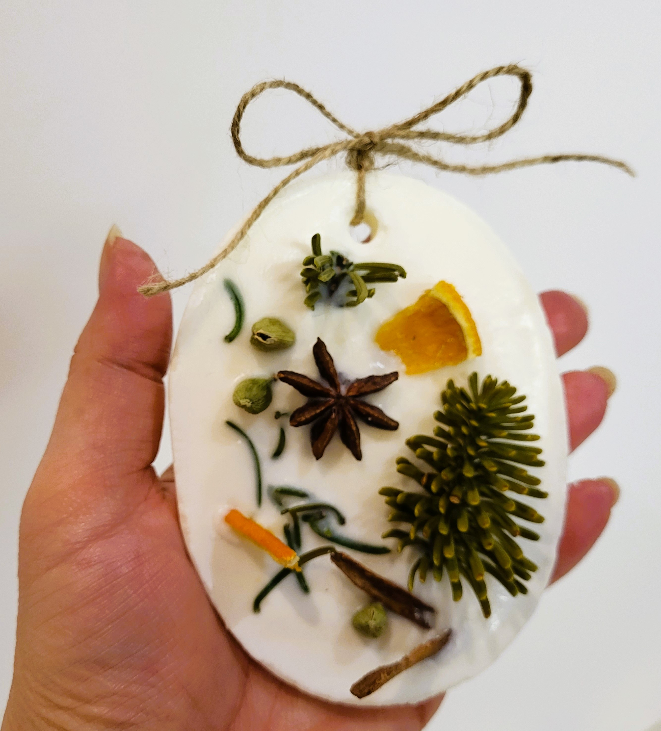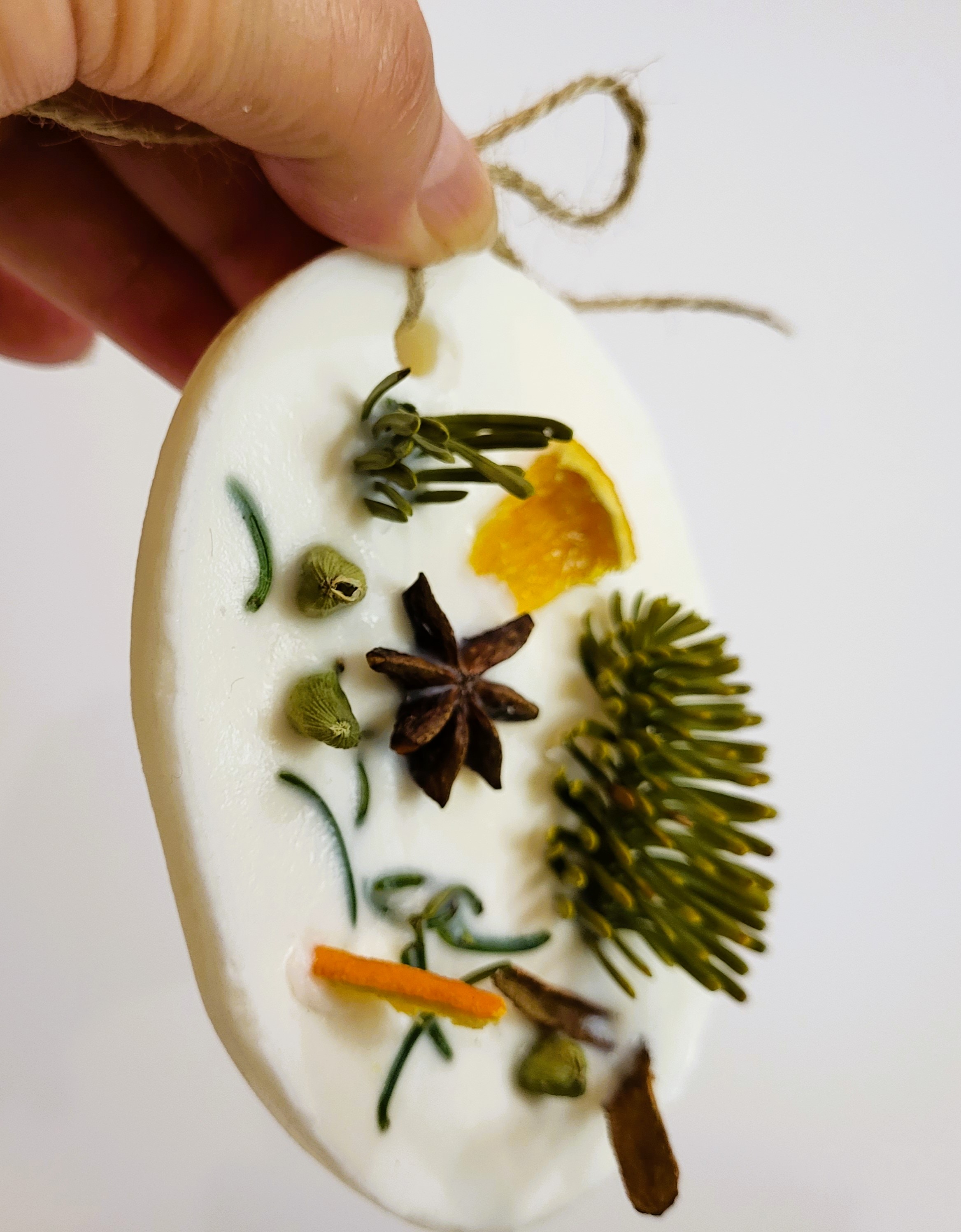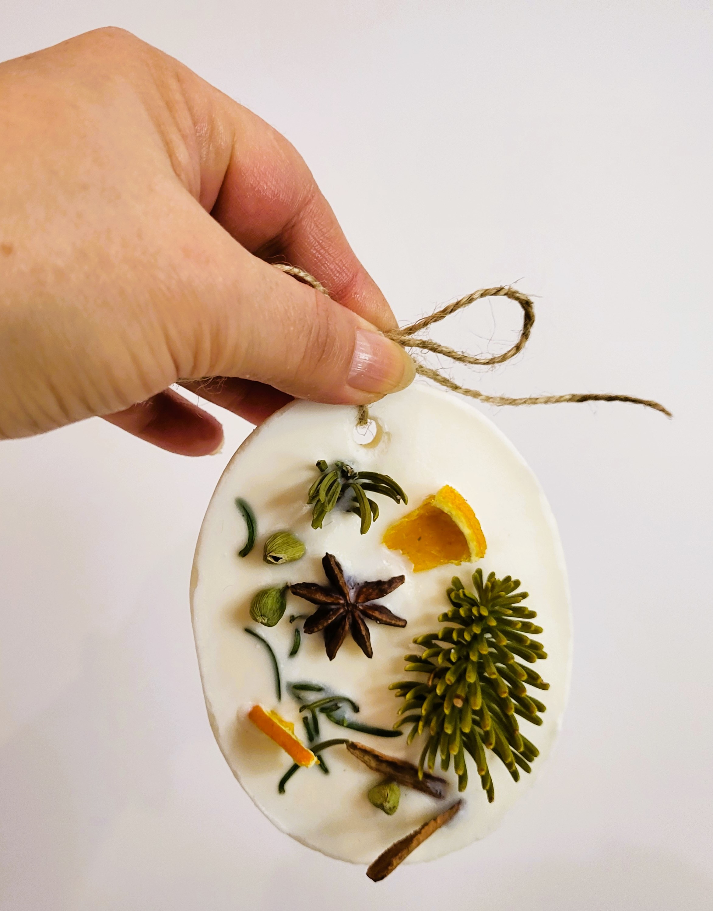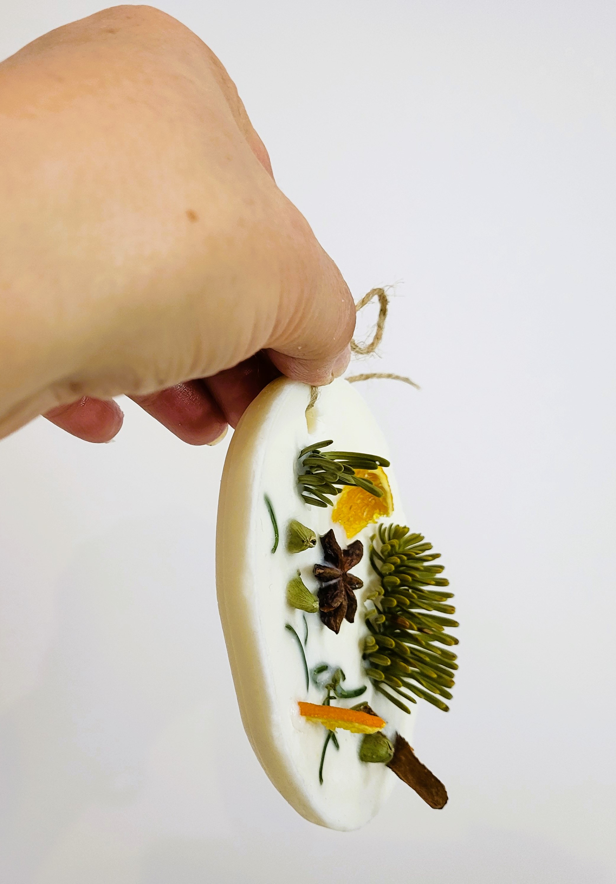 Tableta este turnată manual din ceară de soia de calitate premium. Este parfumată cu uleiuri pure organice de pin, brad, scorțișoară și portocale și este decorată cu crenguțe de brad și mirodenii specifice Sărbătorilor de iarnă (cardamon, scorțișoară, cuișoare, portocală deshidratata). Are o greutate de aproximativ 70 gr.