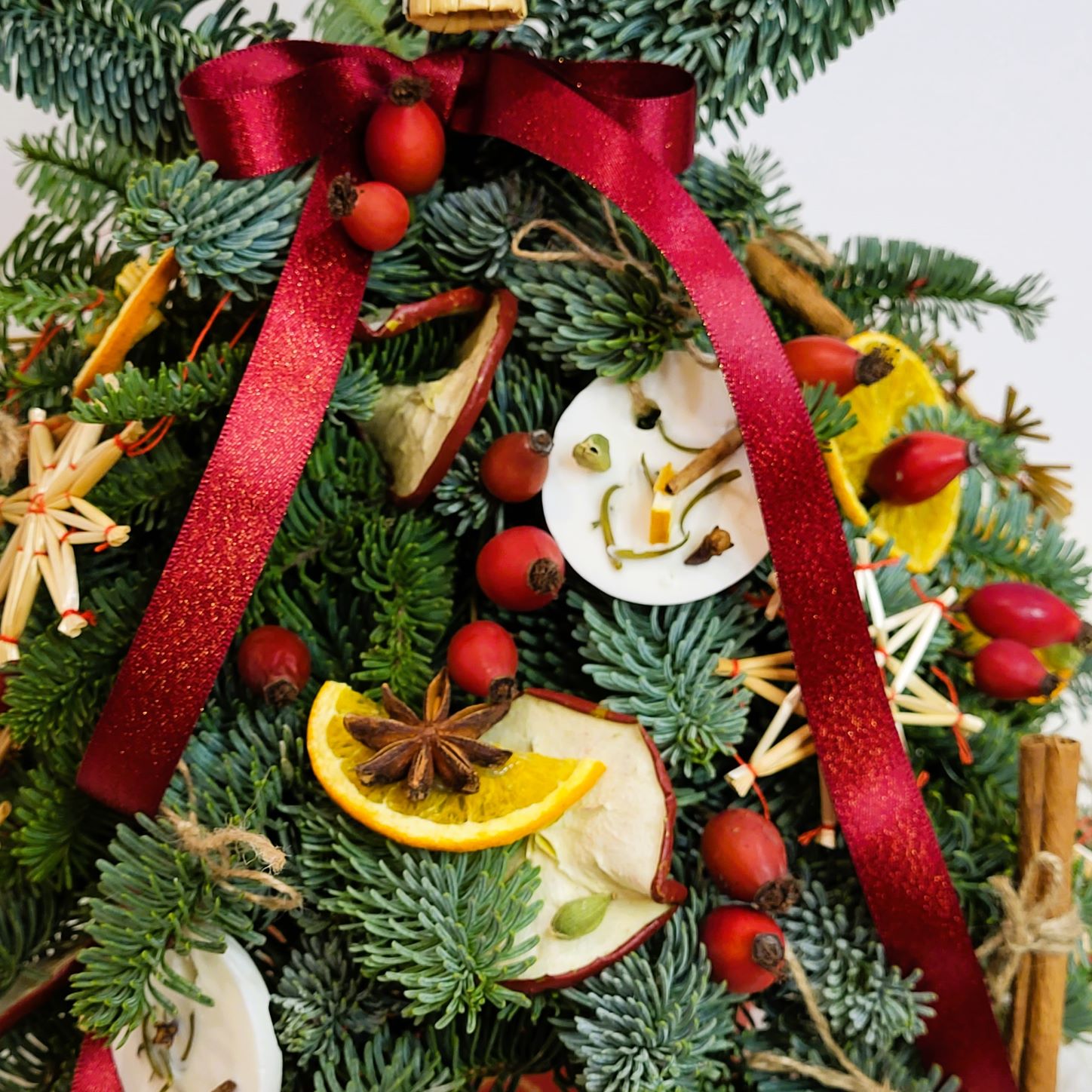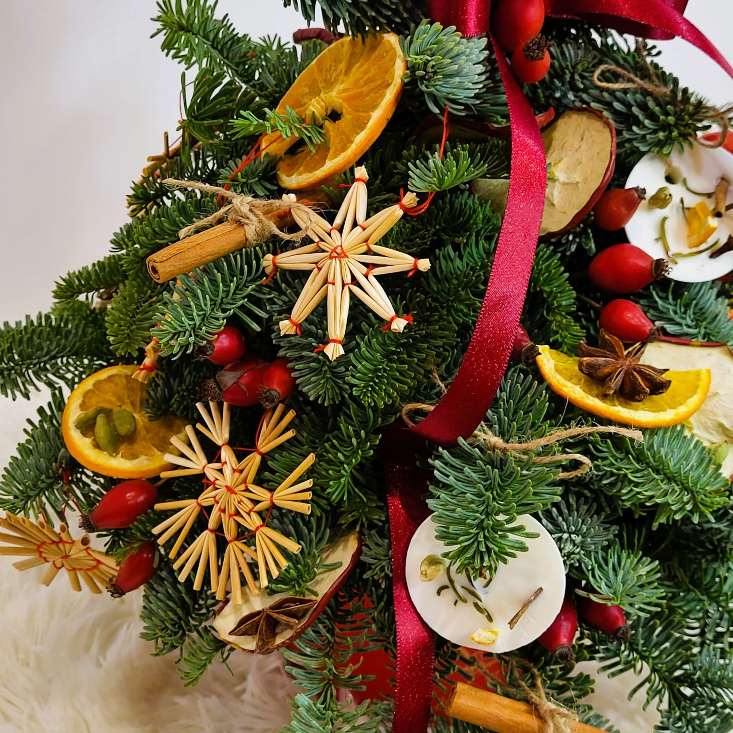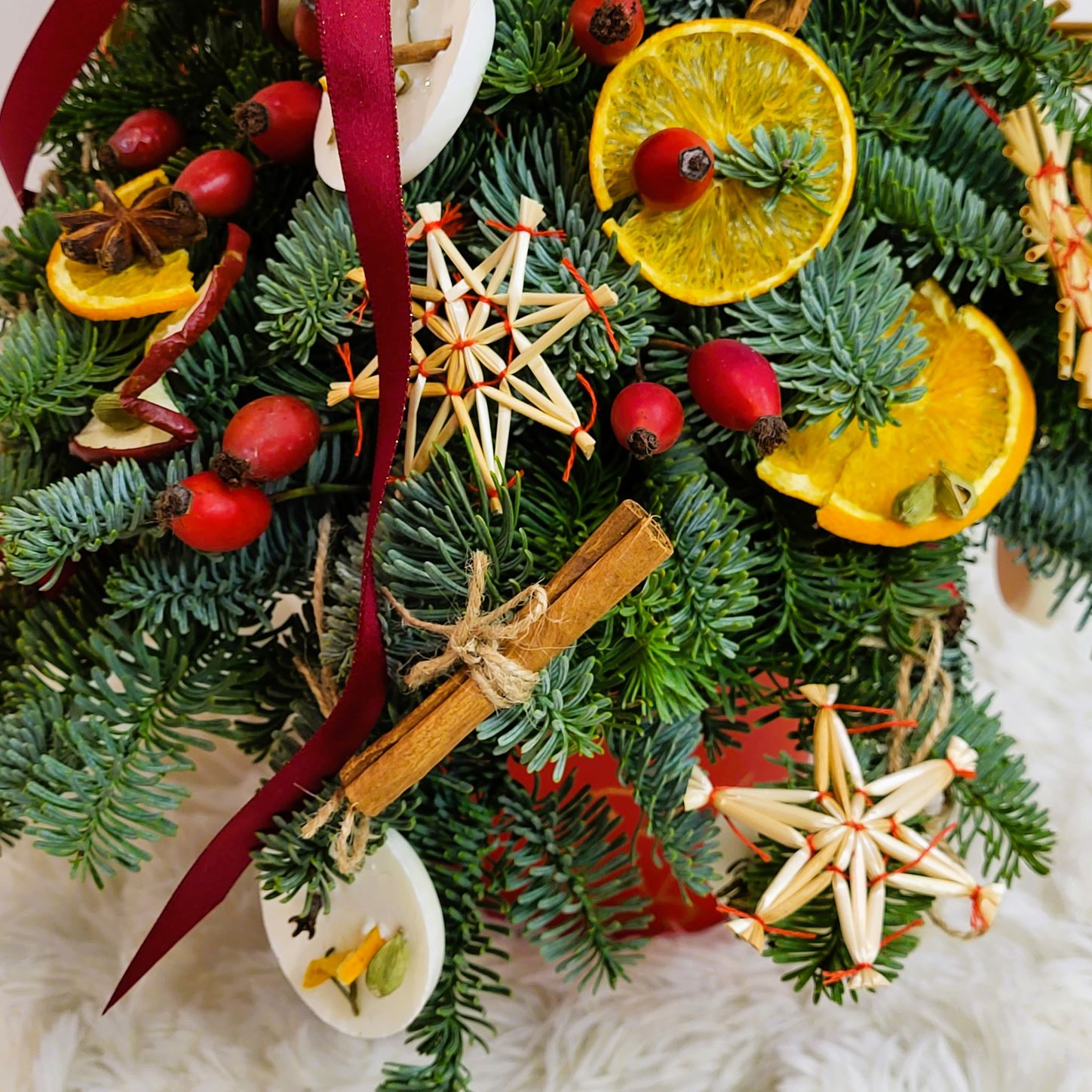 Este accesorizat cu globulețe parfumate din ceară de soia, turnate manual în atelier, elemente decorative aromate – batoane de scorțișoară, felii de fructe deshidratate și anason, precum și alte elemente construite din materiale naturale.