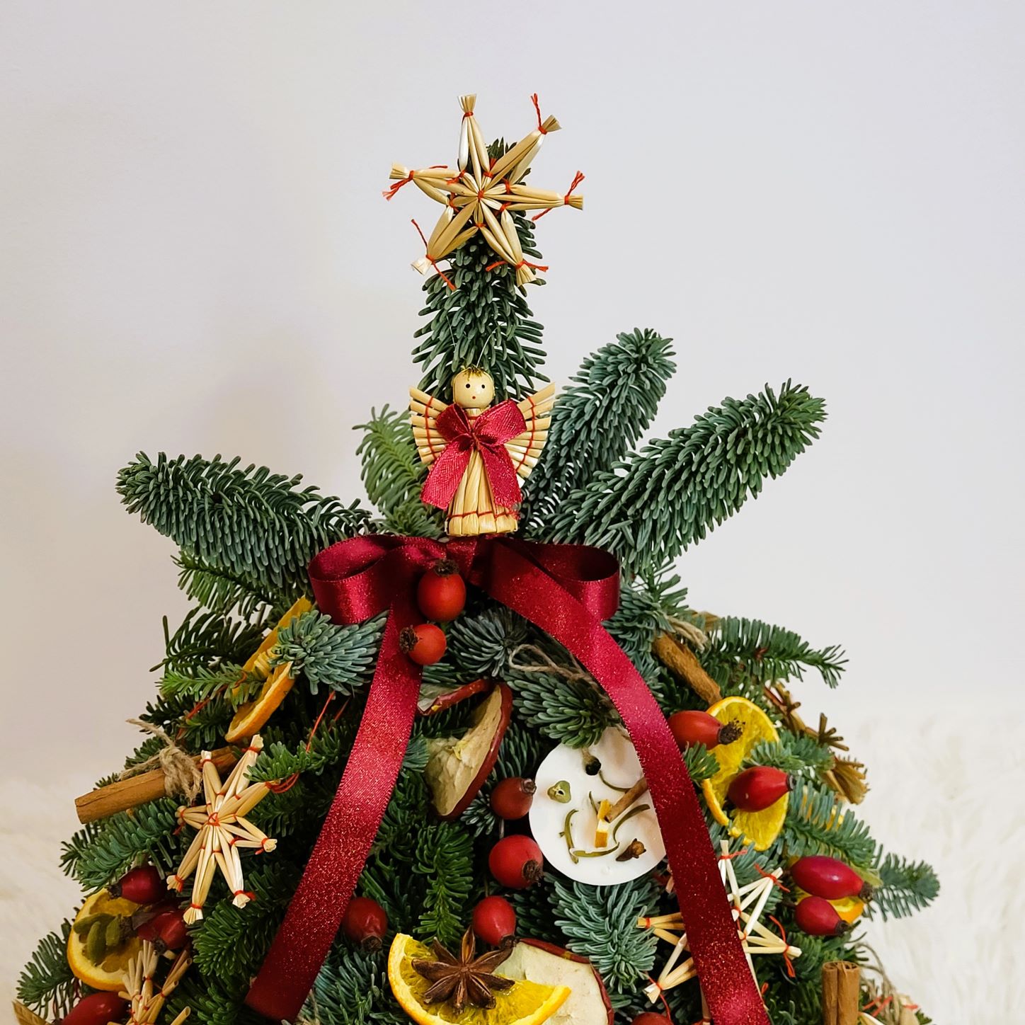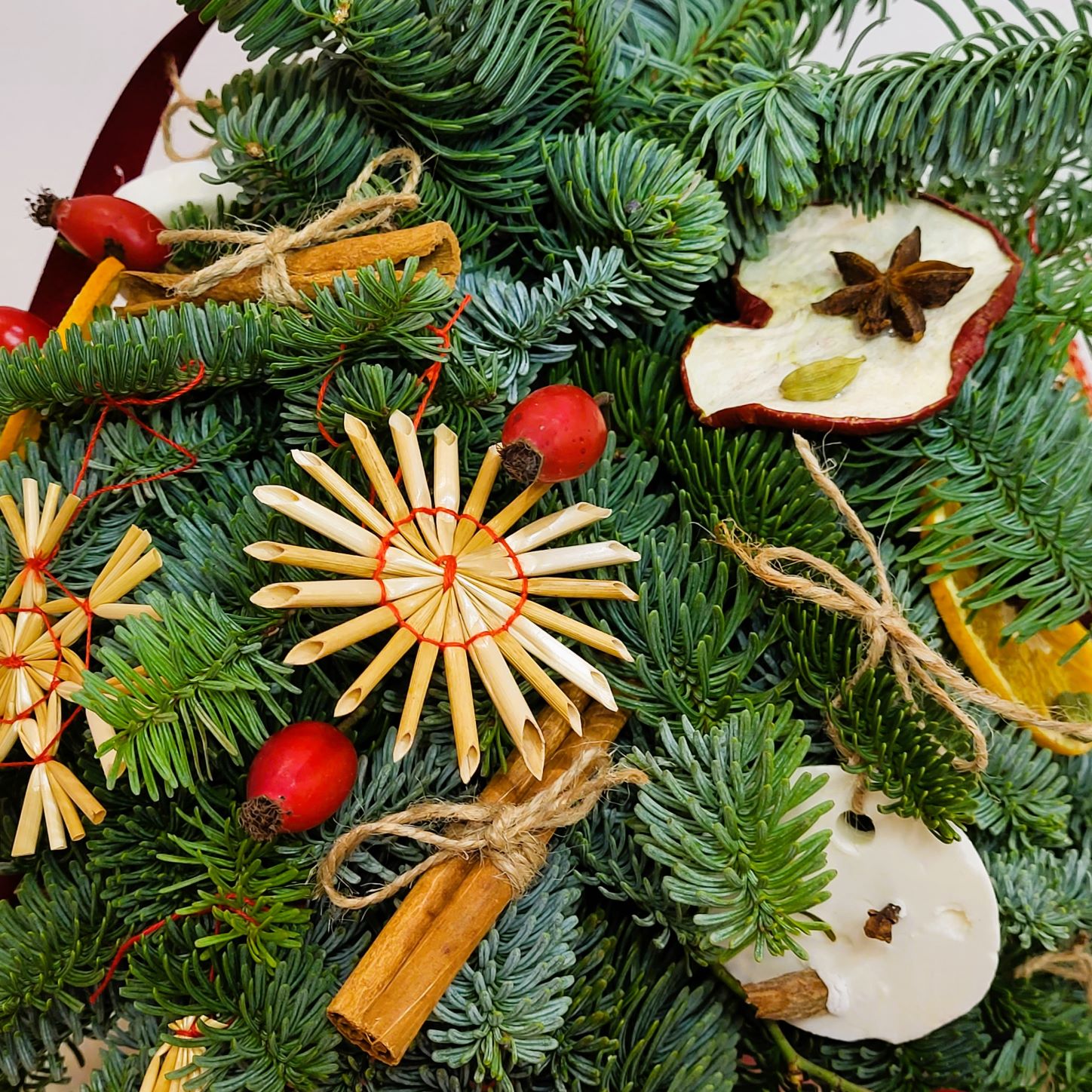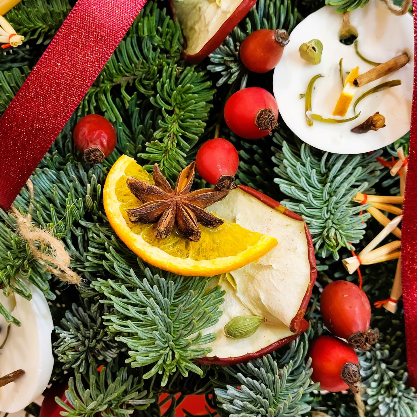 Este accesorizat cu globulețe parfumate din ceară de soia, turnate manual în atelier, elemente decorative aromate – batoane de scorțișoară, felii de fructe deshidratate și anason, precum și alte elemente construite din materiale naturale.
