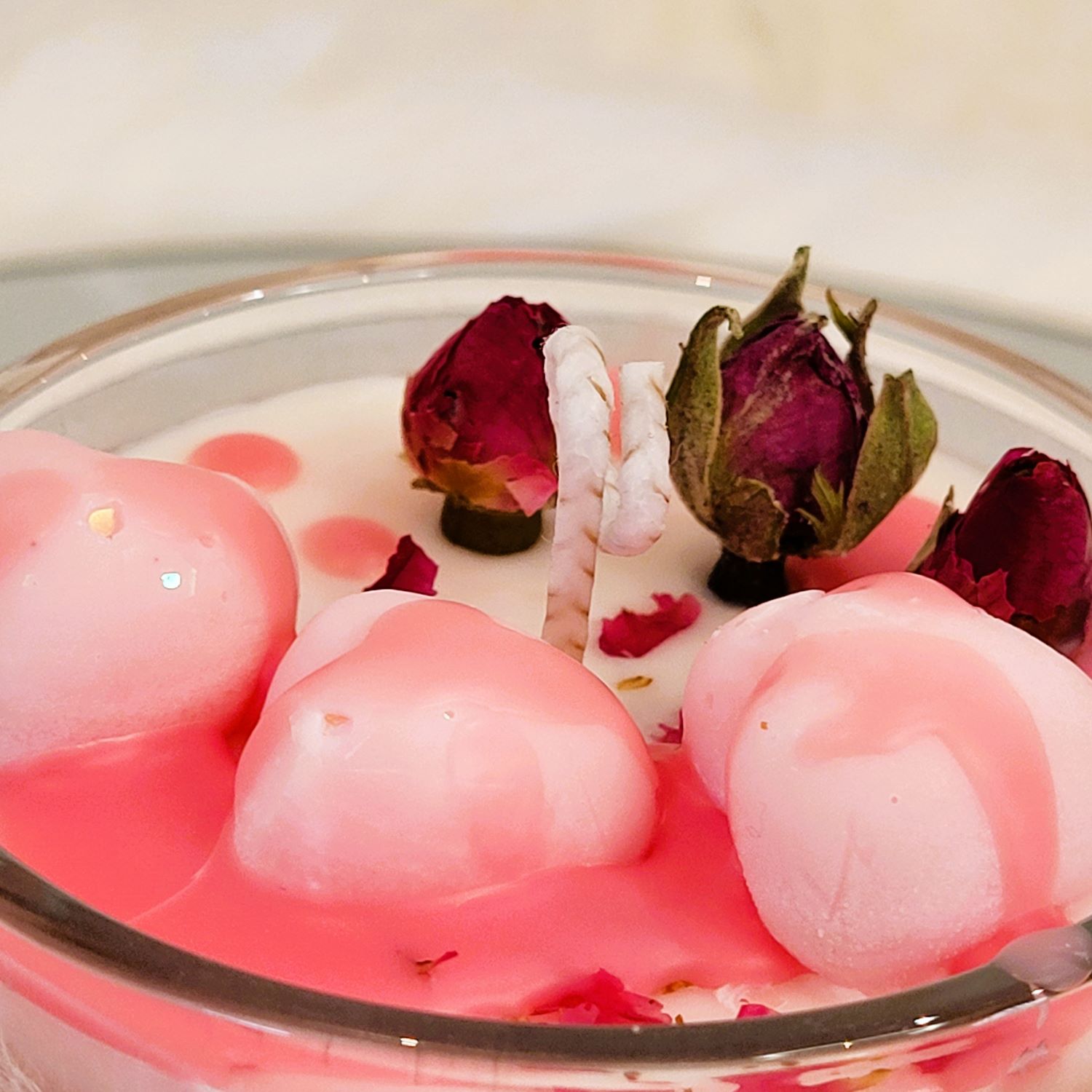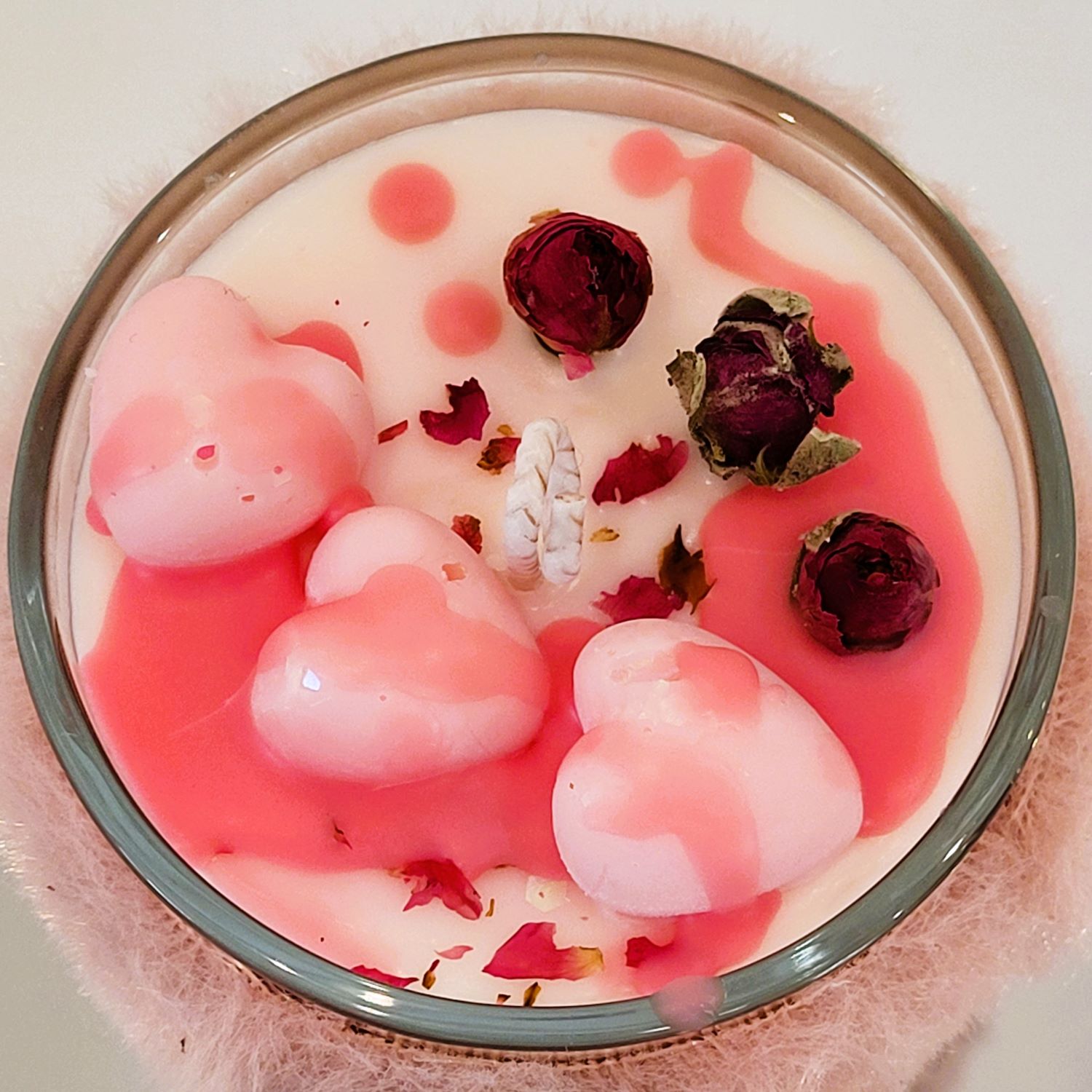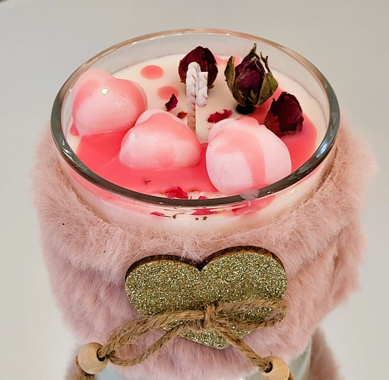 Lumânare handmade din ceară de soia, turnată în recipient de sticlă prevăzut cu blăniță și accesoriu inimioară. Este decorată cu boboci de trandafir și inimioare de culoare roz și îmbogățită cu arome de vanilie, iasomie și spring floral. Greutate, 275 g.