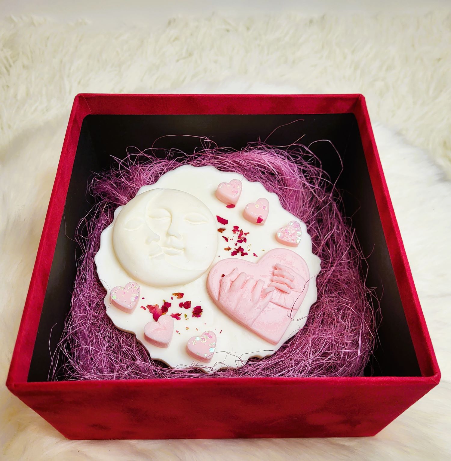 O tabletă delicată realizată din ceară de soia și accesorizată cu elemente sugestive din ceară. Poartă cu ea un mix de arome de Velvet Rose&Yasmine, Roasted Coffee și Spring floral. Ambalată într-o cutie de catifea, devine un dar special și inspirat pentru cineva drag.