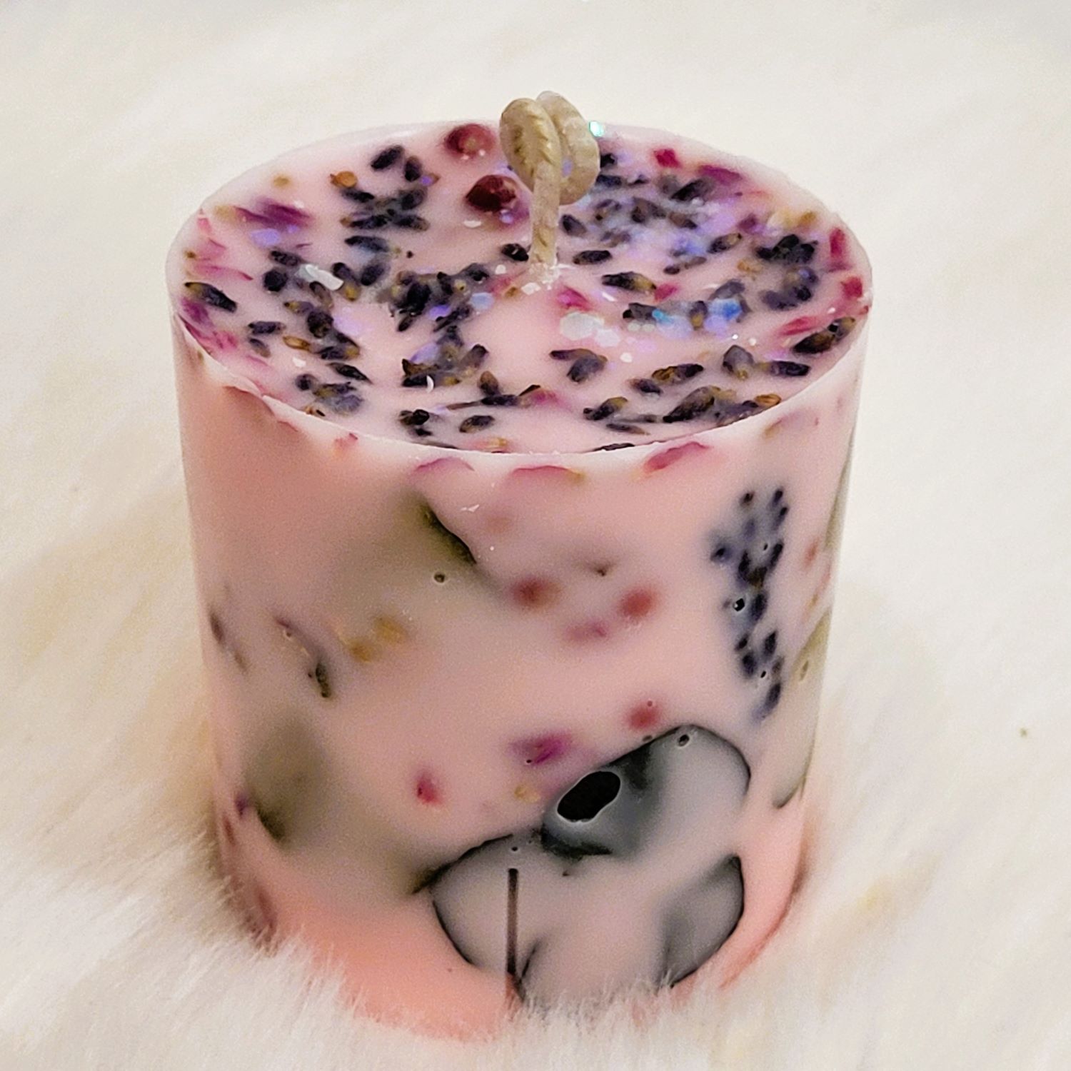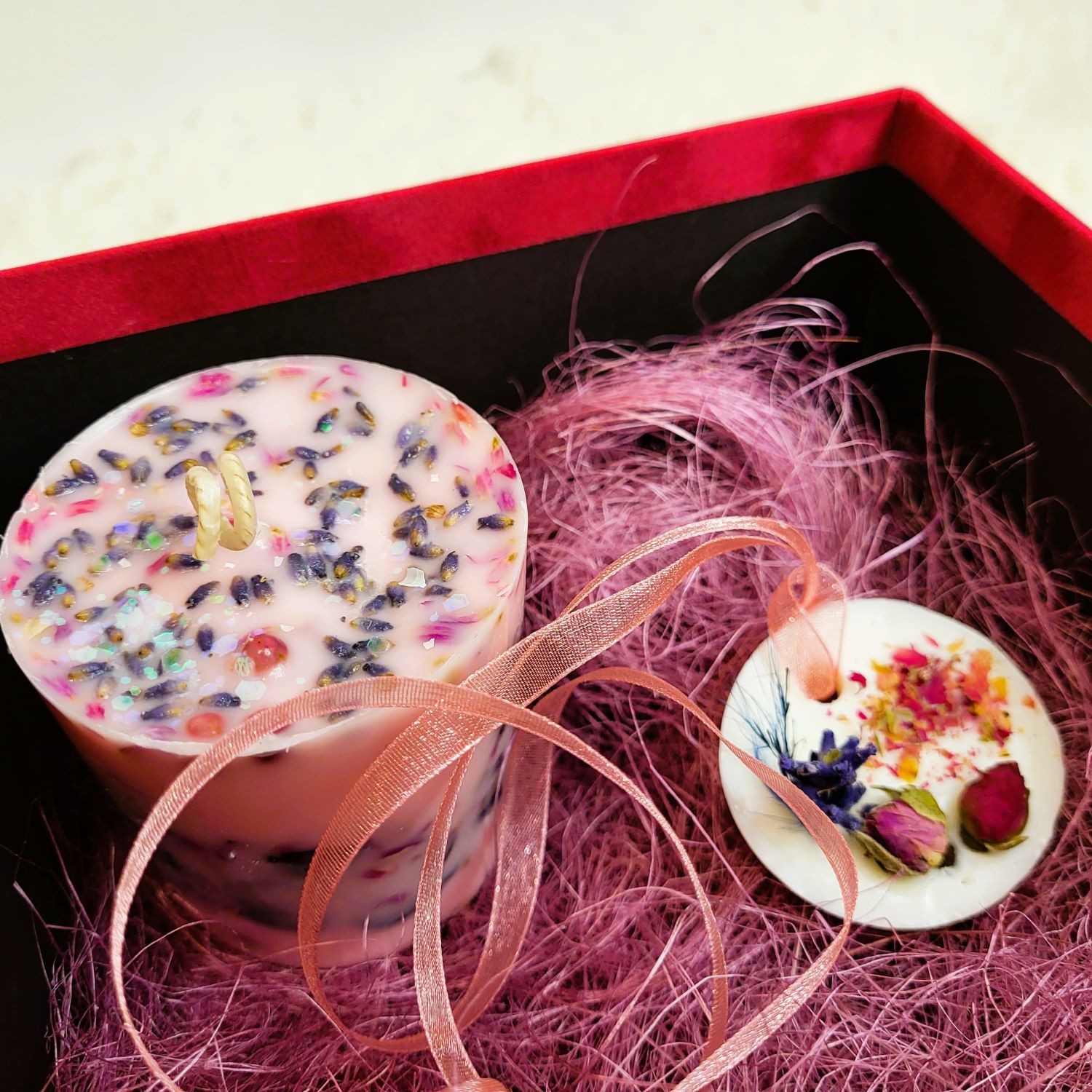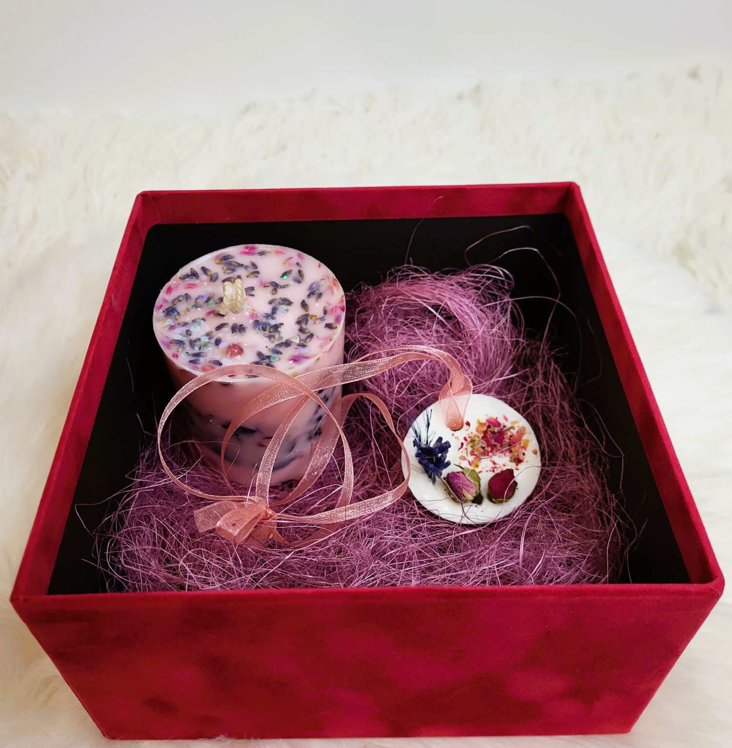 Cutia conține o lumânare handmade din ceară de soia, cu flori de lavandă și hortensie și arome de vanilie și iasomie - greutate, 175 g, precum și o amuletă florală parfumată - greutate, 19-11 g.