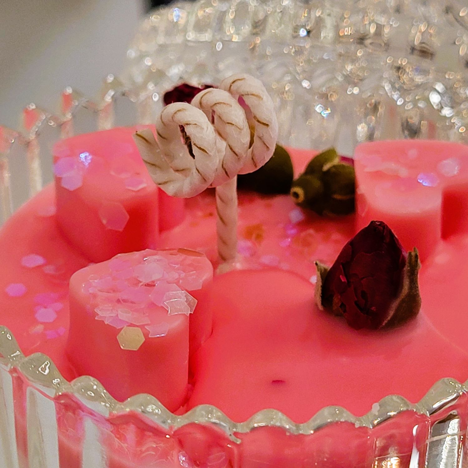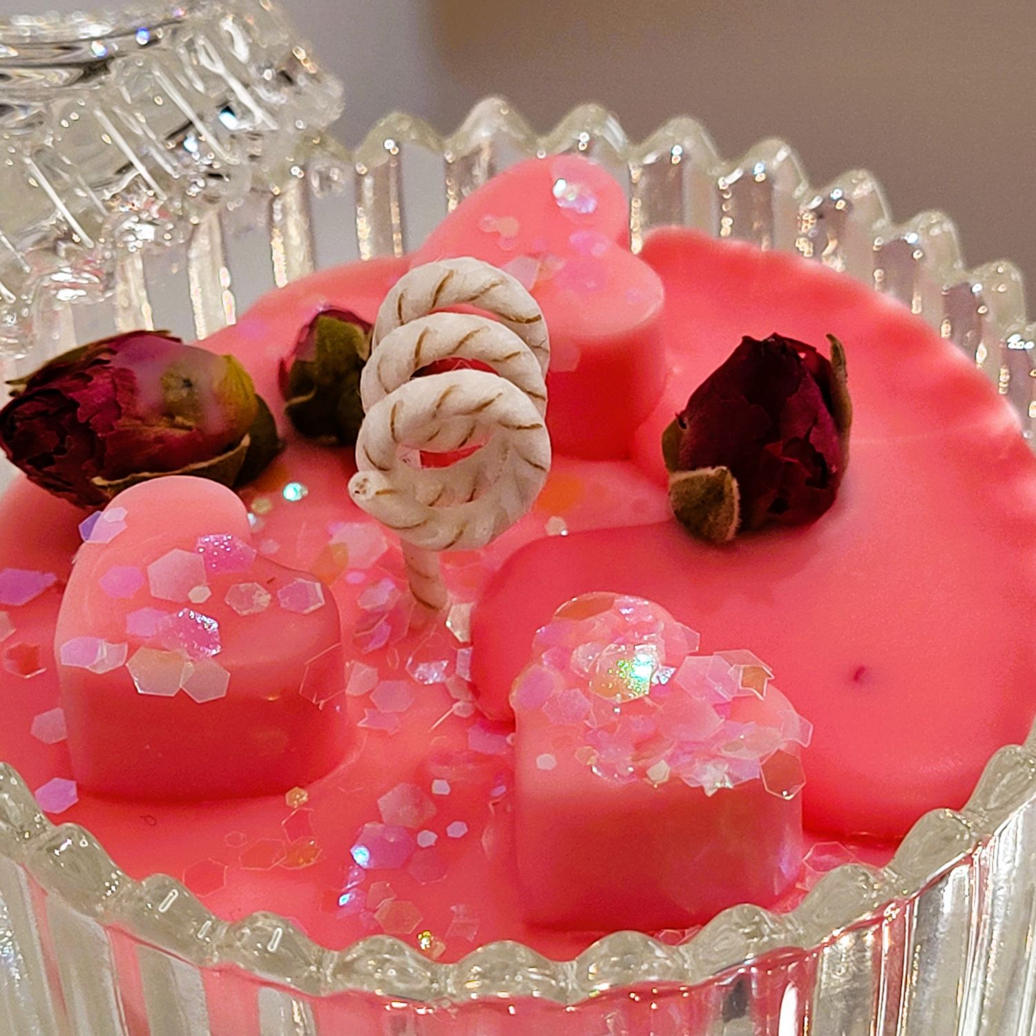 Lumânare parfumată handmade din ceară de soia, turnată în recipient ceramic tip bombonieră. Este decorată cu inimioare din ceara si boboci de trandafiri și îmbogățită cu arome de Velvet Rose&Yasmine, Roasted Coffee și Spring floral. Greutate, 110 g.