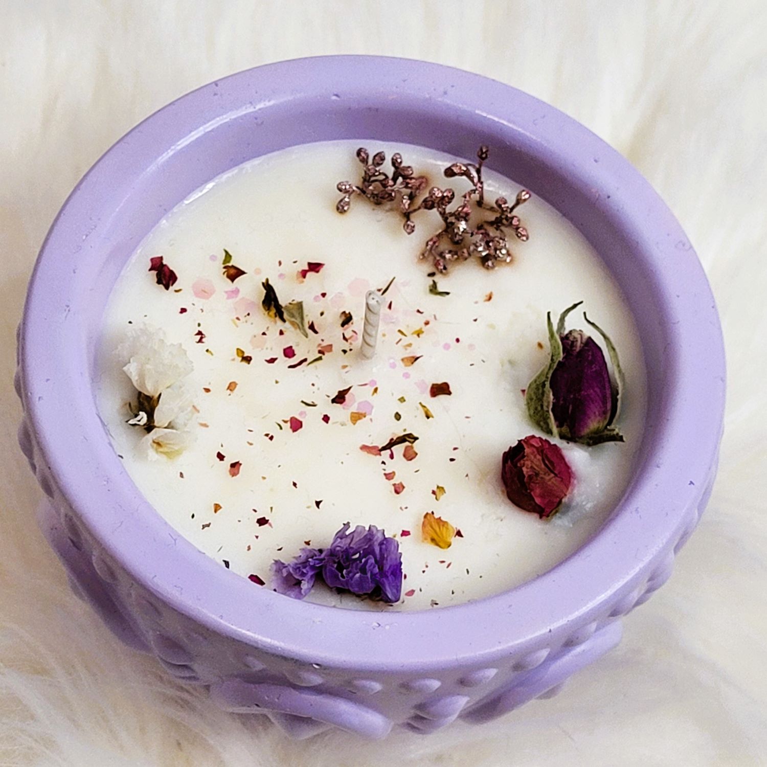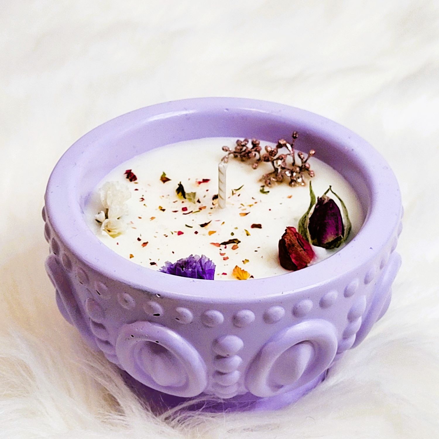 Lumânare parfumată handmade din ceară de soia, turnată în recipient ceramic de culoare lila. Este decorată cu boboci și petale mărunțite de trandafir și flori uscate. Este îmbogățită cu arome de Velvet Rose&Yasmine, Roasted Coffee și Spring floral. Greutate, 150 g.