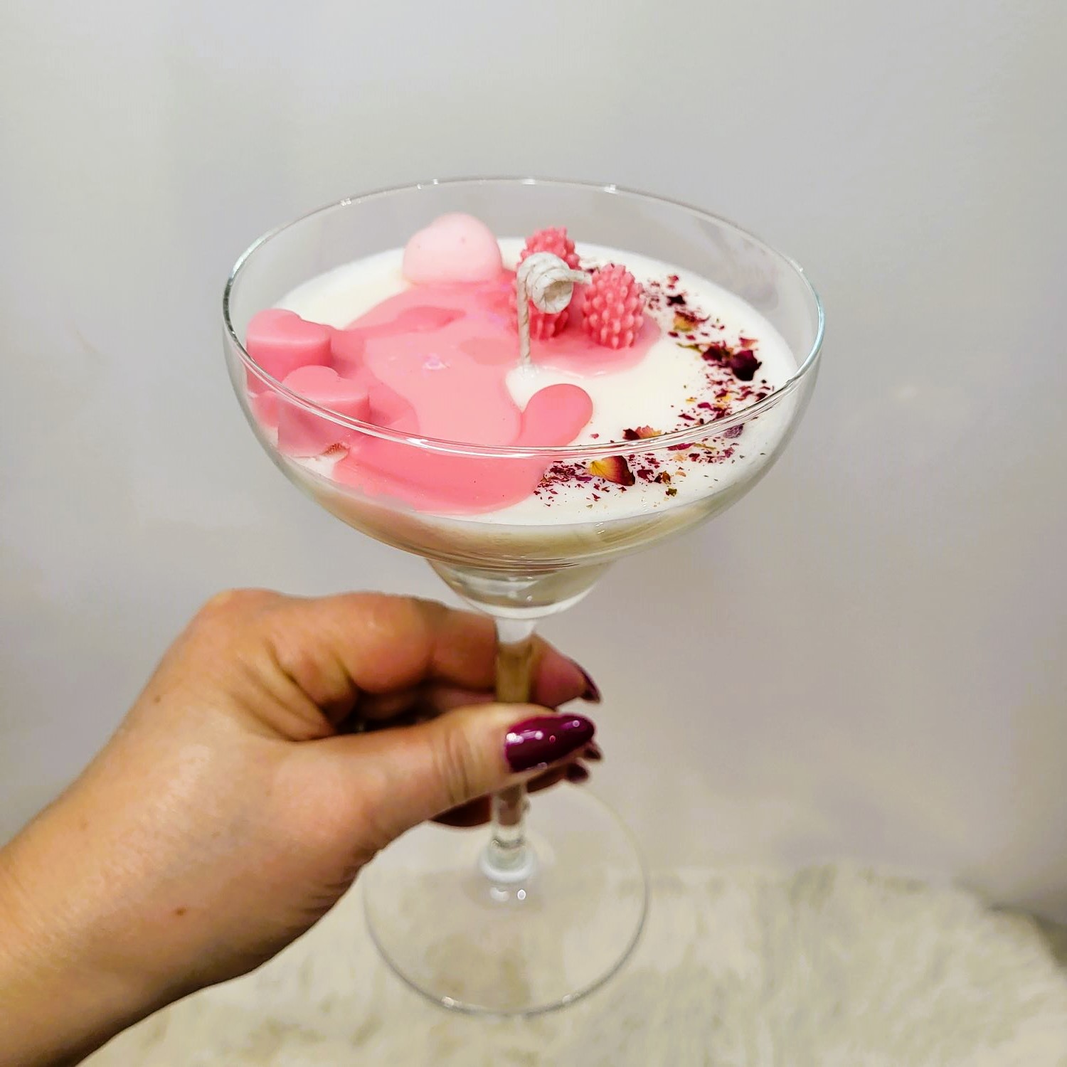 Pentru o persoană specială, un dar pe măsură! O cupă de șampanie; roz, cu multe inimioare, petale de trandafir și frăguțe. Alături de mix-ul de arome - Velvet Rose&Yasmine, Roasted Coffee și Spring floral – devine o experiență de neuitat. Greutate, 285 g.