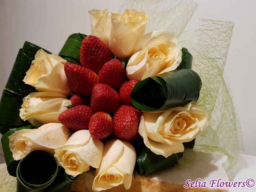 Daca vrei sa o surprinzi si sa o si rasfeti in acelasi timp, ai gasit buchetul perfect, realizat din 9 trandafiri, capsuni proaspete, aspidistra si accesorii.