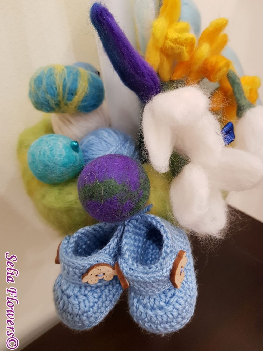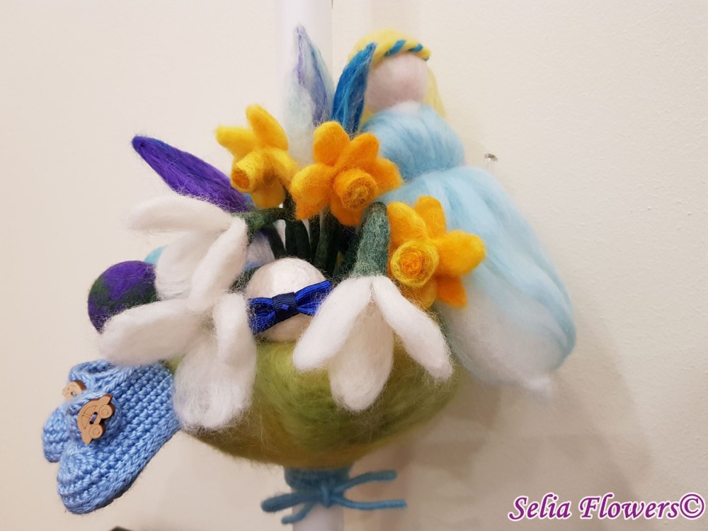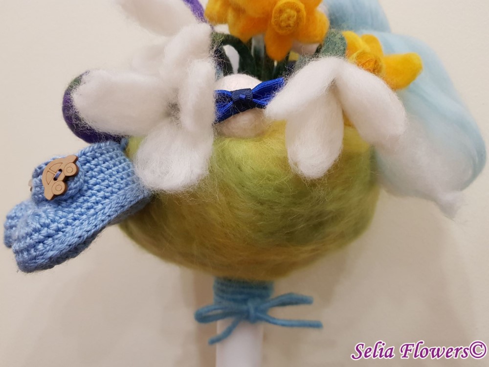 Lumanare de botez pentru baietel, realizata handmade pe semisfera imbracata cu lana, cu flori si ghemulete de lana, ghemulete si botosei din material acril si zana din lana.