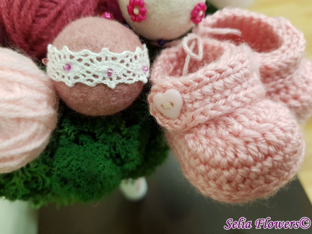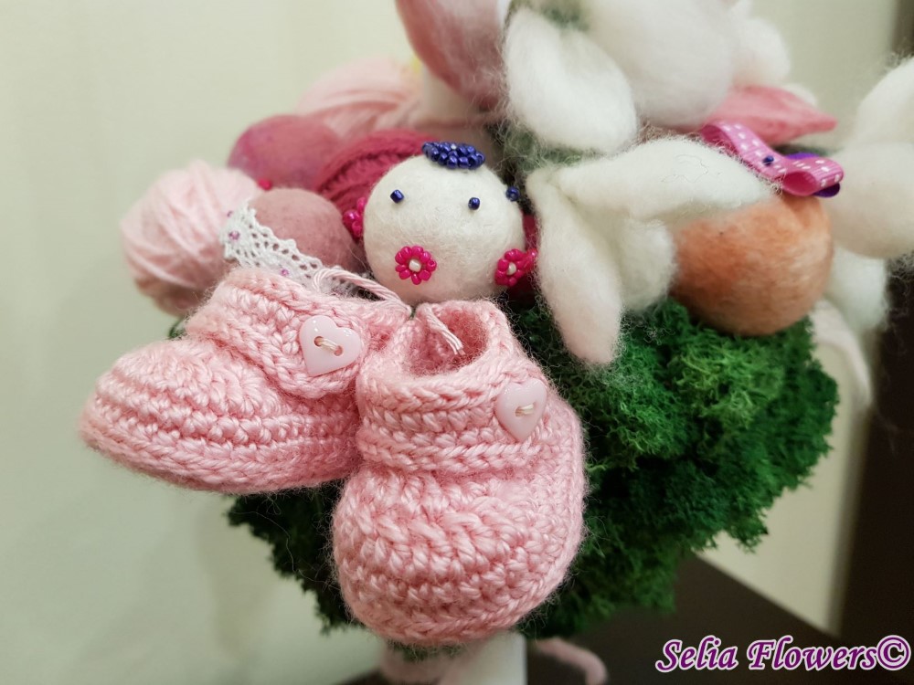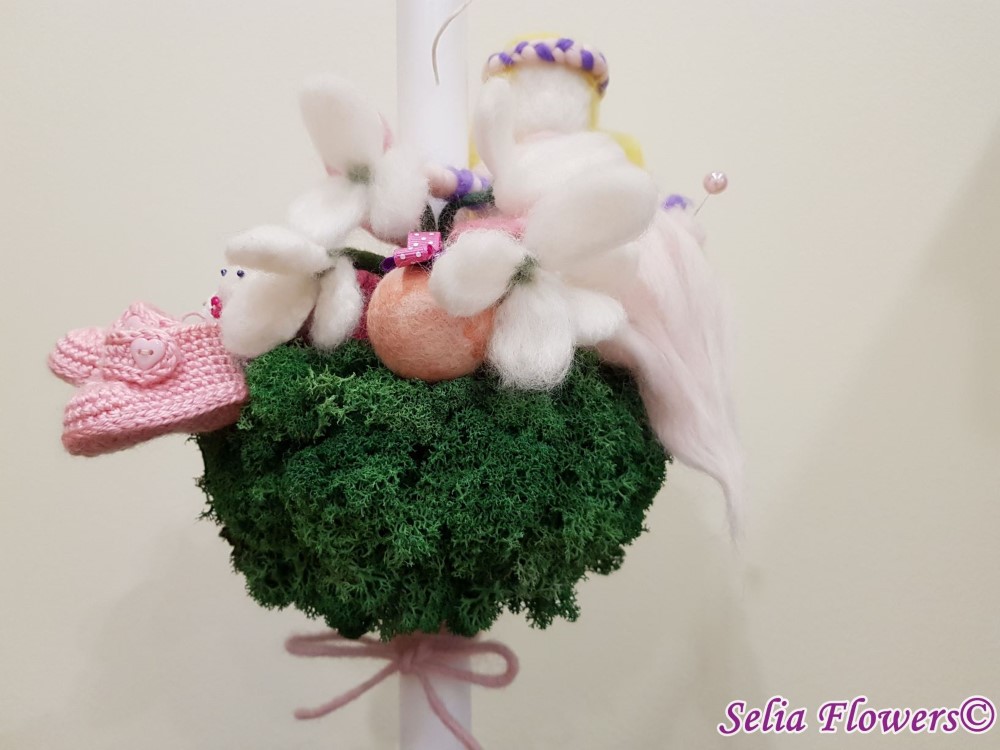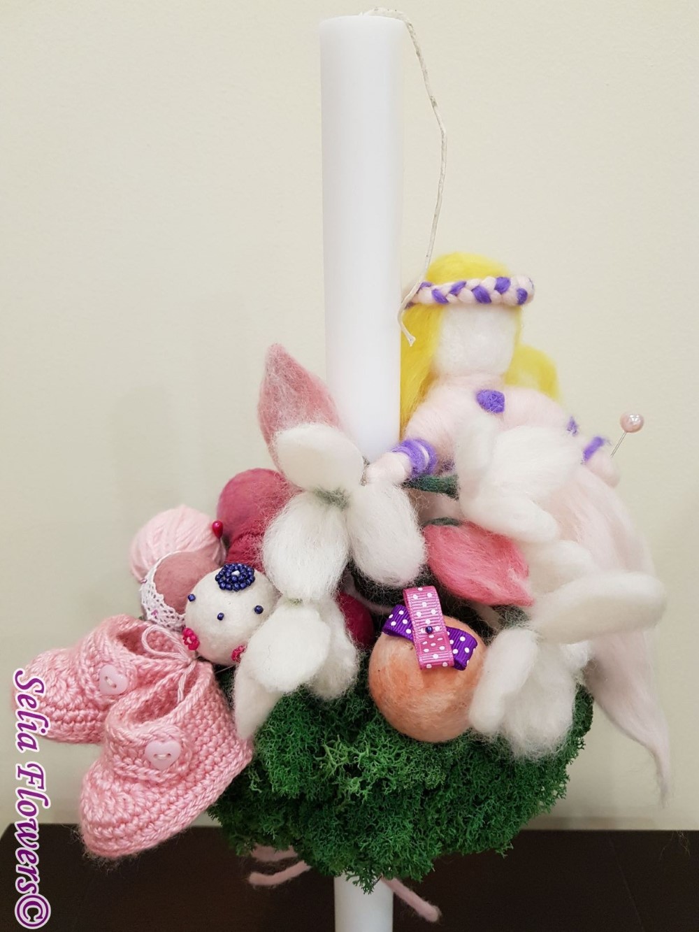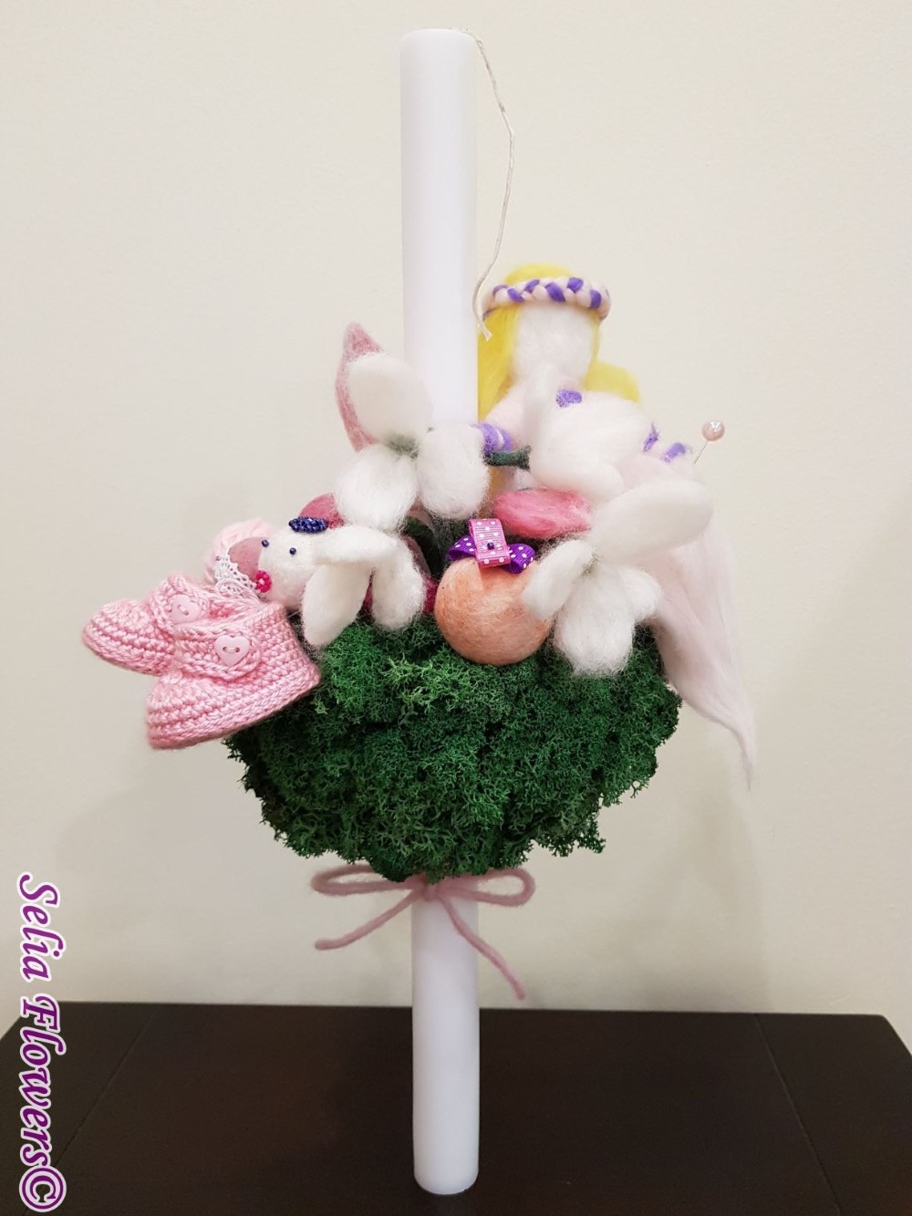Lumanare de botez pentru fetita, realizata handmade pe semisfera imbracata cu licheni stabilizati, cu flori si ghemulete de lana, ghemulete si botosei din material acril si zana din lana.