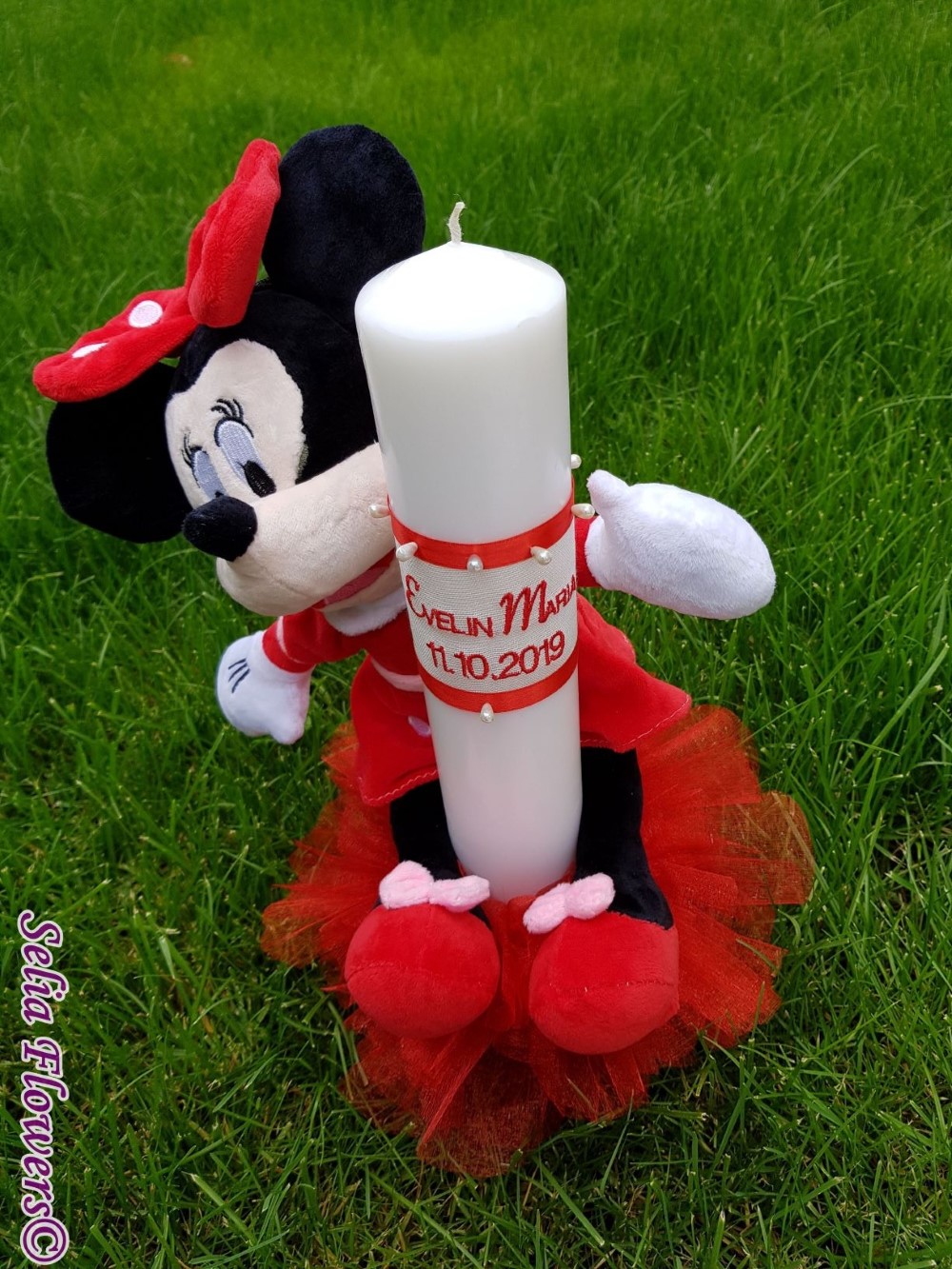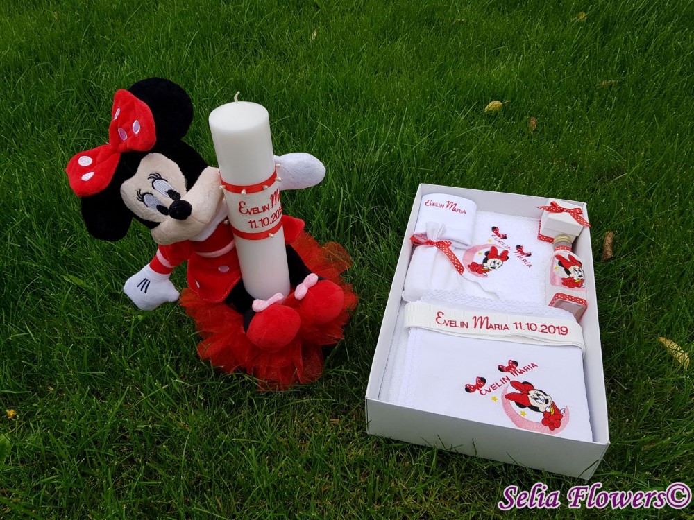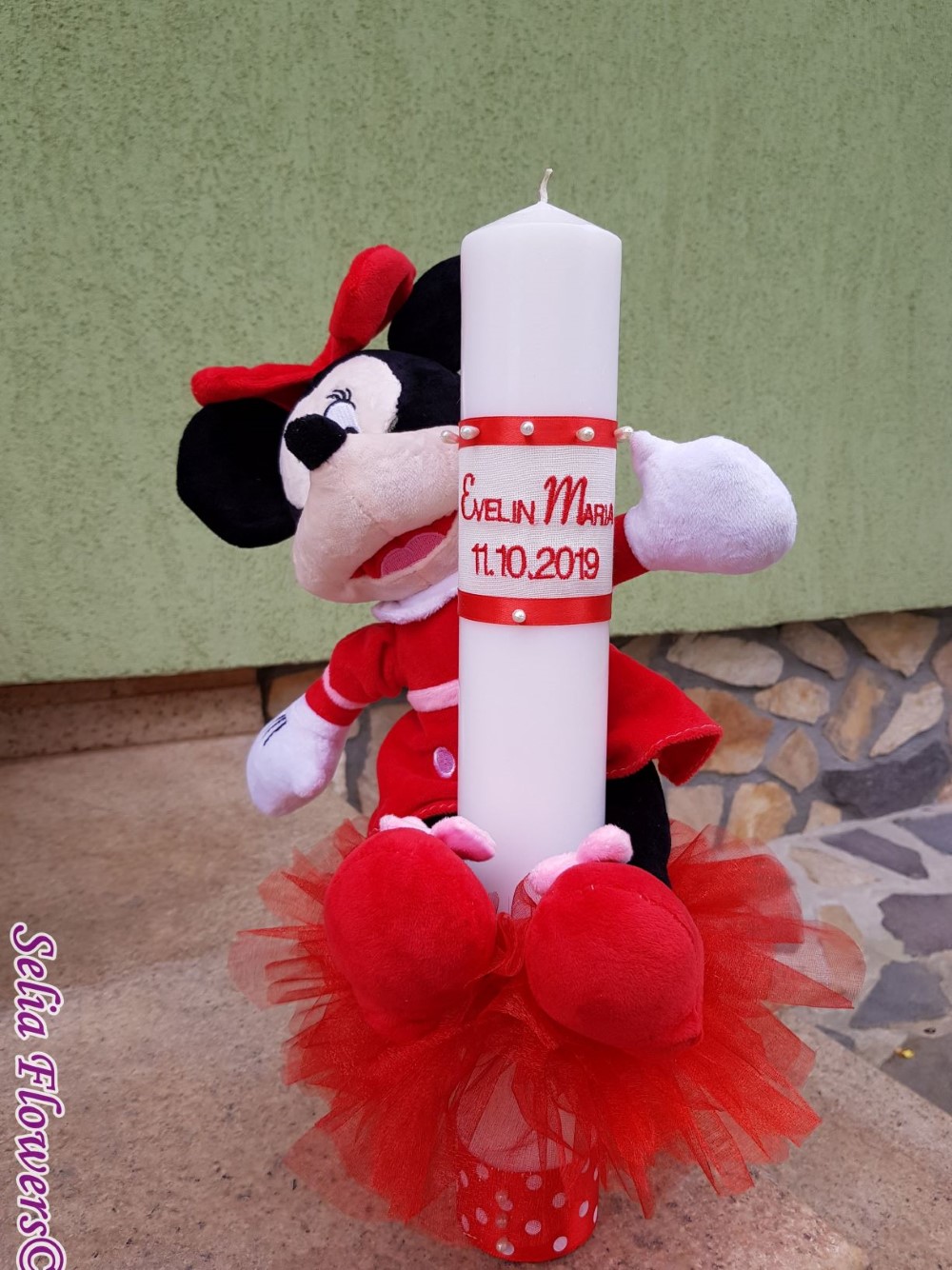 Lumanarea este decorata cu rochita din organza lucrata manual si broderie personalizata cu numele si data evenimentului, este accesorizata cu panglica din saten si papusa Minnie mouse si are o inaltime de 45 cm .