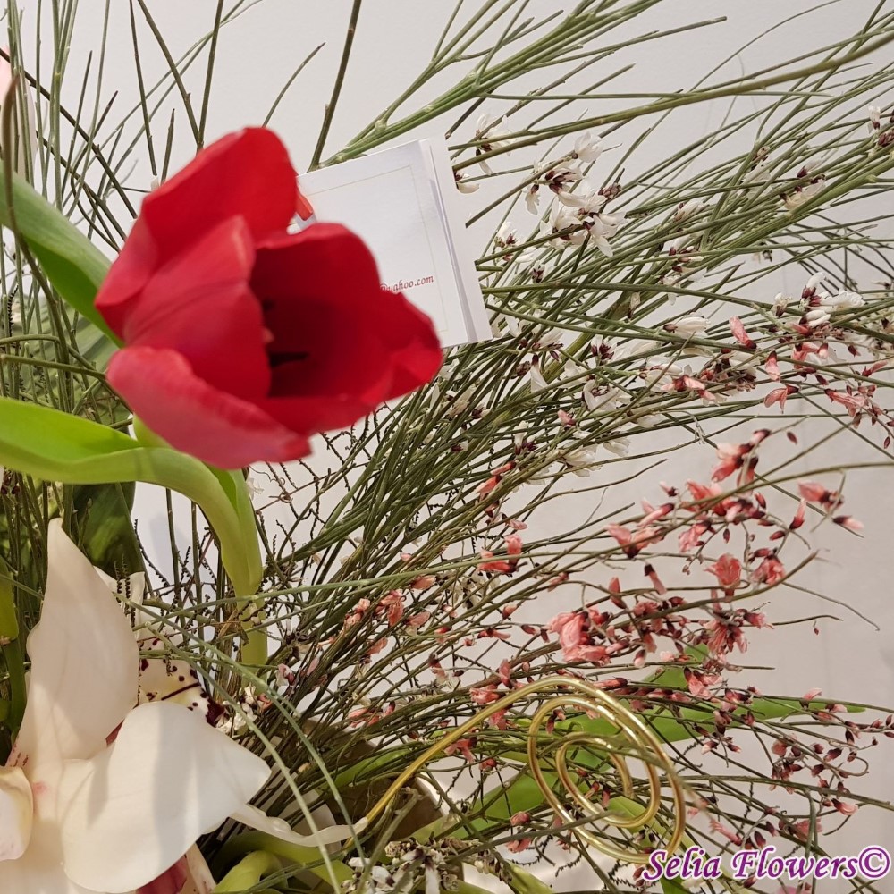 Compozitie: orhidee cymbidium, lalele in doua culori, ranunculus, ginster in 2 culori, verdeata, accesorii din sarma floristica.