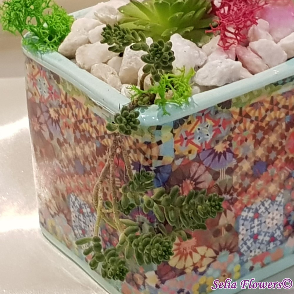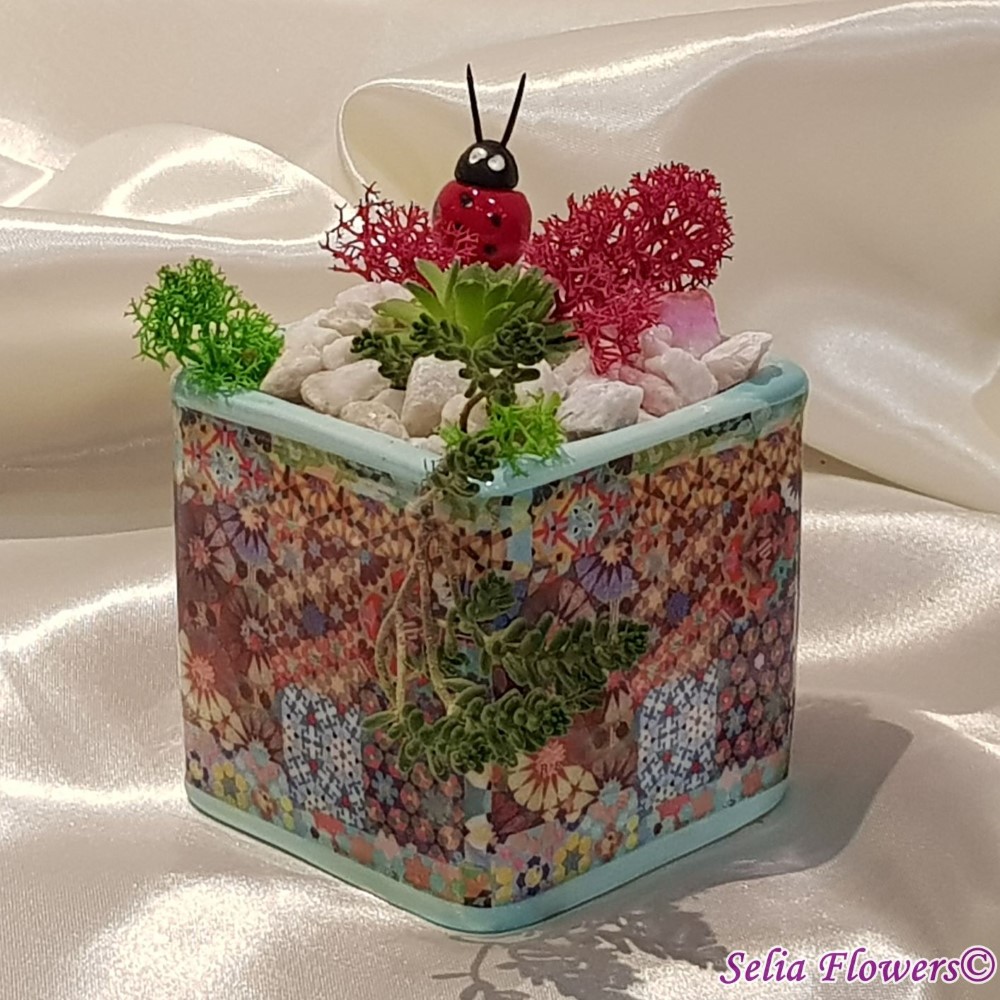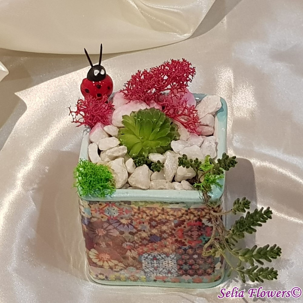 Martisor floral cu plante suculente, licheni stabilizati, accesorii, pietricele din marmura decorativa. Este construit in vas ceramic cu model, tip cub (inaltimea vasului 8 cm).