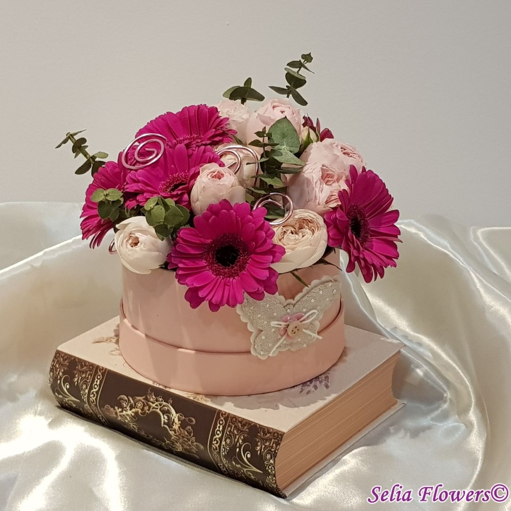 Aranjament in cutie realizat cu tros roses, germini, eucalypt, accesorii din sarma floristica decorativa si fluturas.
