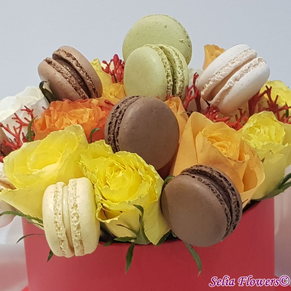 Un aranjament delicios, construit intr-o cutie tip joben, dintr-un mix de trandafiri in doua culori si o selectie de macarons.