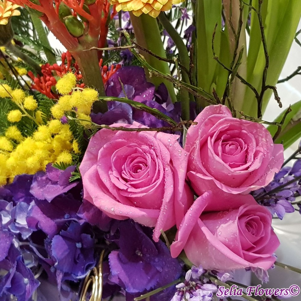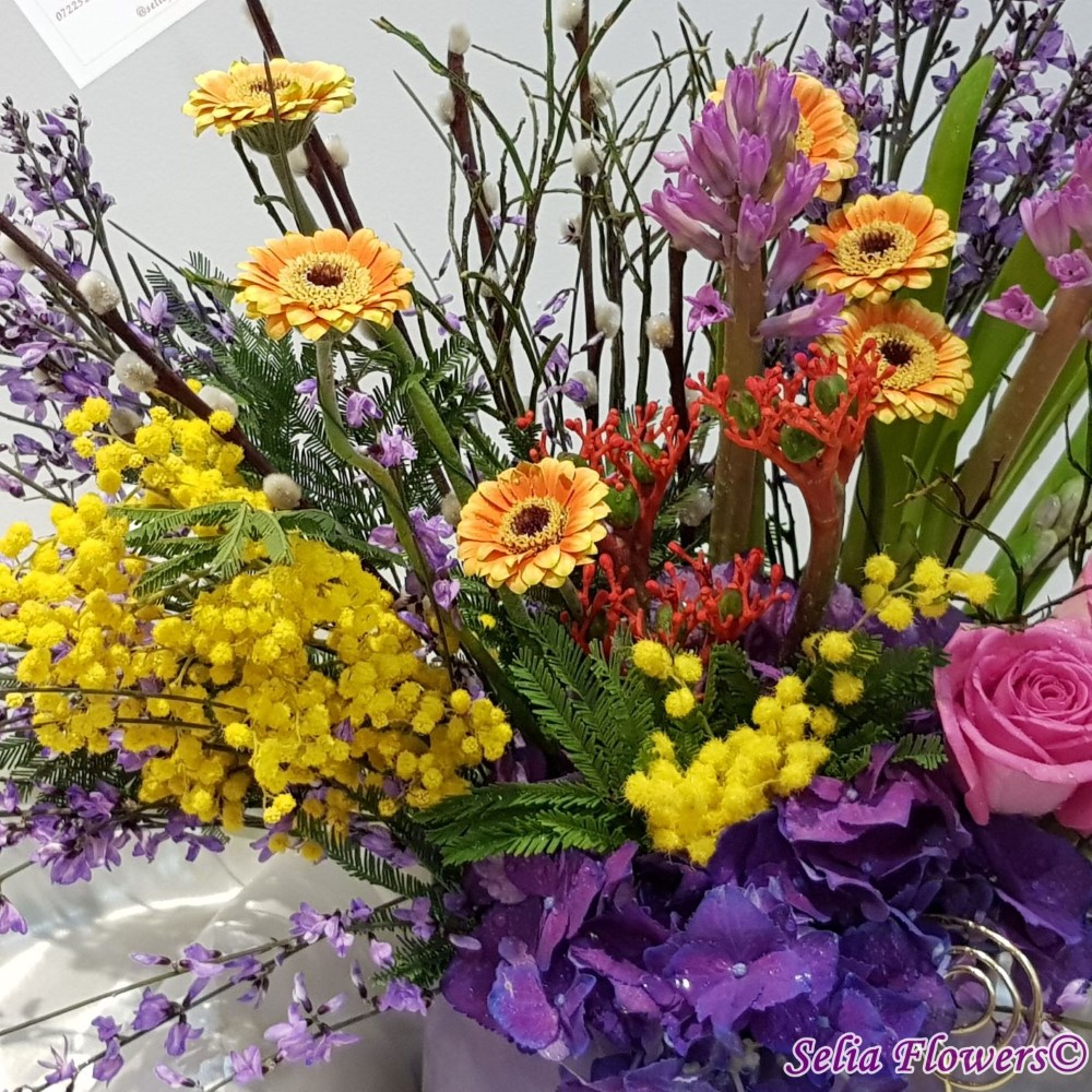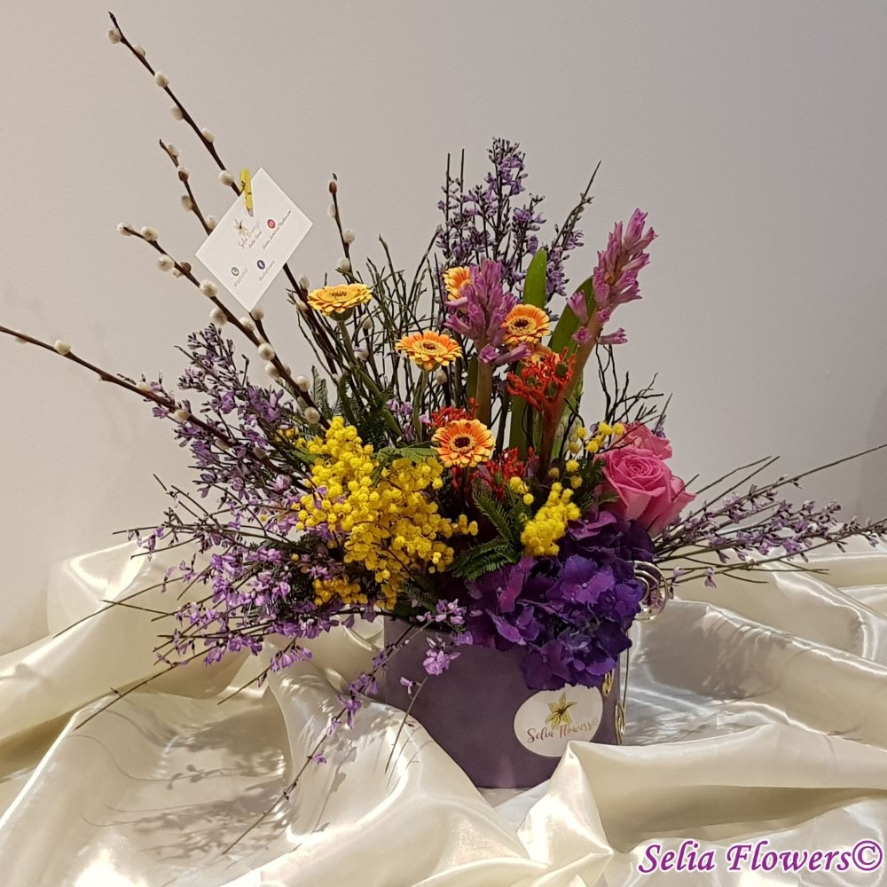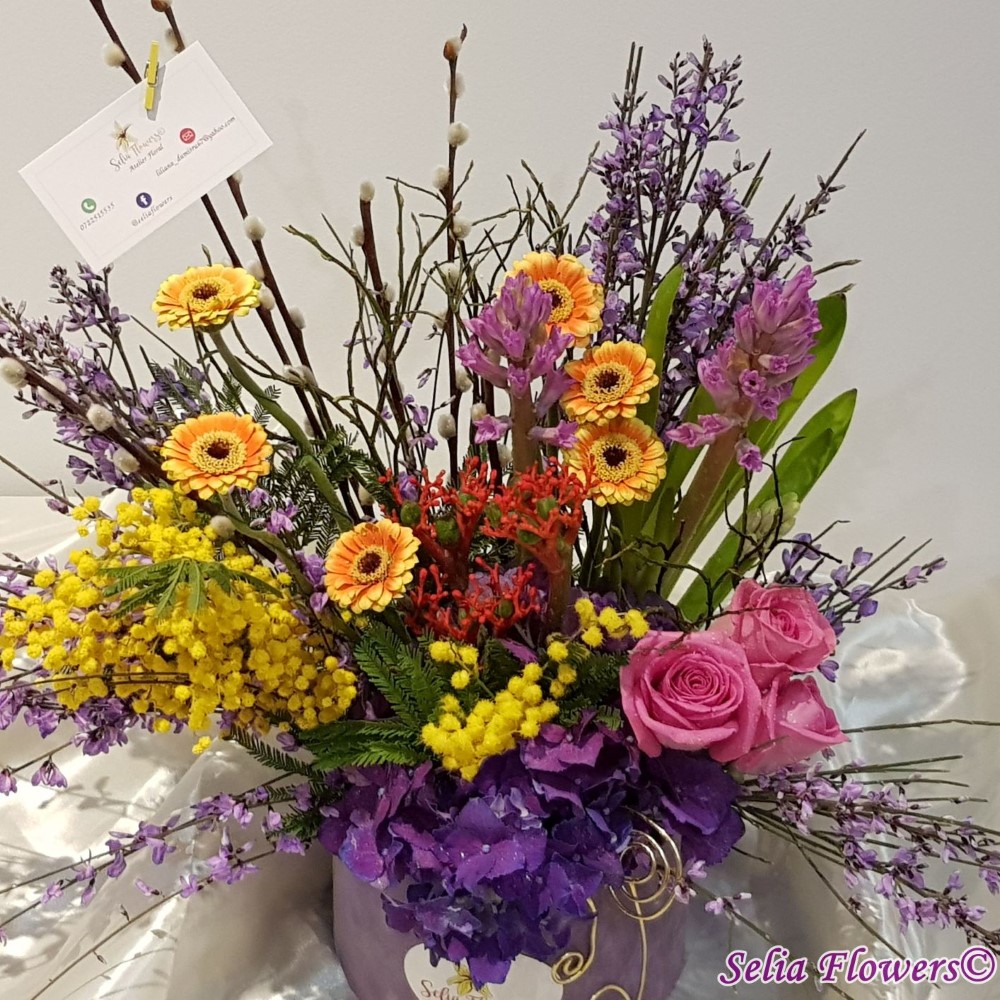 Un aranjament vesel si plin de culoare si parfum, construit in cutie de catifea, dintr-un mix de flori: trandafiri, hydrangea, zambile, genista, germini, salix si accesorii din sarma floristica decorativa.