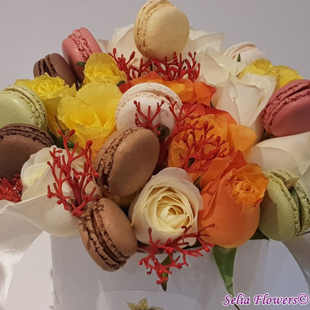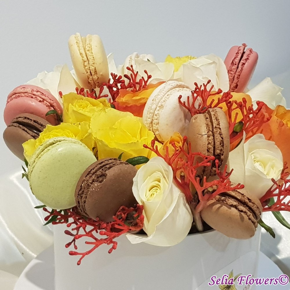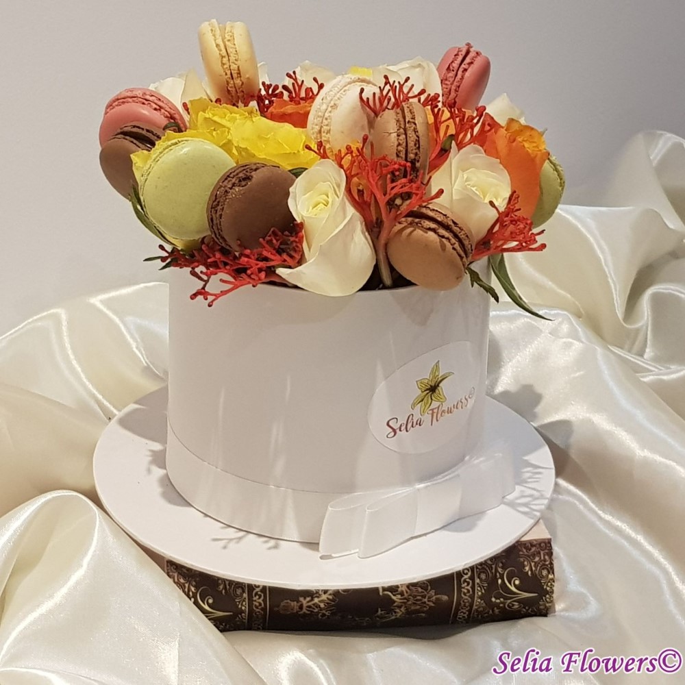 Un aranjament vesel si delicios, construit intr-o cutie tip joben, dintr-un mix de trandafiri in doua culori, jatropha si o selectie de macarons.
