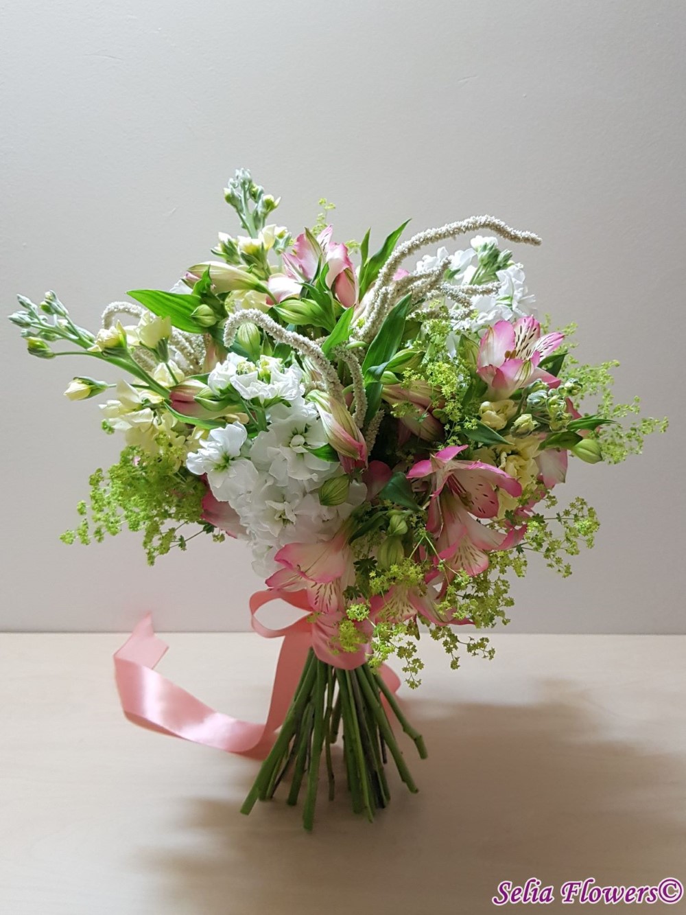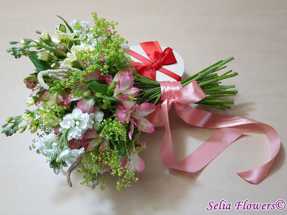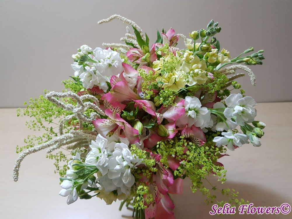 Un buchet vesel, invaluit de miresme delicate, realizat din mathiola, alstroemeria si amaranthus.