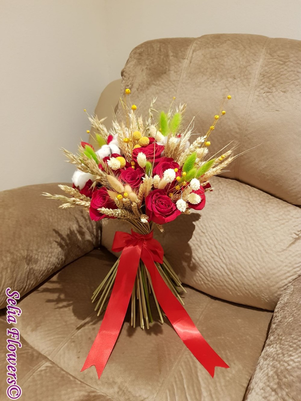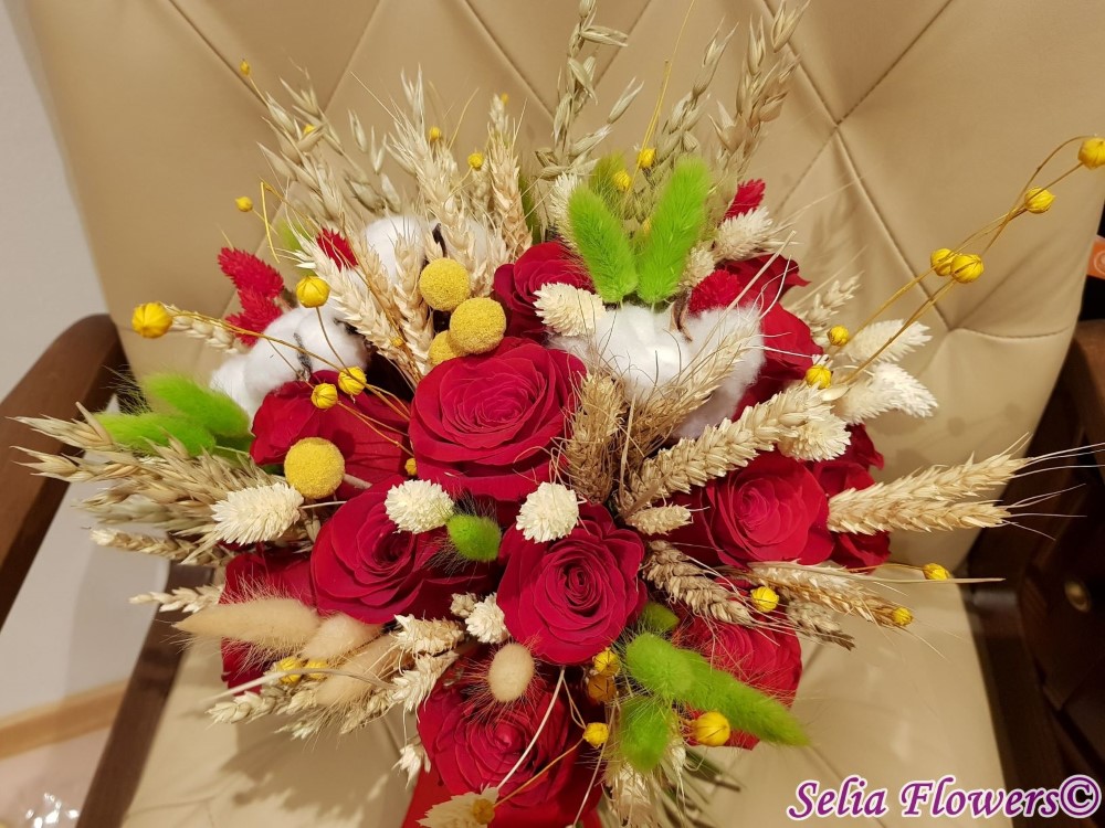 Un buchet vesel, optimist si plin de semnificatii. Este construit din trandafiri rosii, care exprima cel mai bine sentimentele de dragoste si pretuire, spice de grau care semnifica belsug si prosperitate si delicate flori albe de bumbac care, alaturi de alte flori, incununeaza intreg aranjamentul floral.