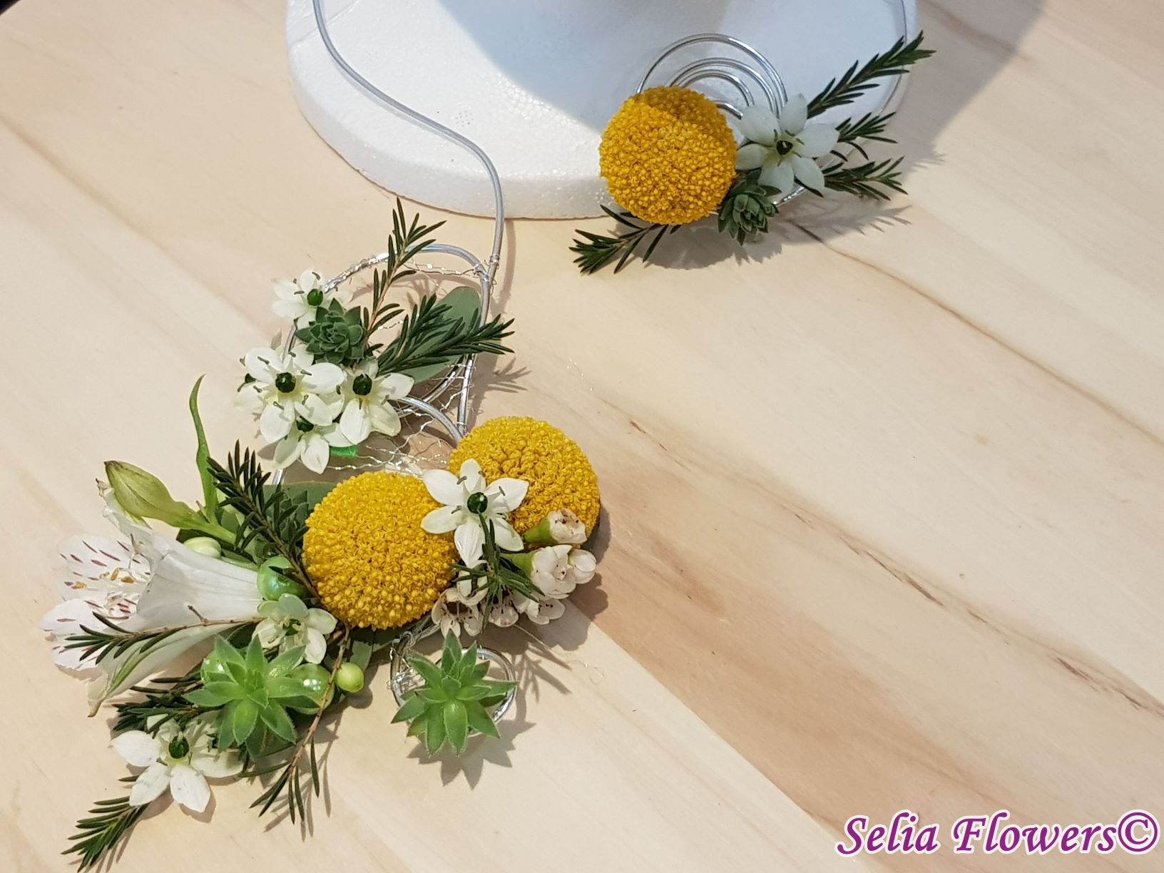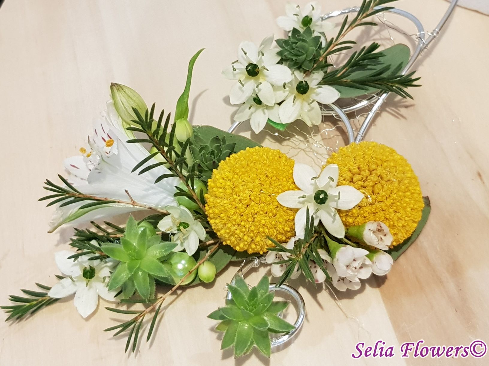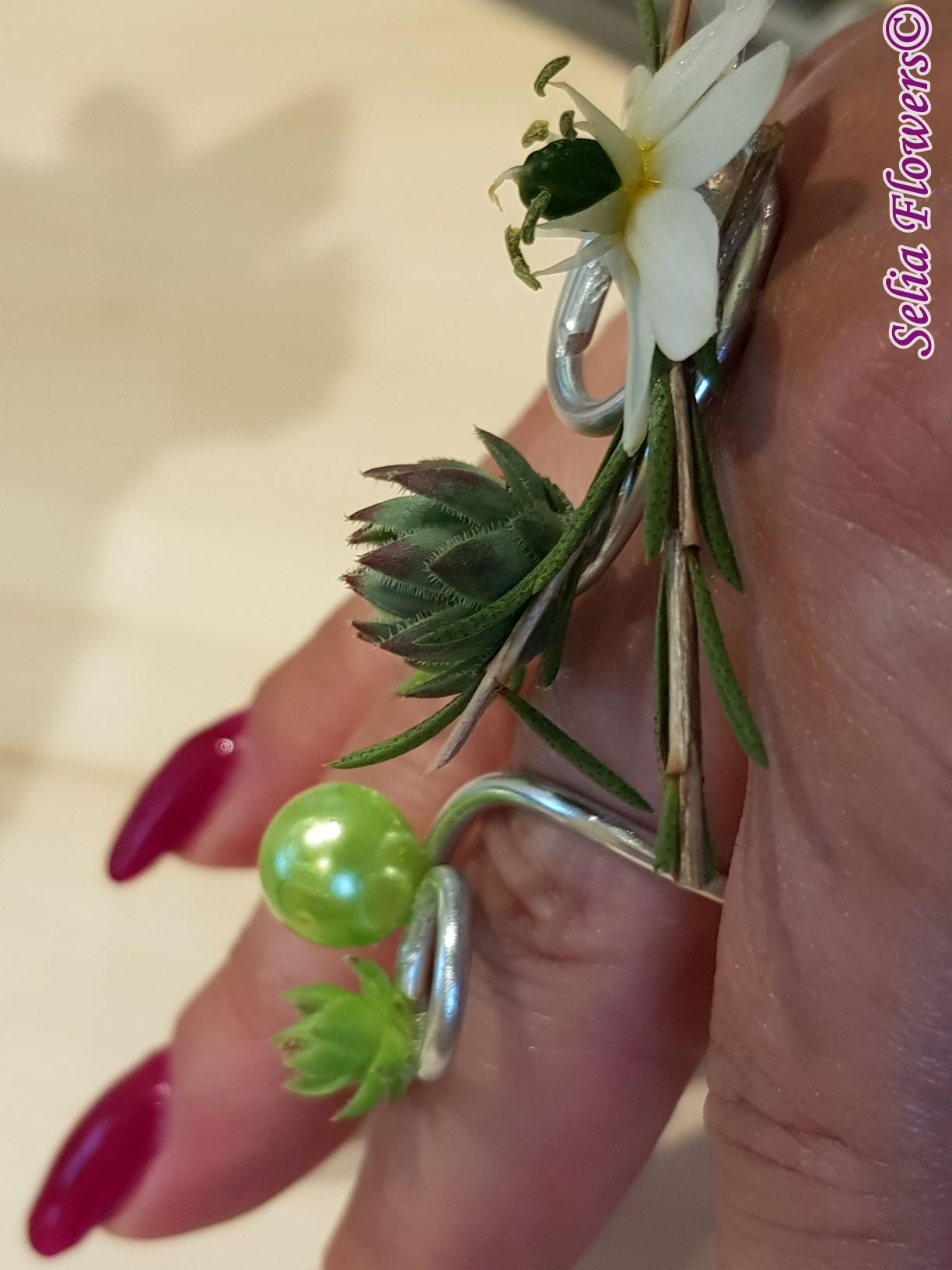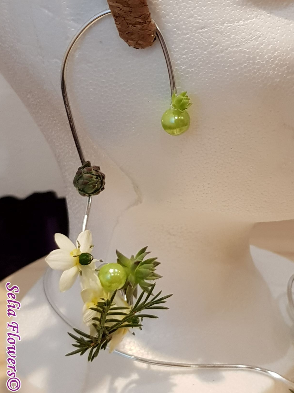 Set bijuterii handmade (colier, inel si cercel). Sunt lucrate pe o baza din sarma floristica decorativa, accesorizata cu flori naturale de ornithogalum, craspedia, wax flower, plante suculente si perle.