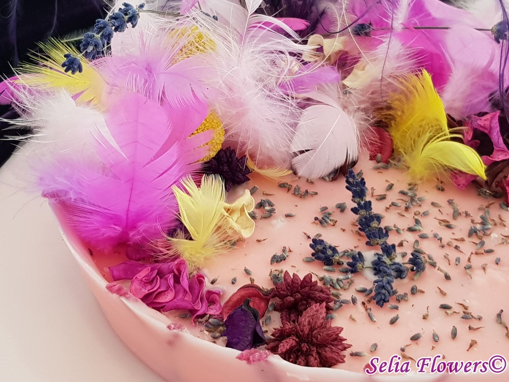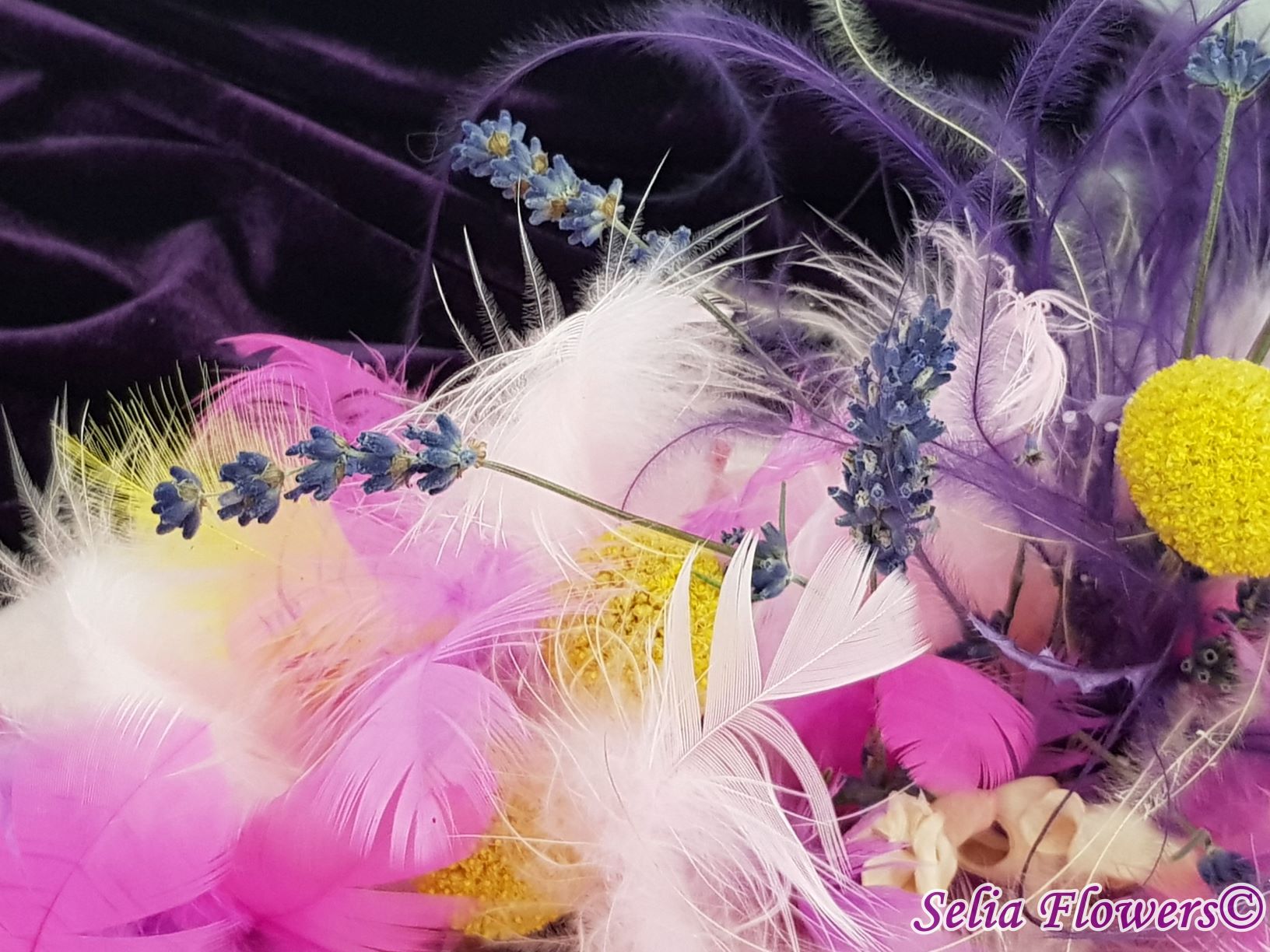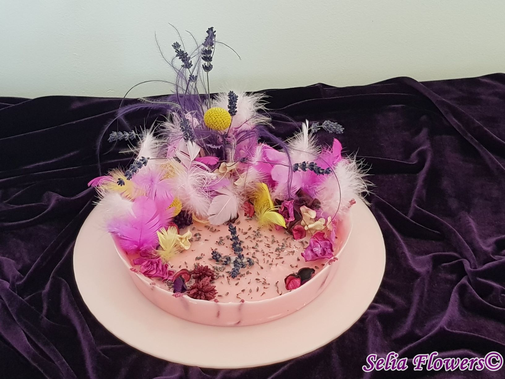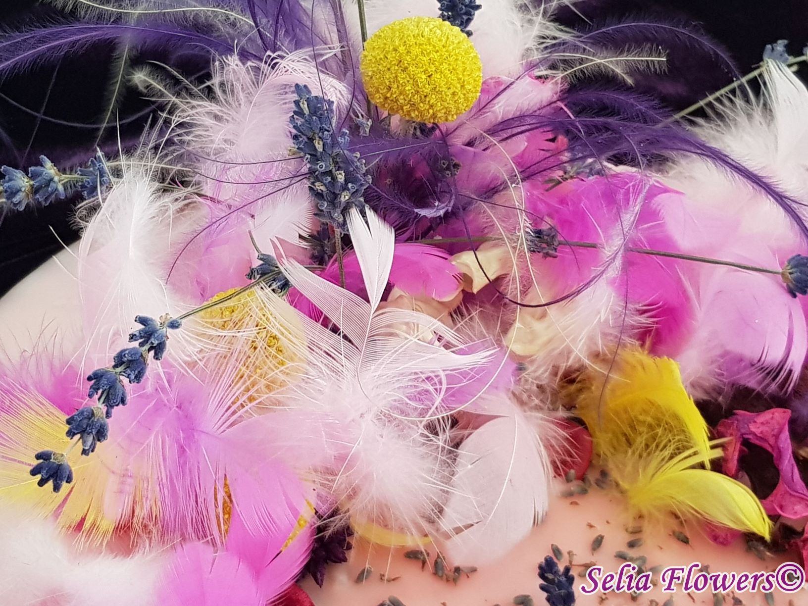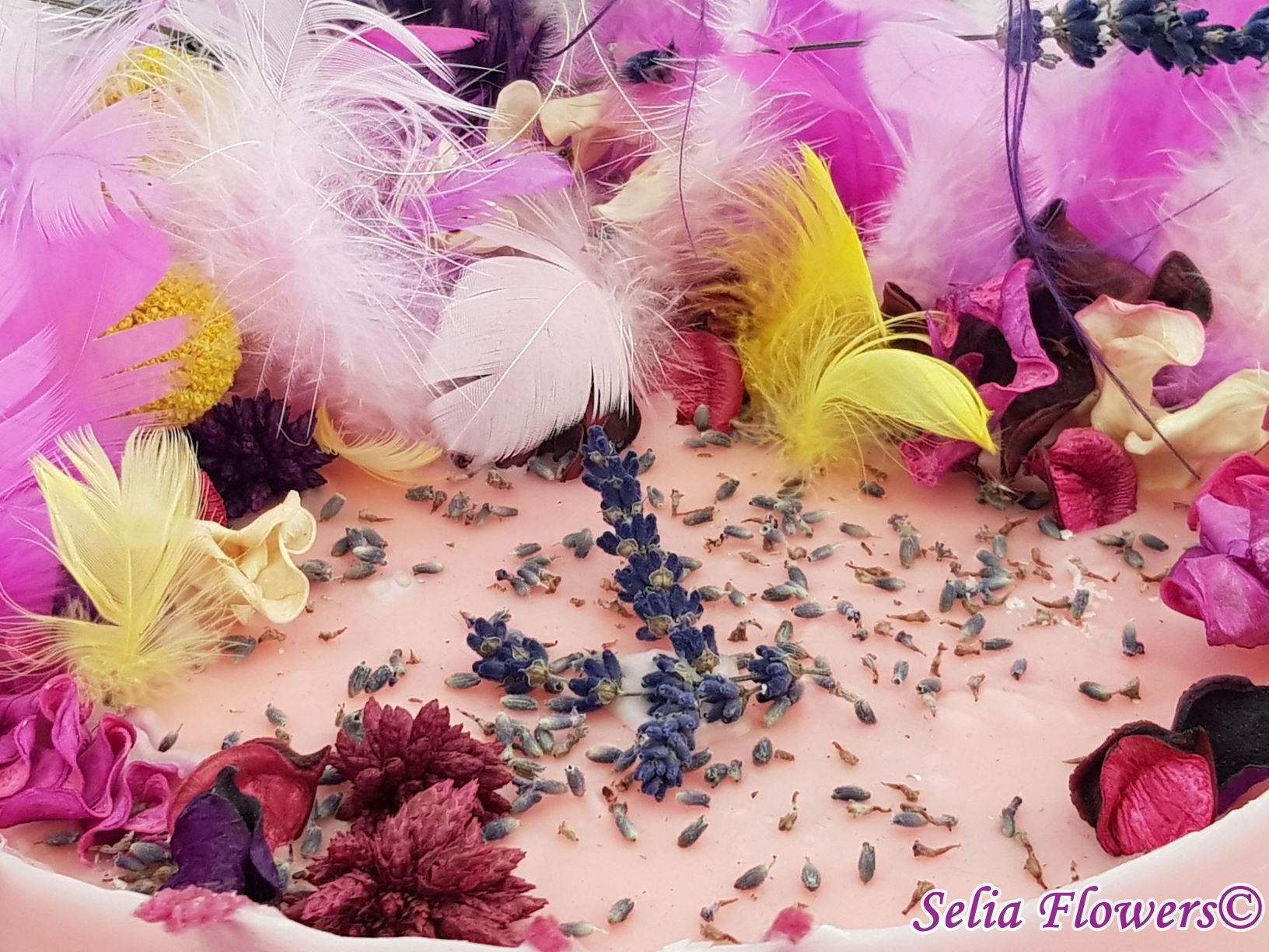 Poate fi un cadou unicat pentru cineva drag sau un decor original și elegant pentru casa ta. Diametrul vasului este de 25-26 cm, este un produs handmade realizat din ceară in atelierul nostru floral si este decorat cu flori de lavanda, craspedia, stipa, pene si flori uscate. Decorul se poate schimba în funcție de preferințe, la fel și culoarea vasului.