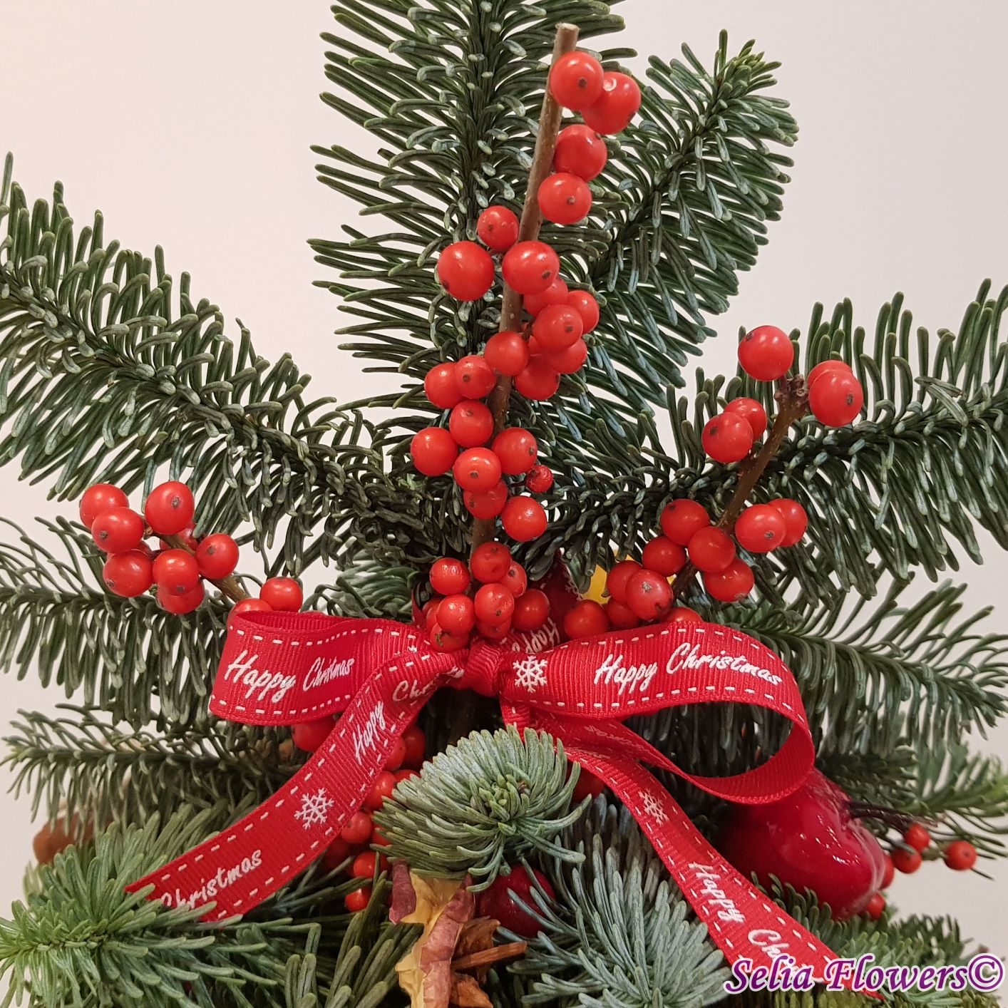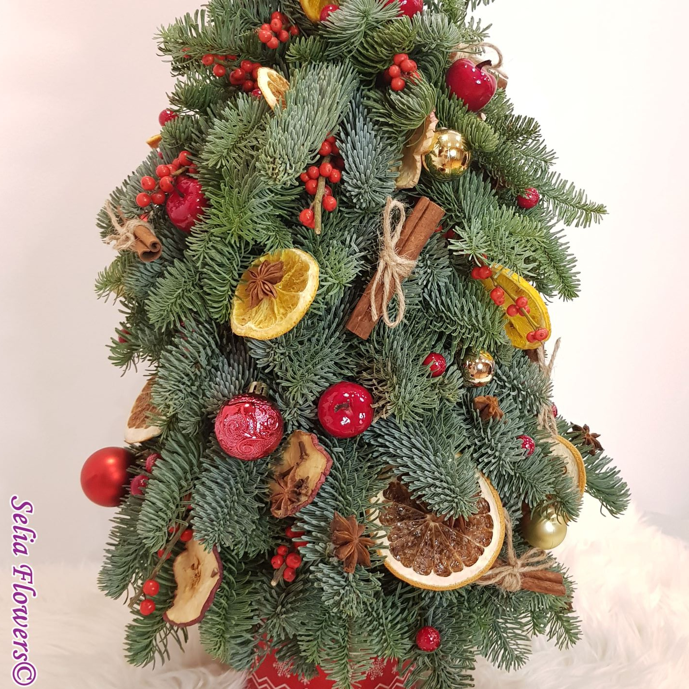 Un brăduț construit crenguță cu crenguță, un aranjament unicat construit handmade din brad Nobilis, pe suport de burete umed care asigură hidratarea crenguțelor.