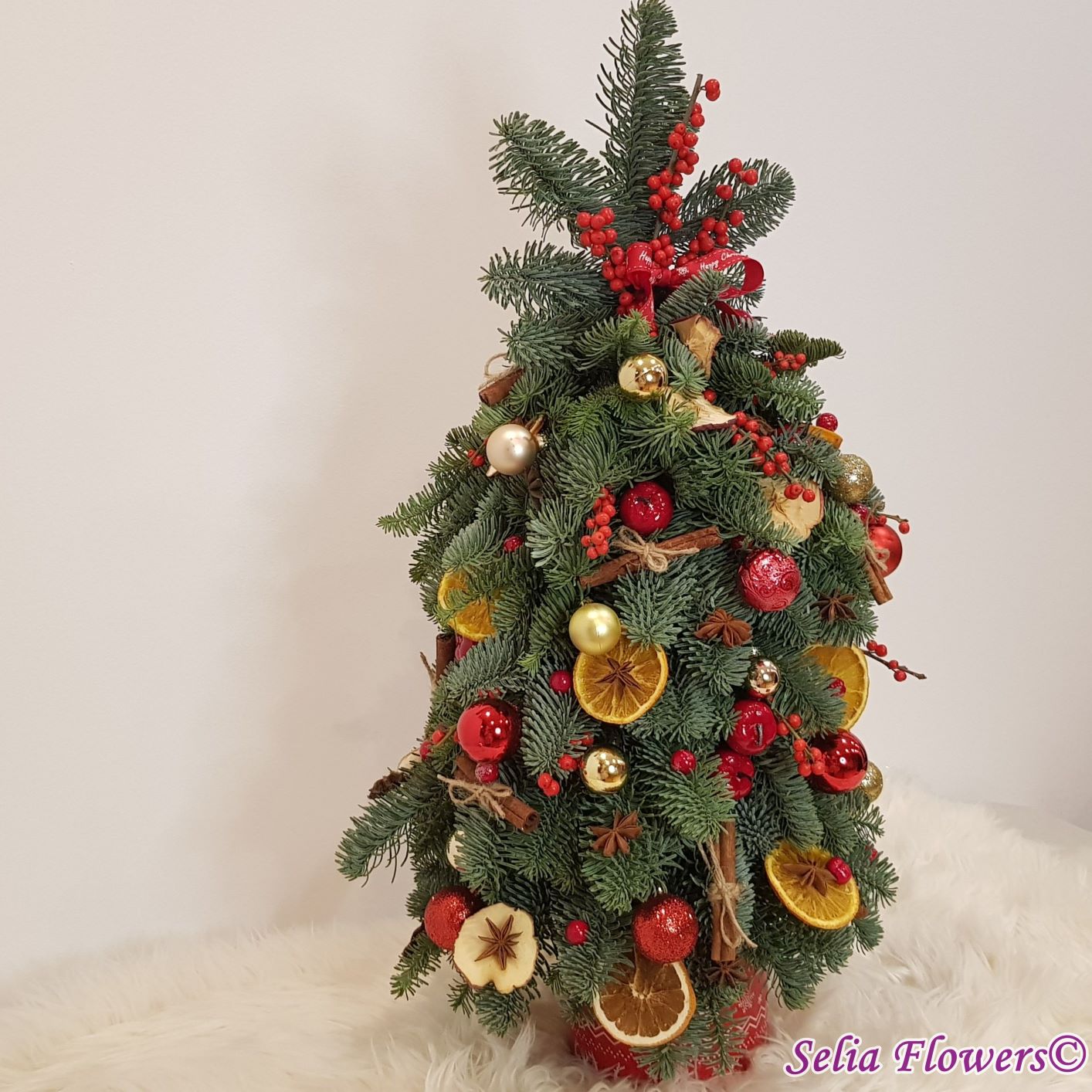 Înălțimea aranjanjamentului este de 70 cm, din care 57 cm - brăduțul construit și 13 cm este înălțimea vasului ceramic în care este realizat.