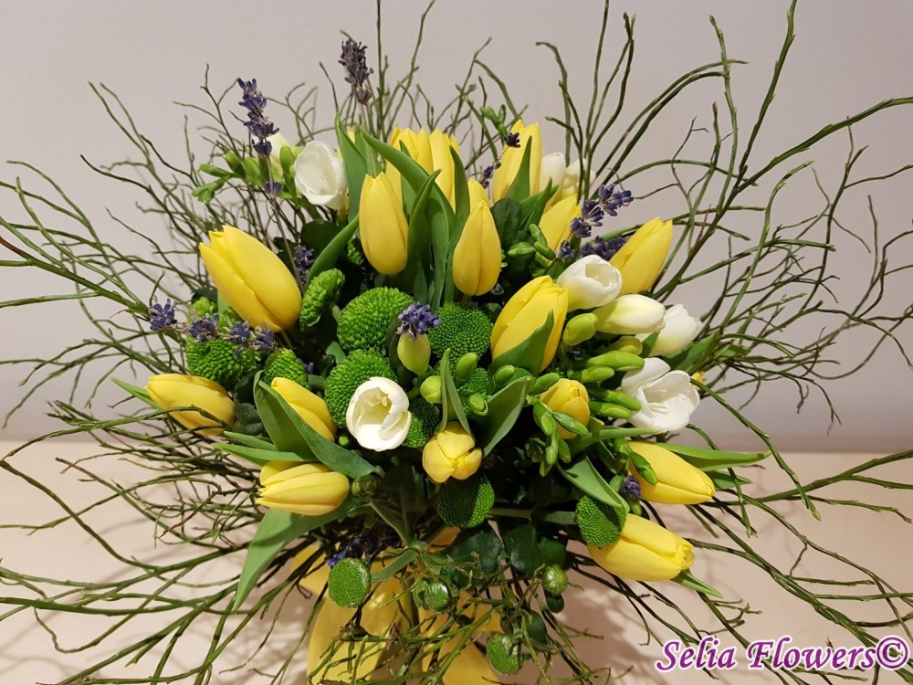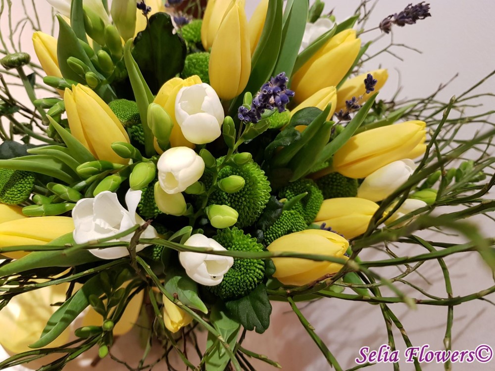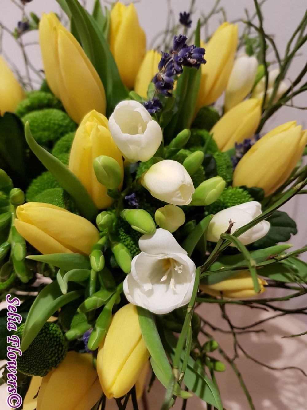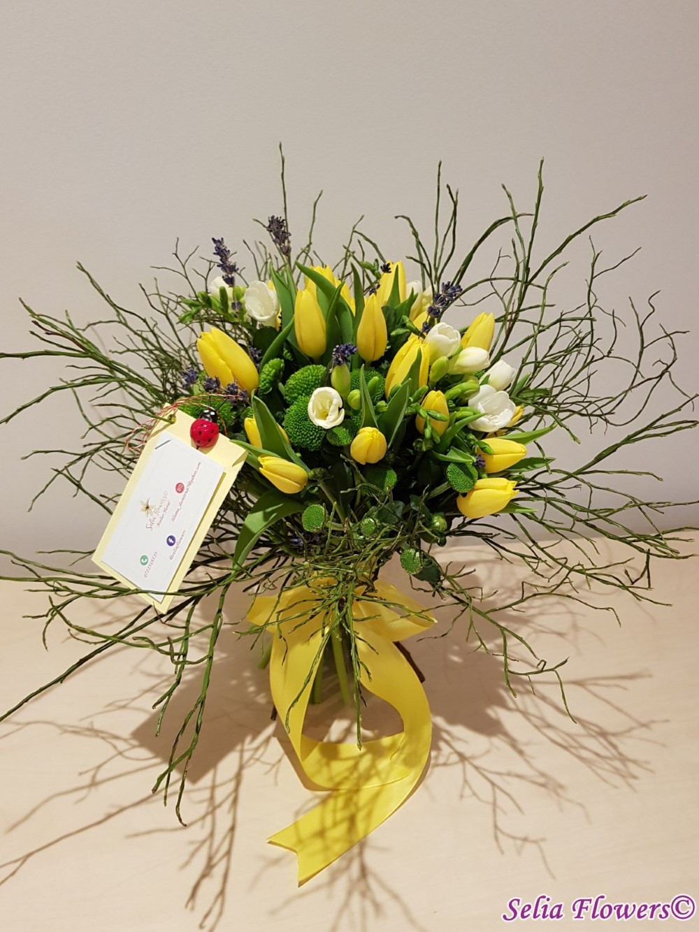 Buchet din lalele, frezii, santini, fire lavanda, heidelbeer si accesorii.