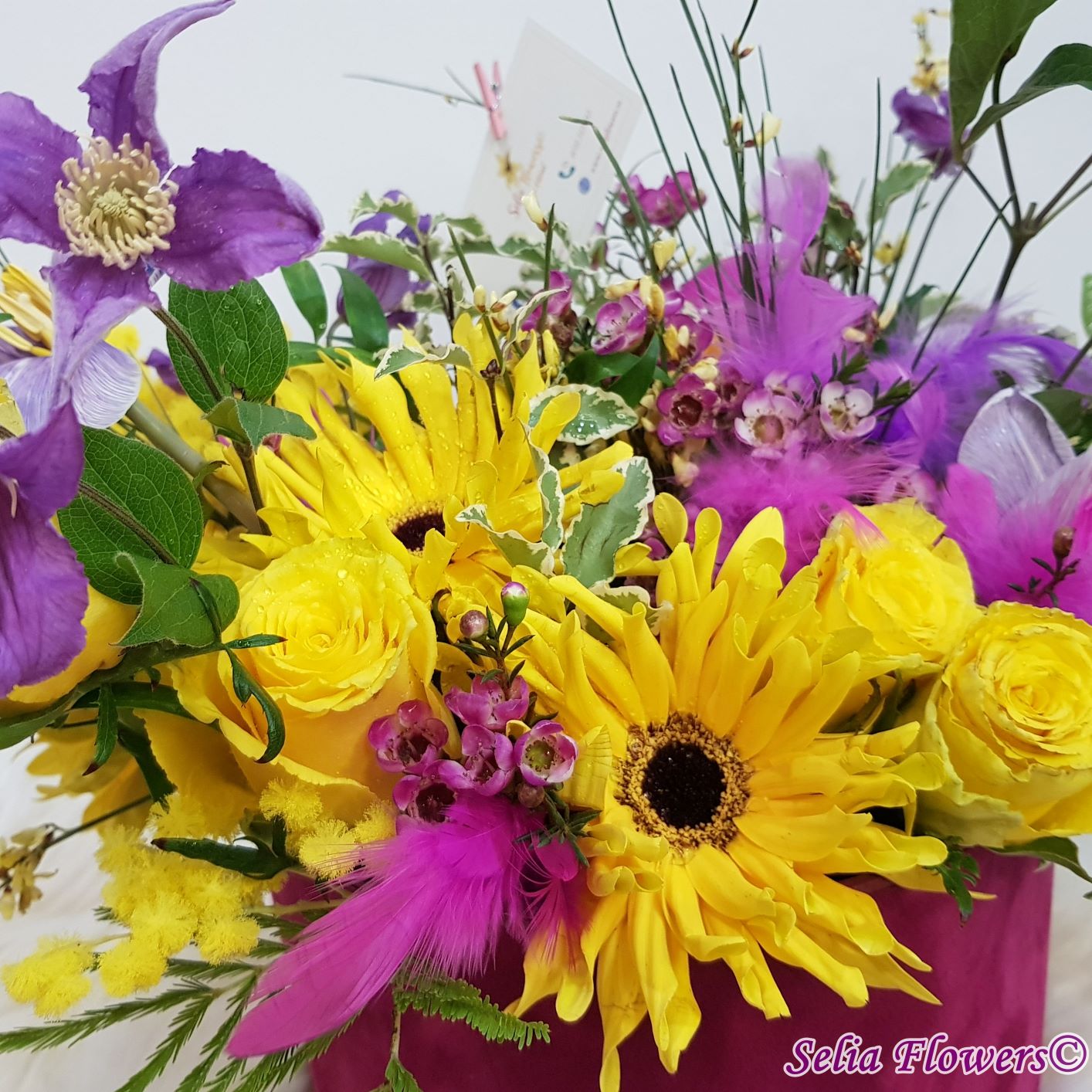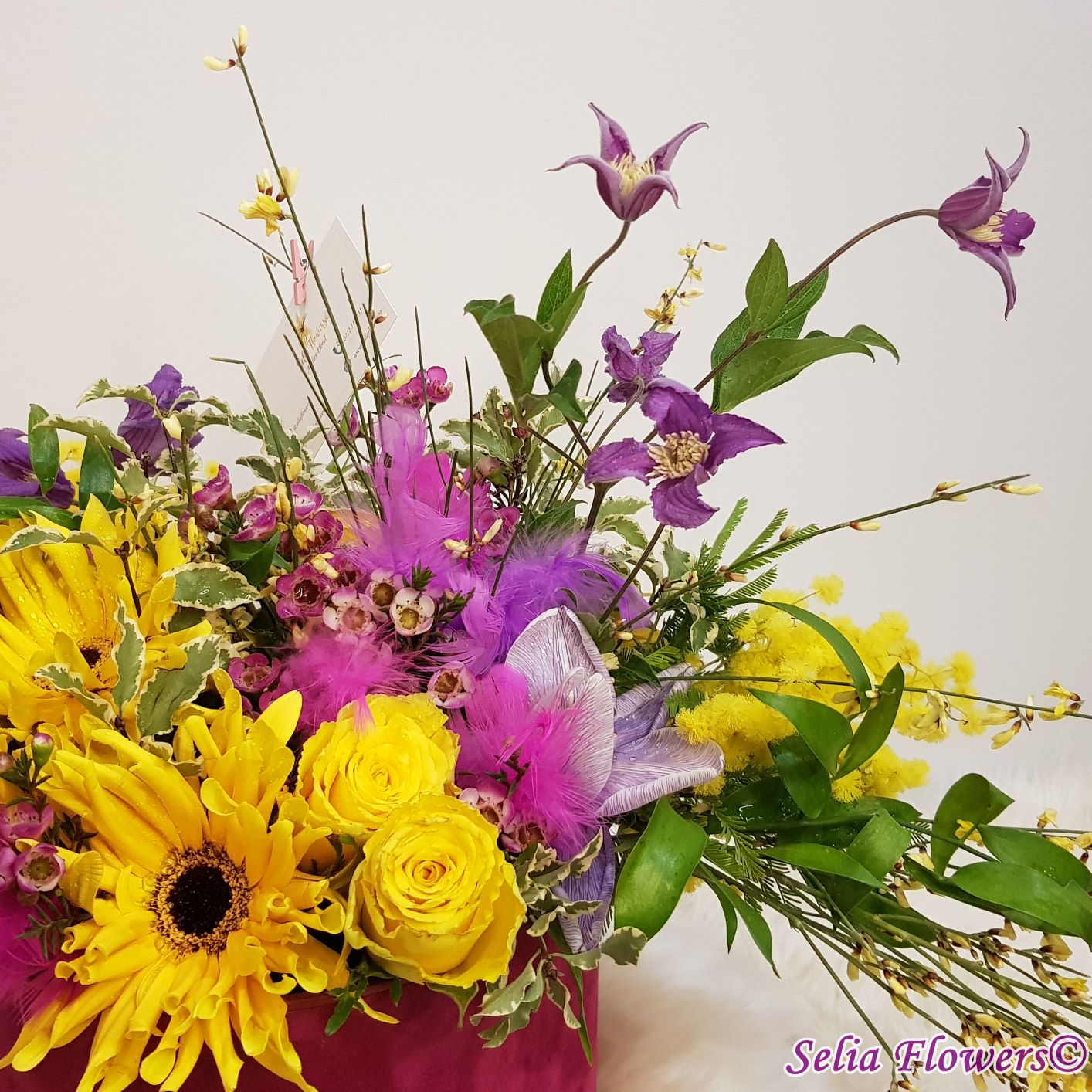 Un aranjament vesel și parfumat, construit în cutie de catifea cu flori de primăvară (lalele vip, clematite, wax flowers, germini spider, acacia, trandafiri, pittosporum nigra ) și accesorii sub formă de pene de strut colorate .