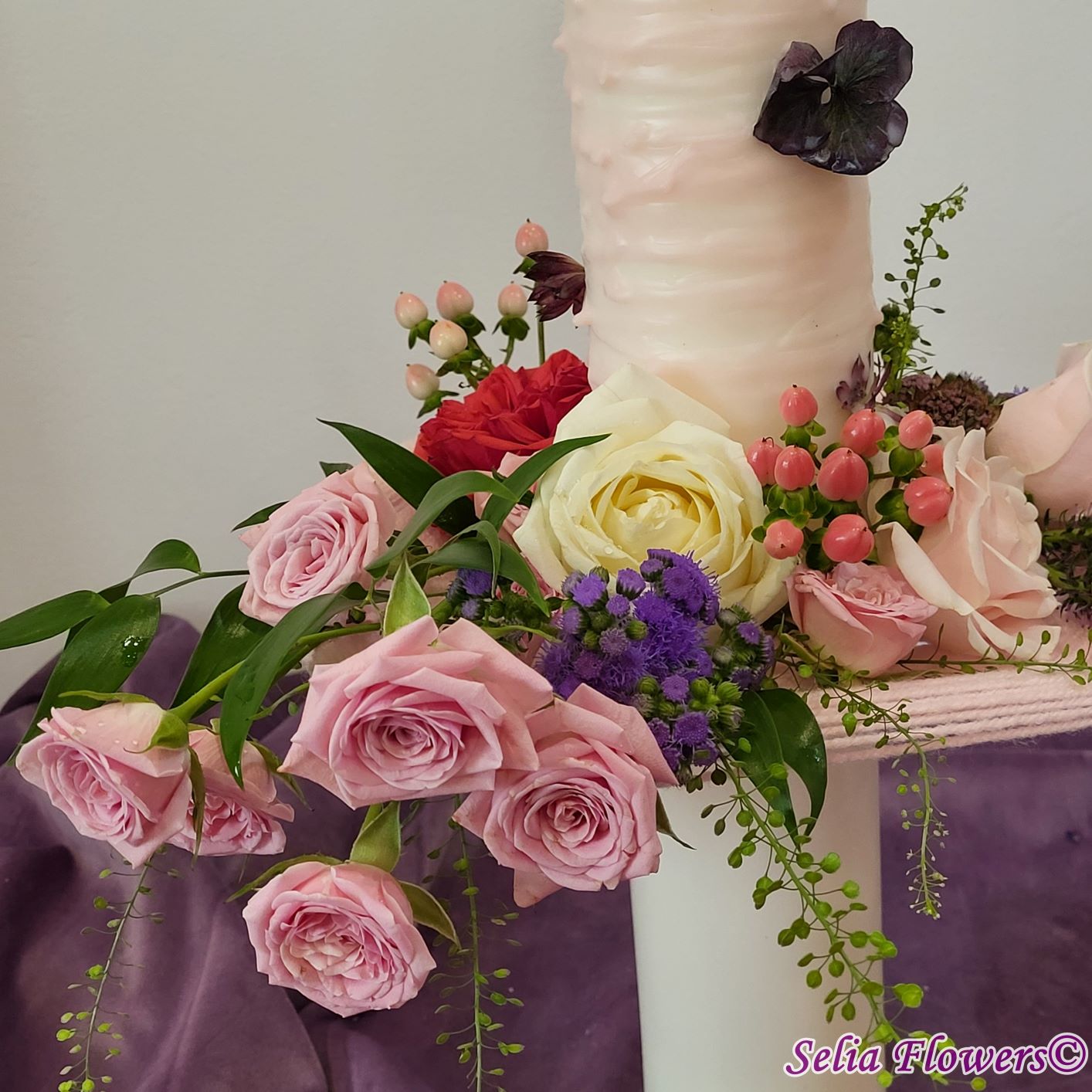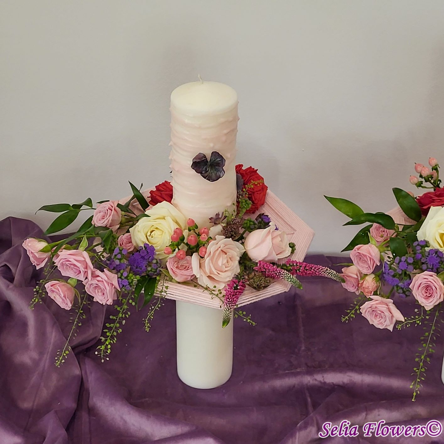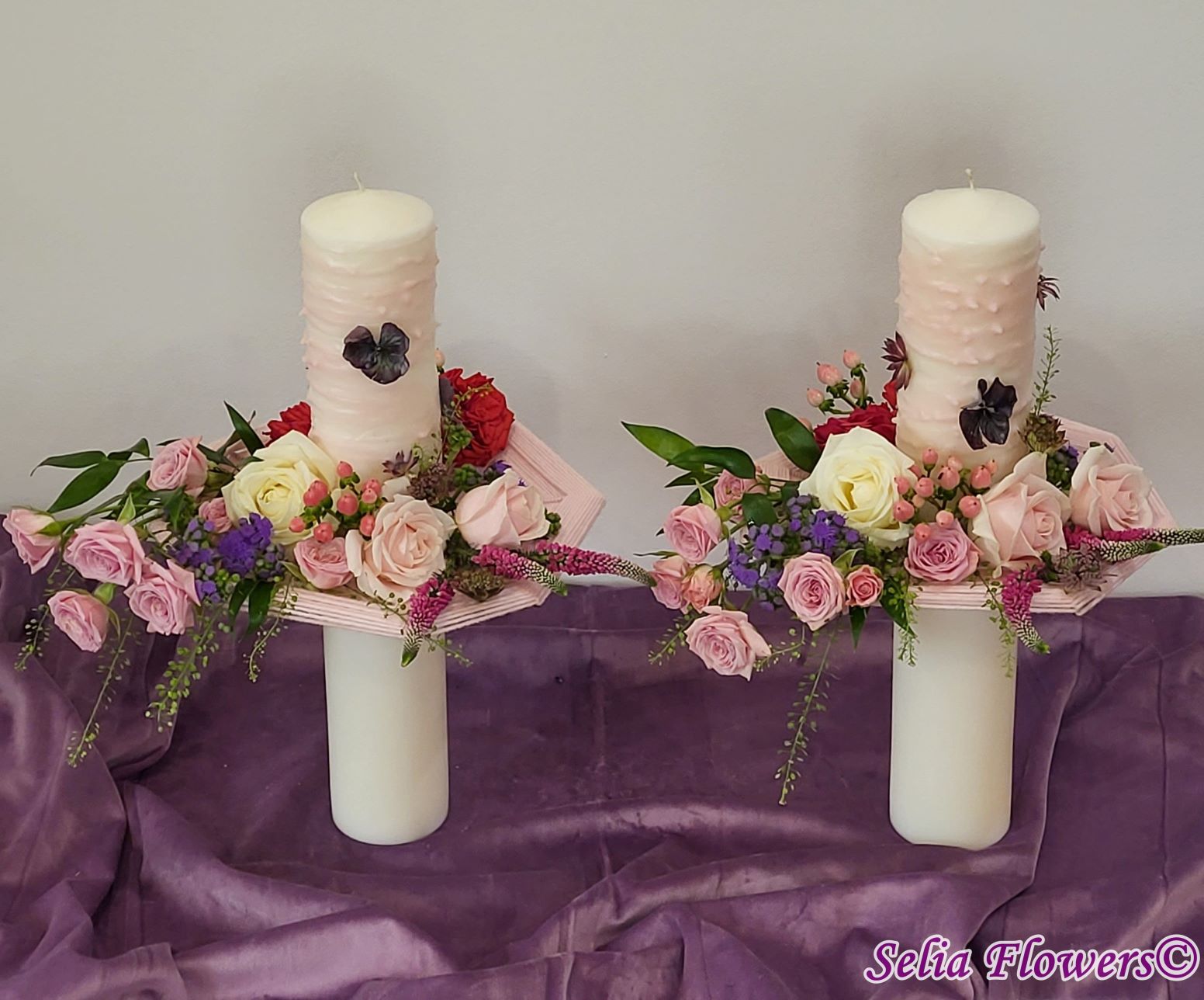 Lumânari decorate cu flori naturale cu un design realizat pe structura spider lucrată manual în atelierul nostru.