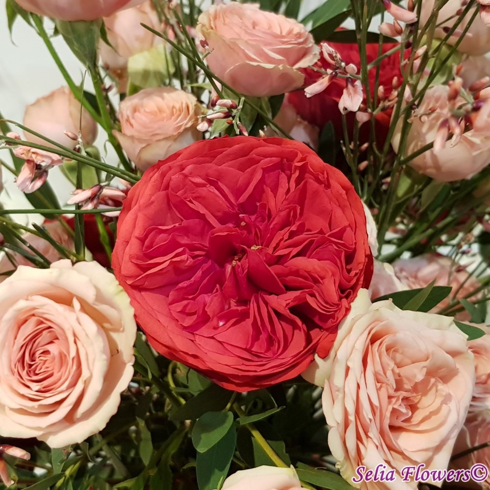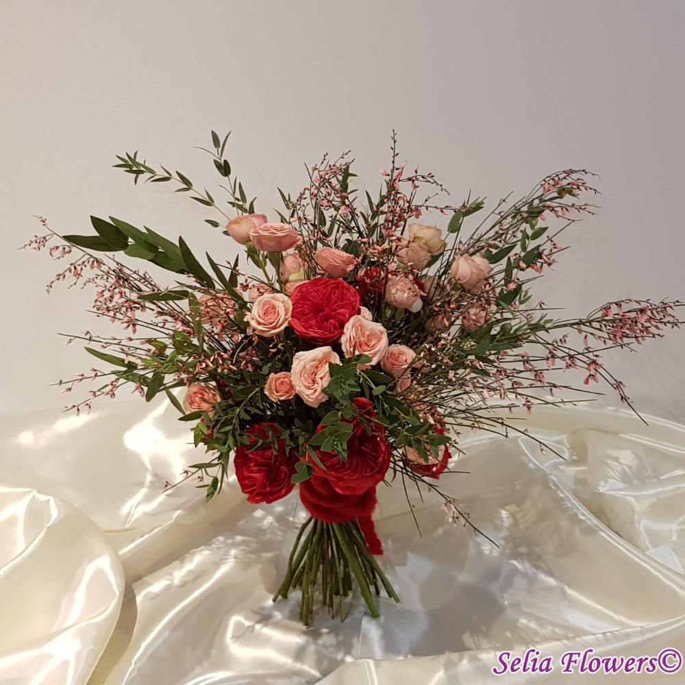 Buchet din trandafiri red piano, trandafiri tros, ginster, verdeata si accesorii.
