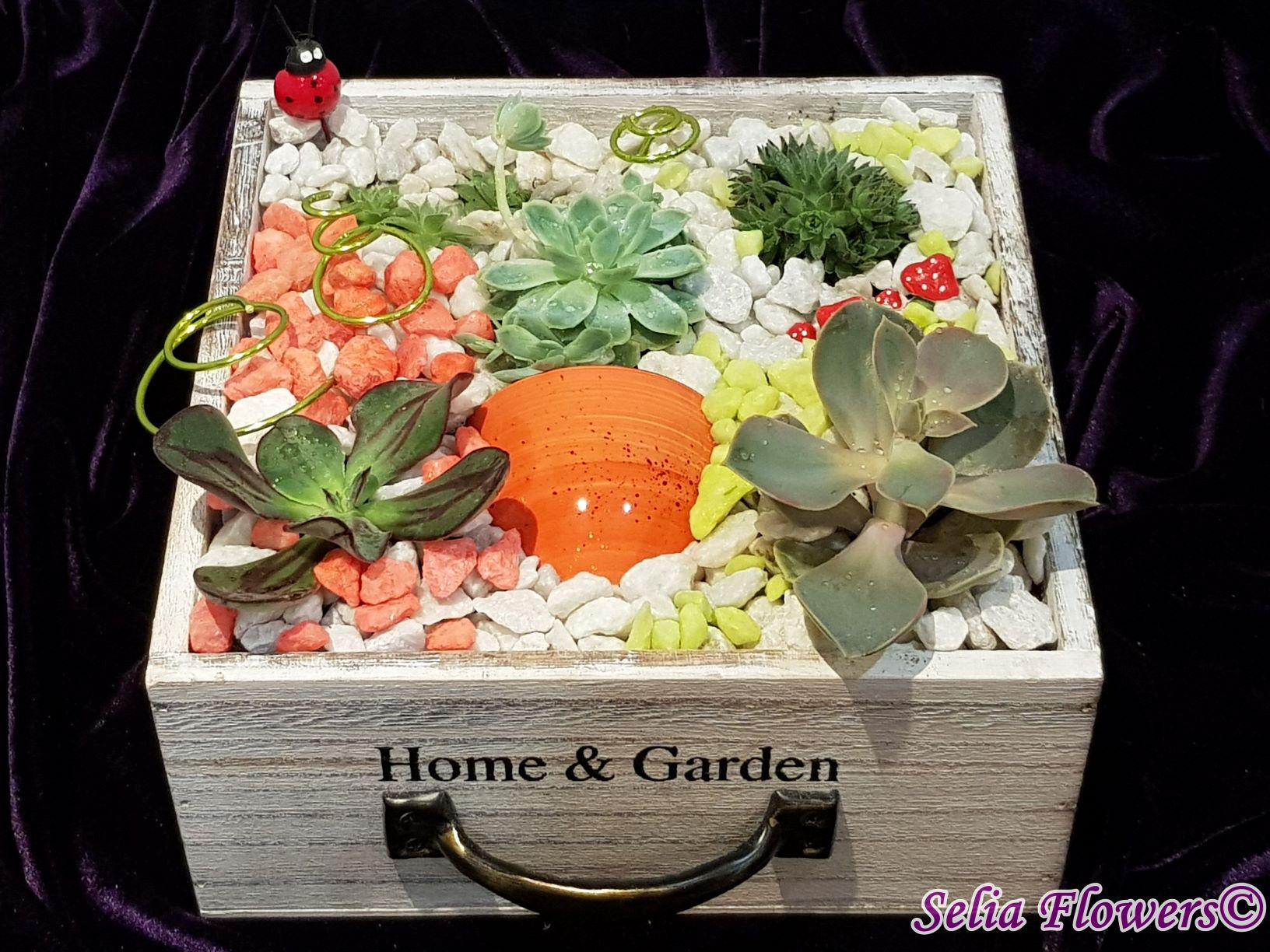 Un aranjament vesel, decorativ și elegant construit în cutie de lemn tip sertar, dintr-un mix de plante suculente, accesorii decorative, marmură albă și pietre decorative in diverse culori. Potrivit atât ca aranjament de business, dar și pentru a fi daruit unei persoane dragi care se poate bucura mult timp de el de acum inainte.