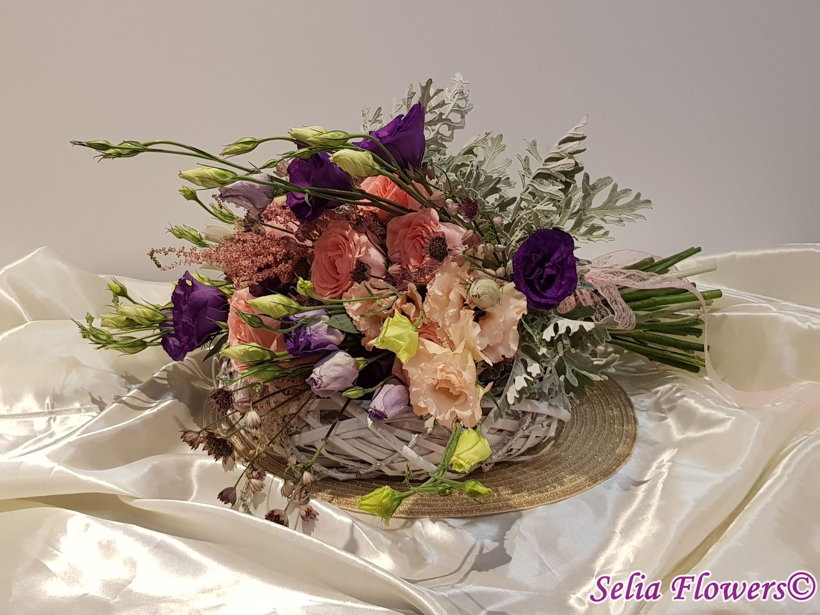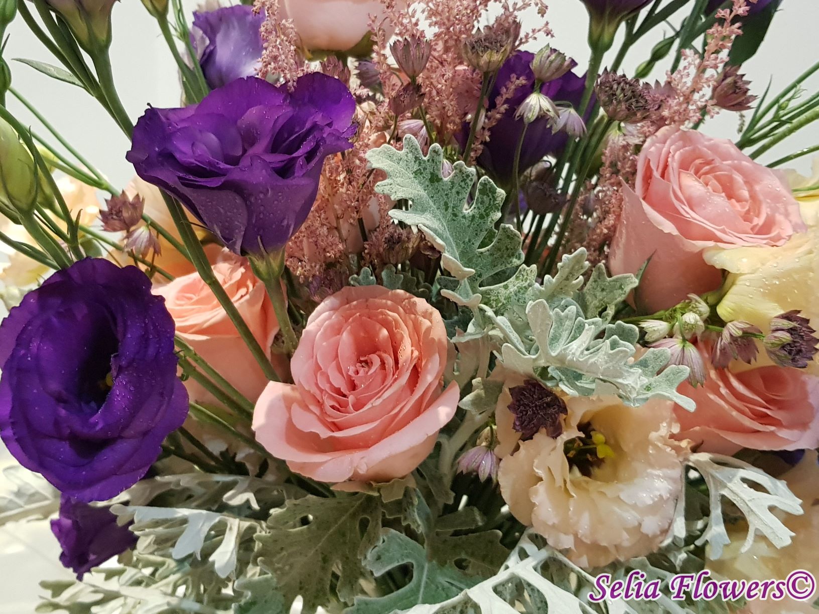 Un buchet vesel si plin de culoare, construit cu trandafiri, lisianthus,astrantia, asrilbe, senecio