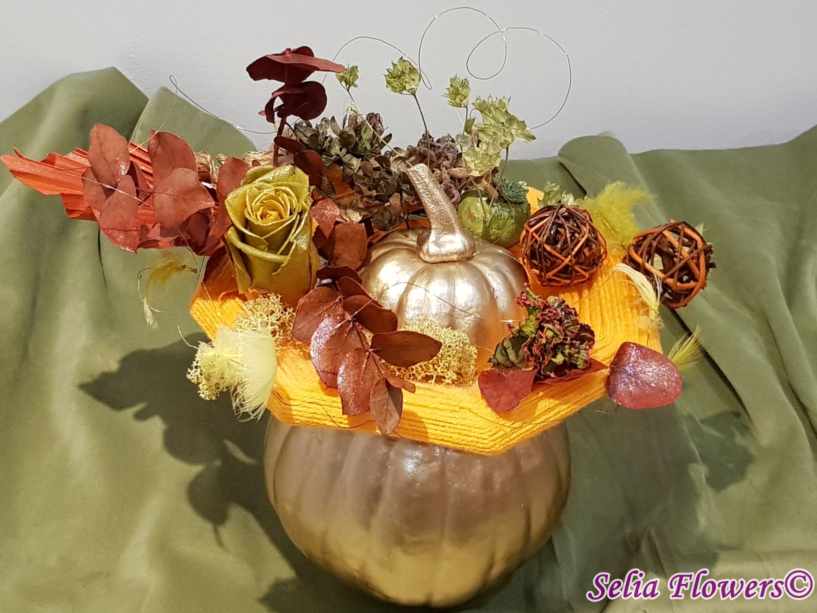 Aranjamentul floral este realizat pe structura spider construita pe dovleac, cu trandafir criogenat si flori naturale uscate sau conservate. Dovleacul este vopsit in culoarea aurie.