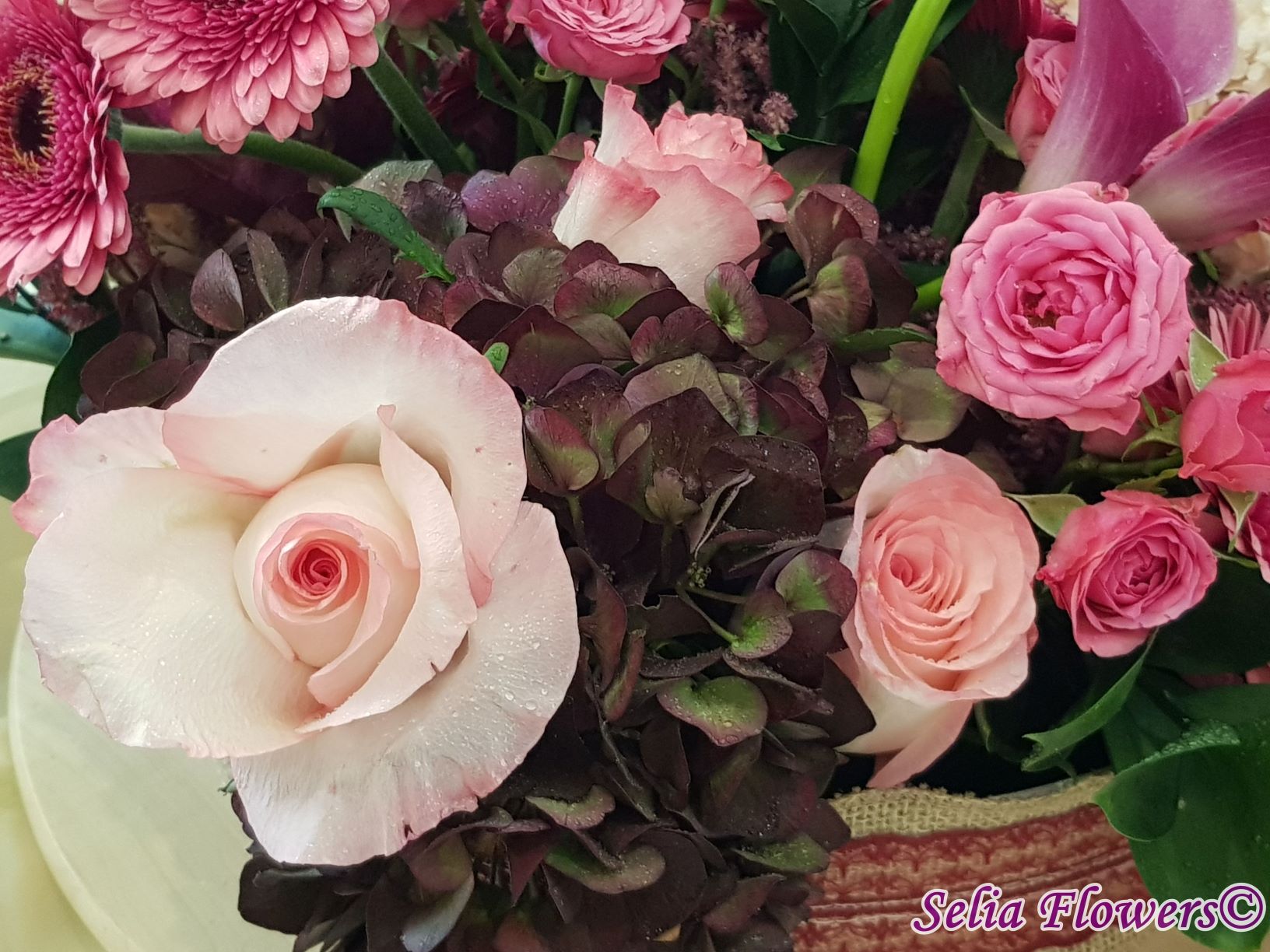 Un aranjament de masa parfumat si elegant, realizat in suport rotund din plastic si prevazut cu burete umed care asigura hidratarea florilor. Design-ul este construit din trandafiri, miniroze, hydrangea, mathiola, germinis, cale, hypericum si astilbe roz. Este finisat cu ruscus, frunze decorative și panglica din iuta prevazuta cu dantela.. Diametrul suportului este de 30 cm.