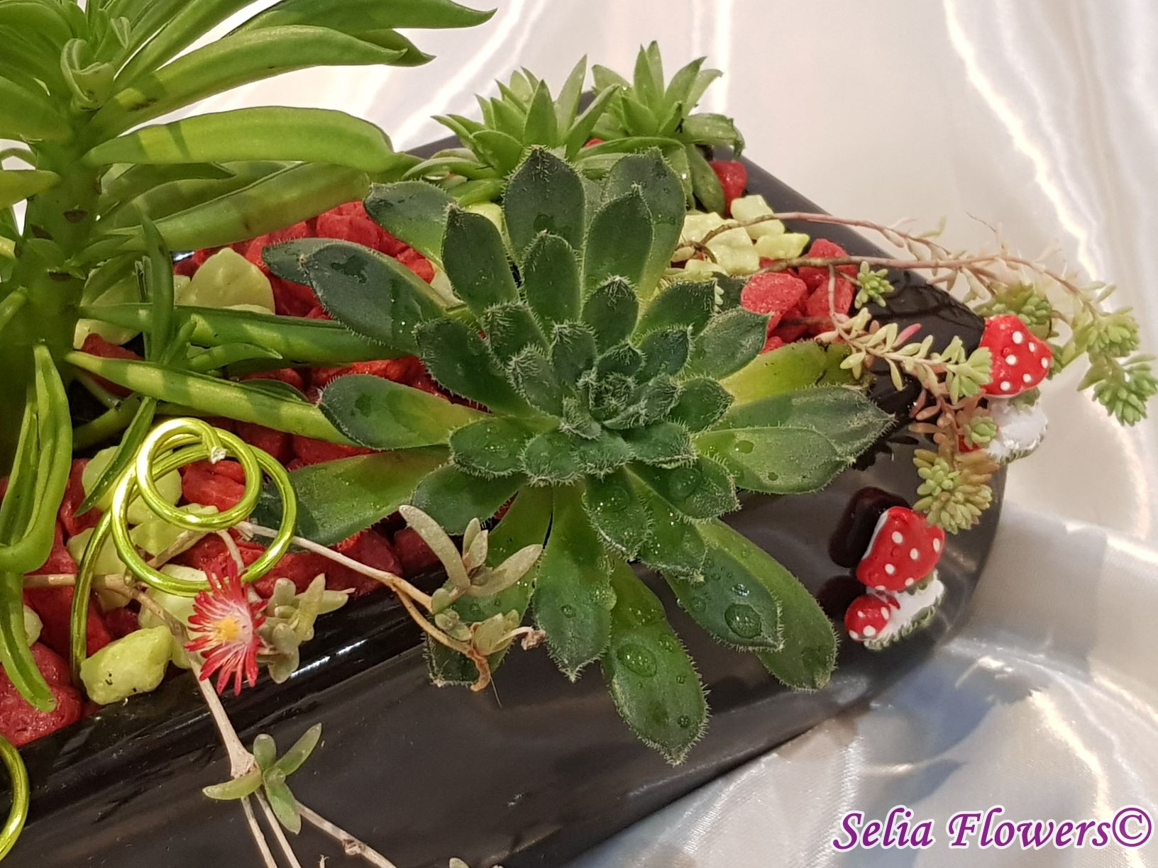 Un aranjament vesel, decorativ și elegant construit în vas ceramic dintr-un mix de plante suculente, accesorii decorative, pietre decorative in doua culori. Potrivit atât ca aranjament de business, dar și pentru a fi daruit unei persoane dragi care se poate bucura mult timp de el de acum inainte.
