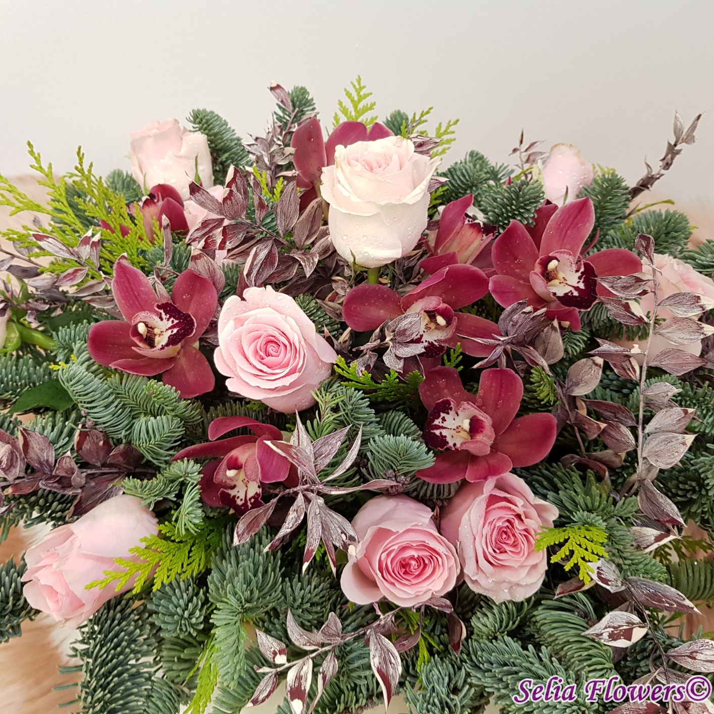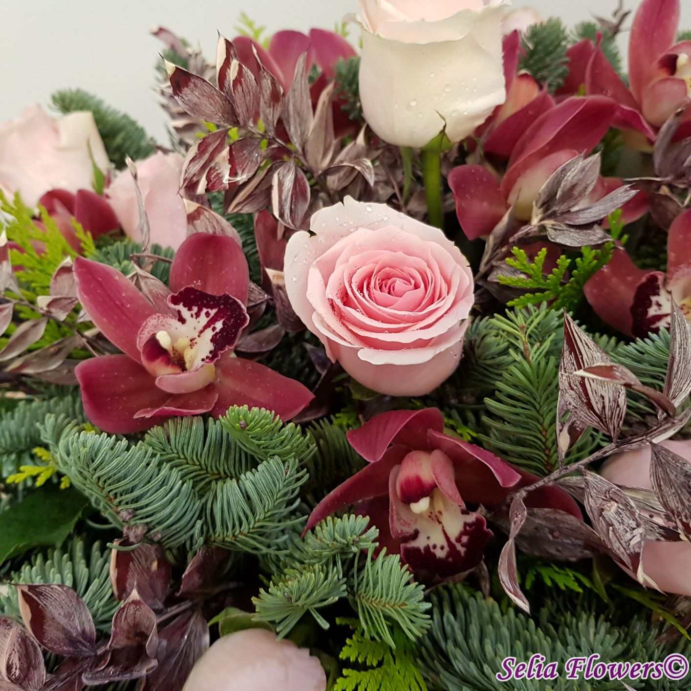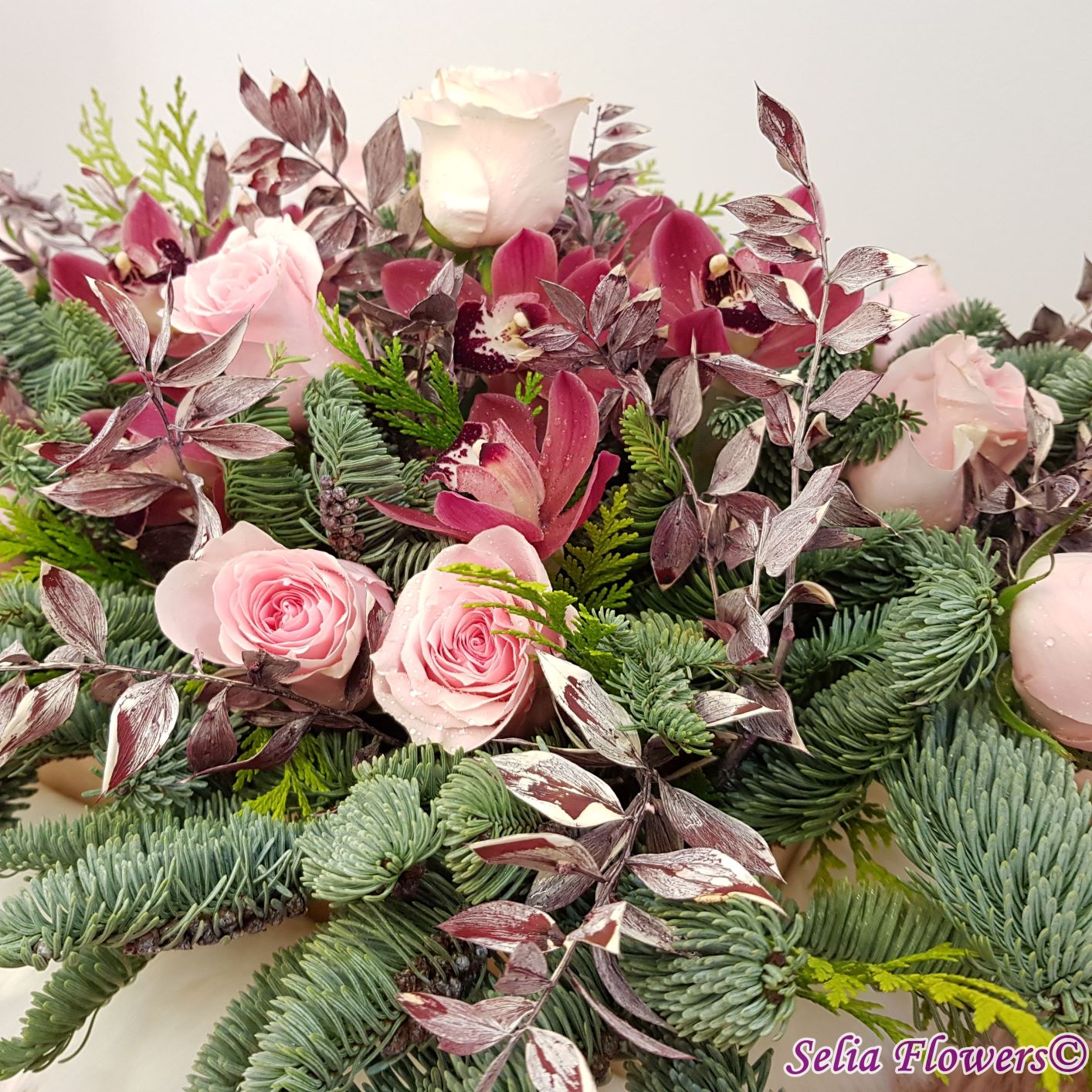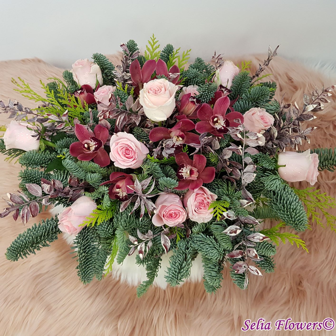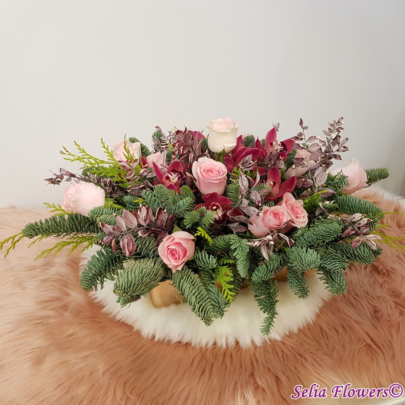 Compozitie: brad nobilis blue, tuia, 12 trandafiri, 10 cupe miniorhidee, ruscus natural stabilizat și vopsit.