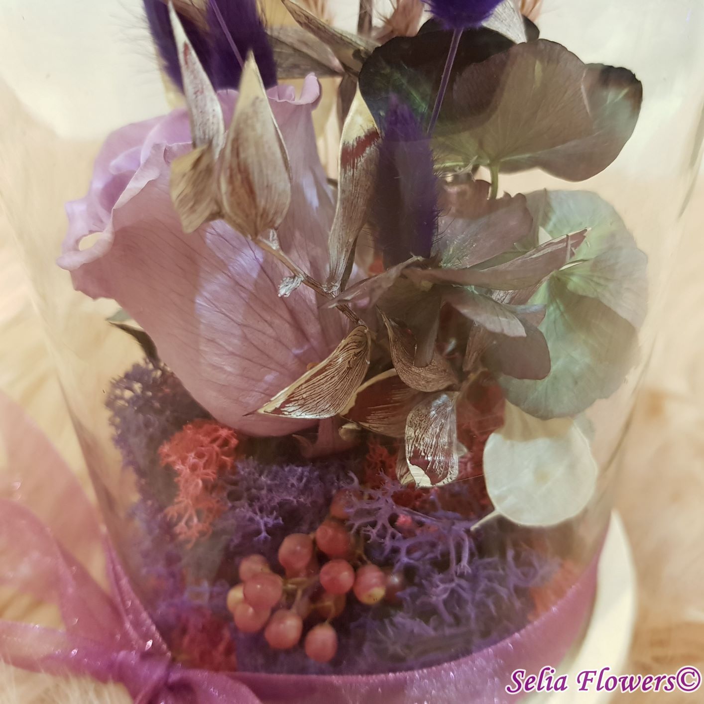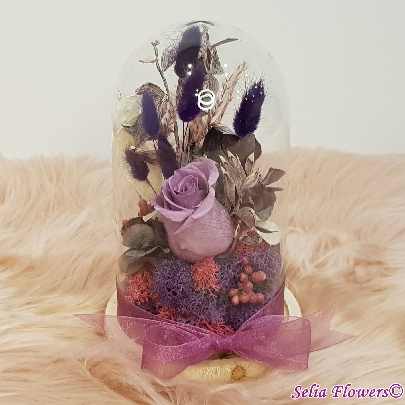 Este un aranjament permanent, construit în cupola de sticlă, cu trandafir criogenat și flori naturale permanente. Dimensiuni cupolă: înălțime - 18 cm, diametru - 10 cm.
