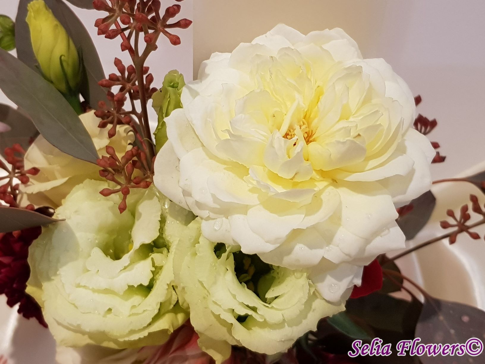 Compoziție florală: trandafiri parfumați de gradină, trandafiri red naomi, lisianthus, serruria, dalii, astrantia, eucalypt populus berry.