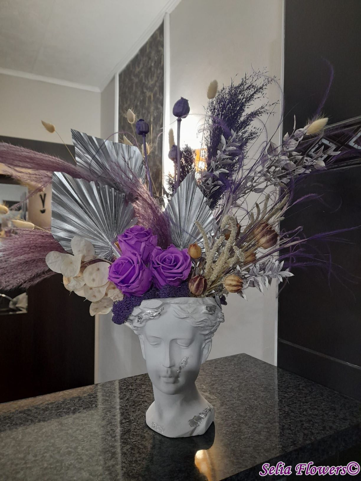 Un aranjament permanent chic, în tonuri de mov, argintiu și crem, construit în vas Venus. Un aranjament care trece cu ușurință proba timpului.