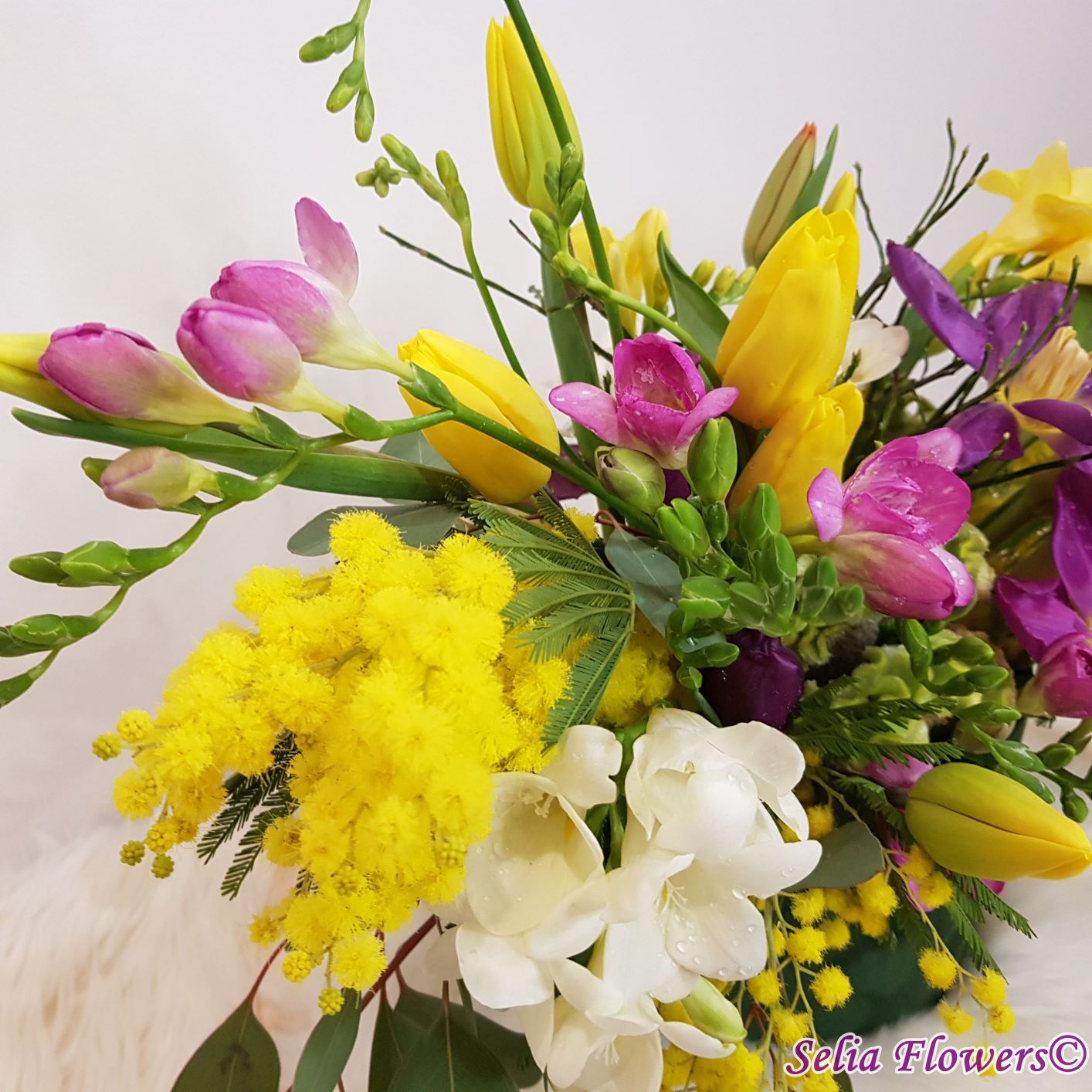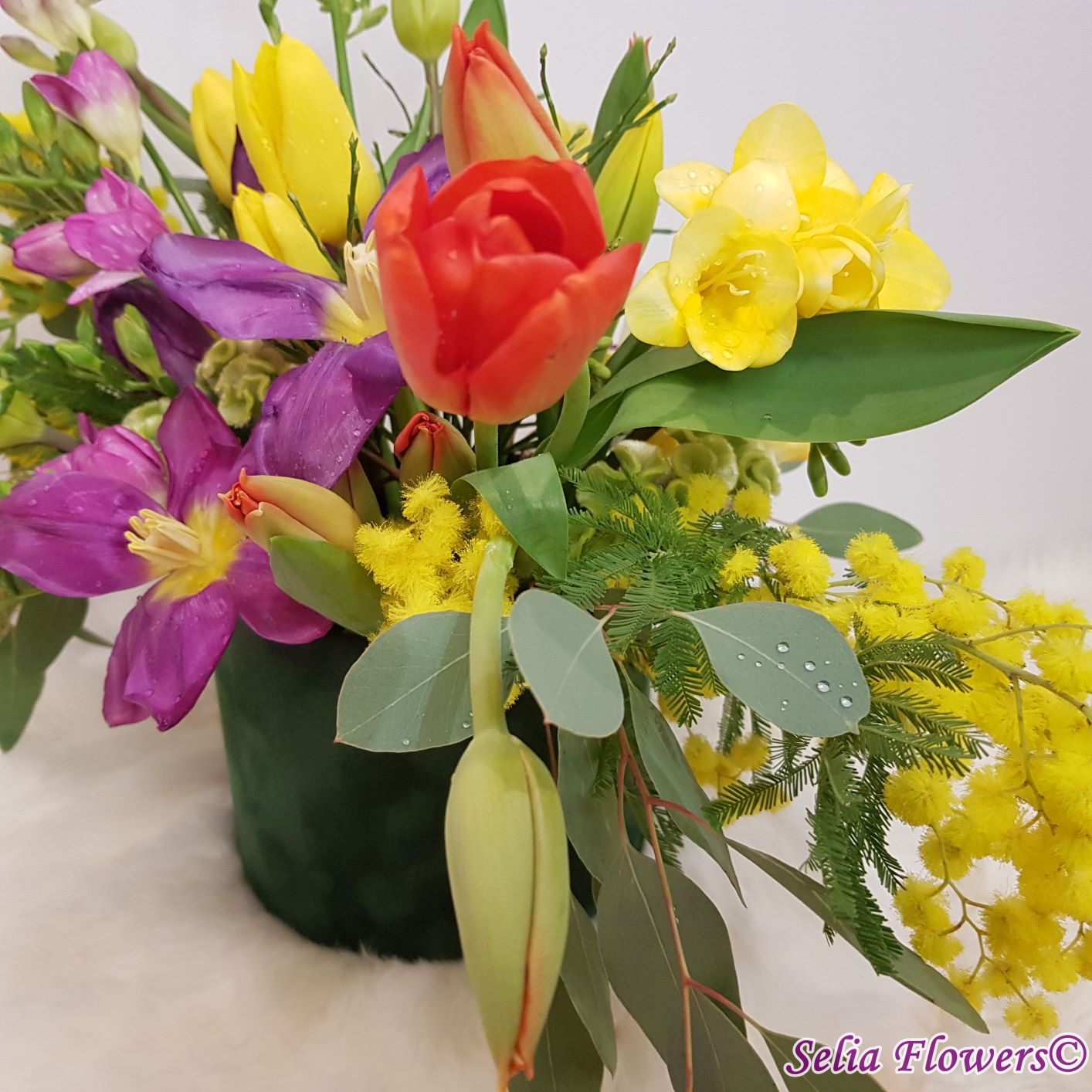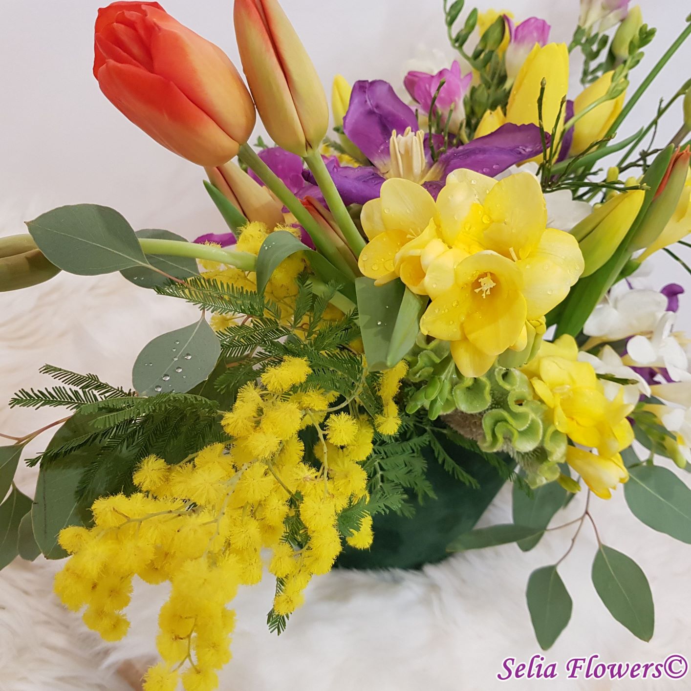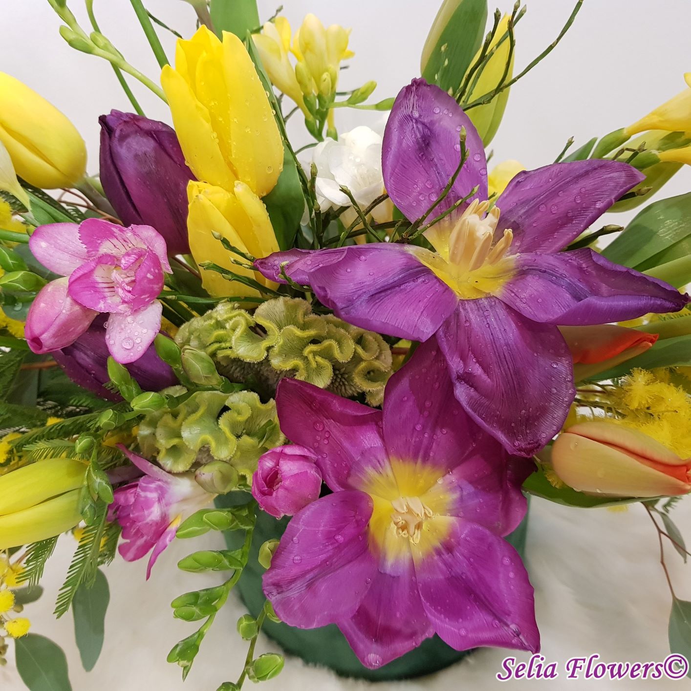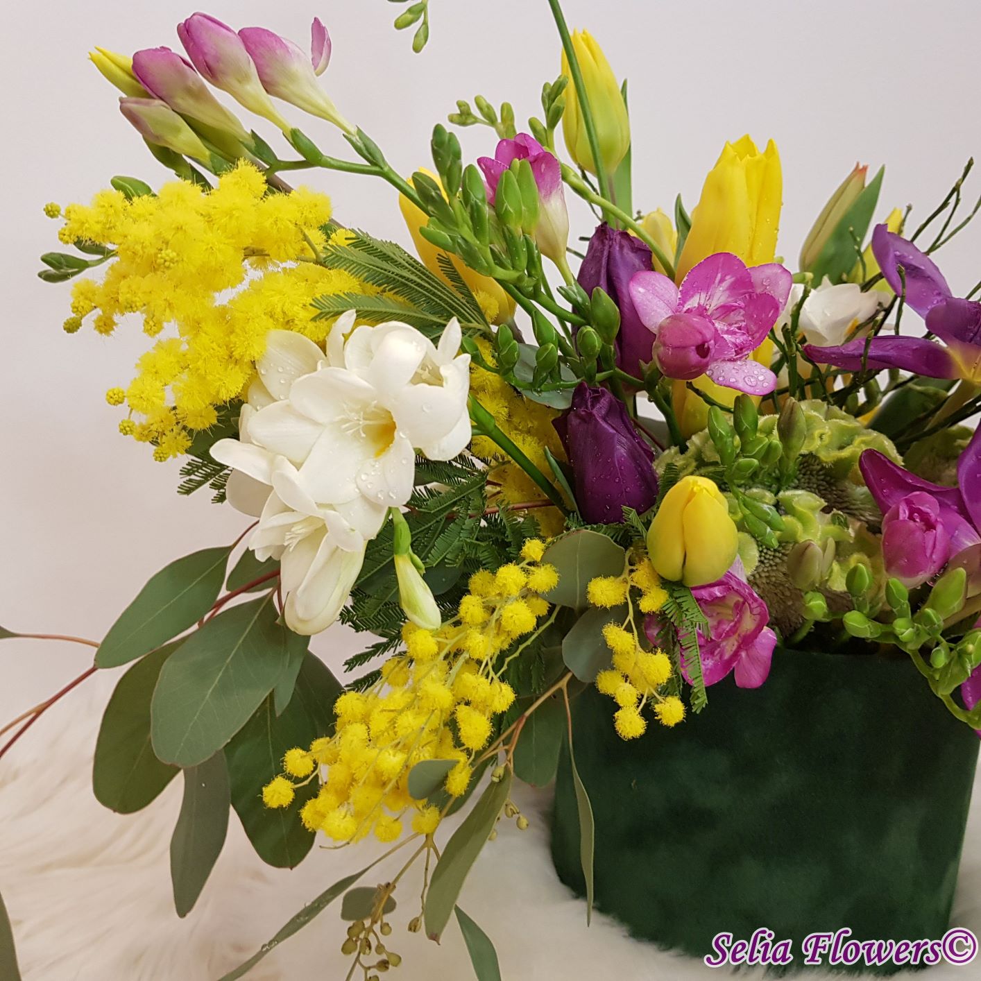 Un aranjament de primăvară, vesel și parfumat, construit în cutie de catifea cu flori de primăvară (lalele în trei culori, frezii, mimosa pudica, celosia, eucalipt).