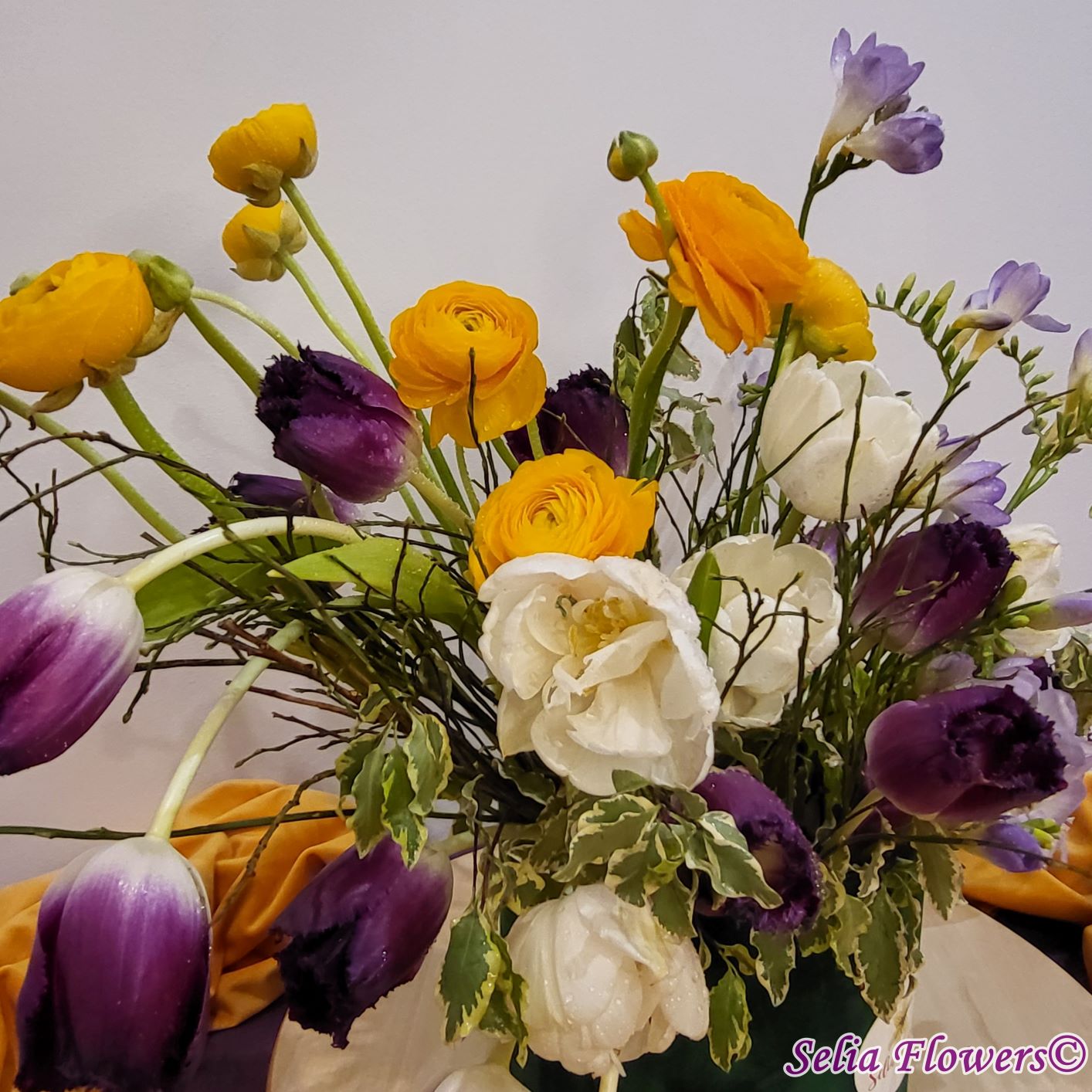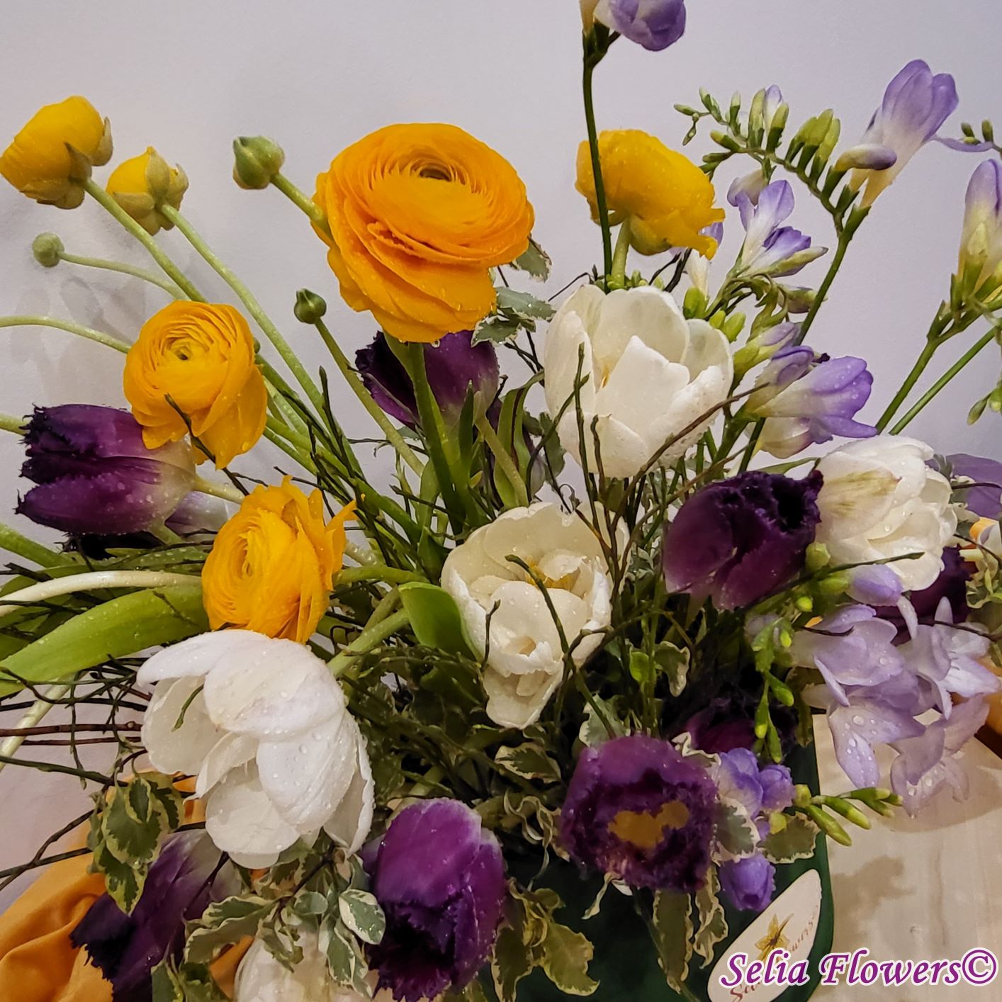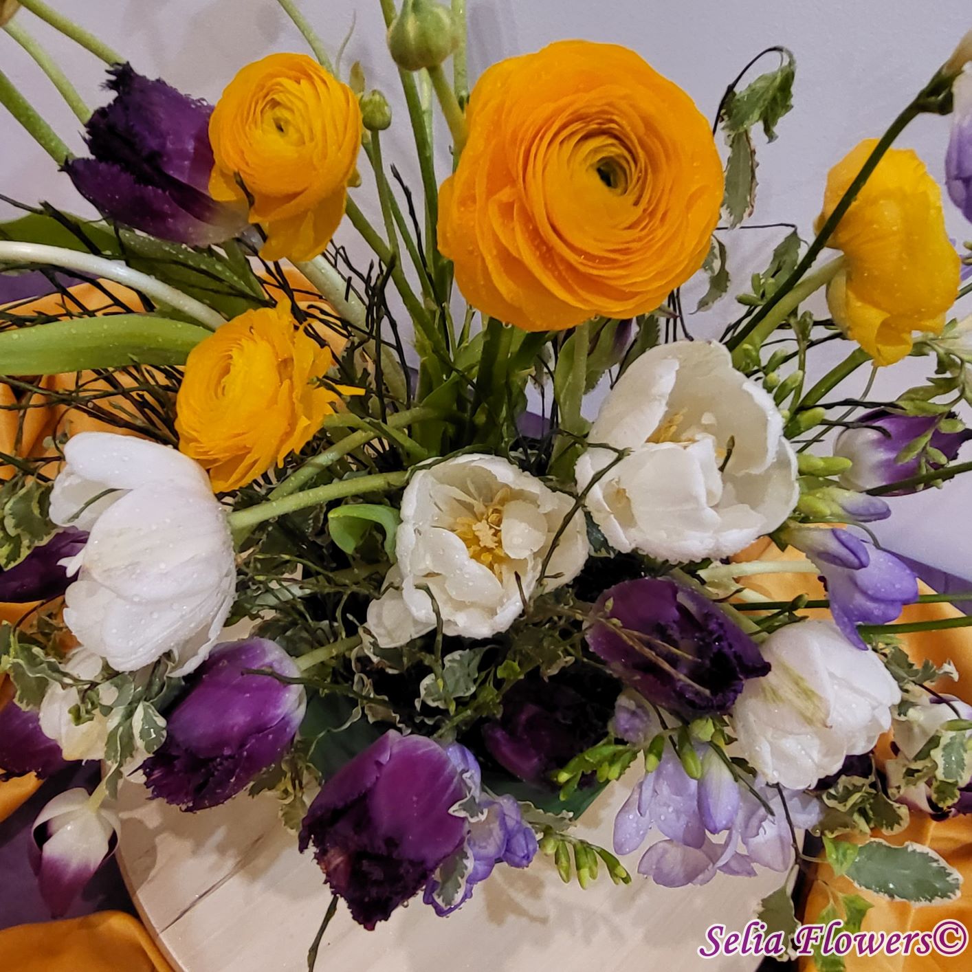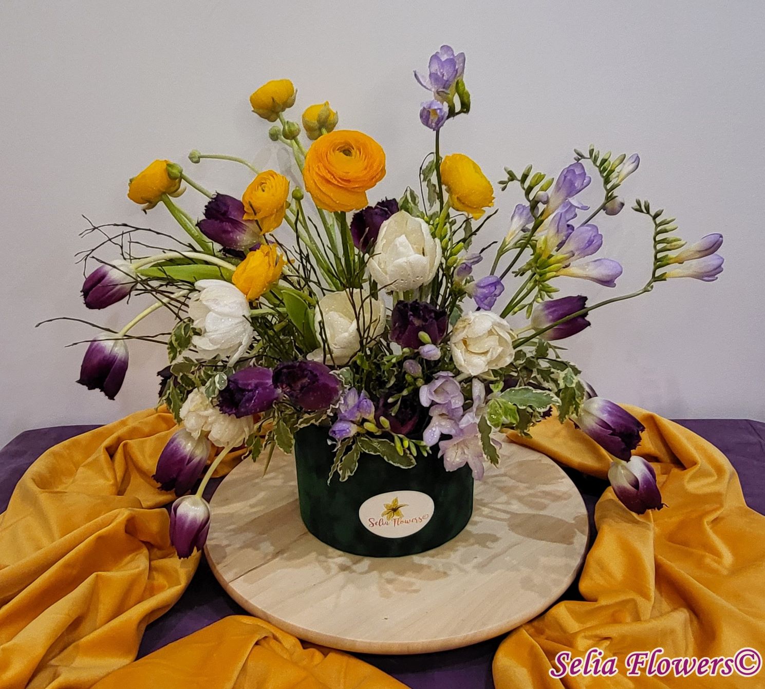 Un aranjament vesel, cu flori de primăvară (ranunculus, lalele, frezii, pittosporum), construit în cutie verde de catifea.