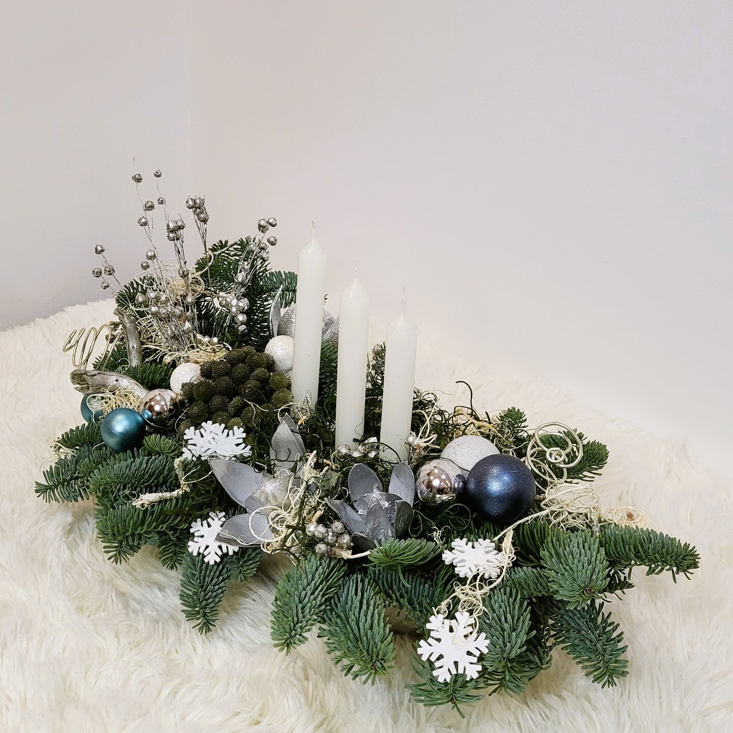 Este construit cu brad natural olandez, pe suport de burete umed, care îi asigură o hidratare de durată. Decorarea este făcută cu globuri în mai multe culori, plante conservate, mușchi conservat în două culori și alte elemente de decor specifice. Aranjamentul este prevăzut cu 3 lumânări albe.