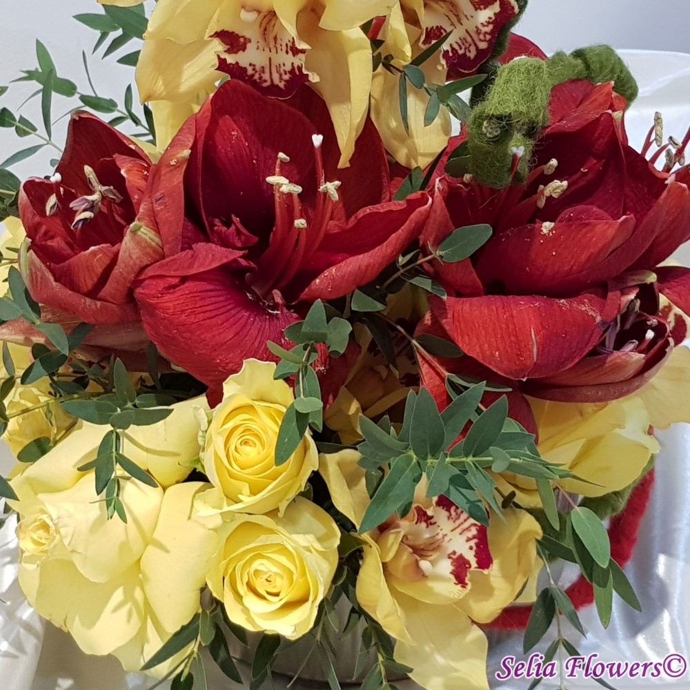 Aranjament in vas rotund, construit in suport de burete umed, cu amaryllis, trandafiri, orhidee cymbidium si accesorizat cu elemente din lana si verdeata.