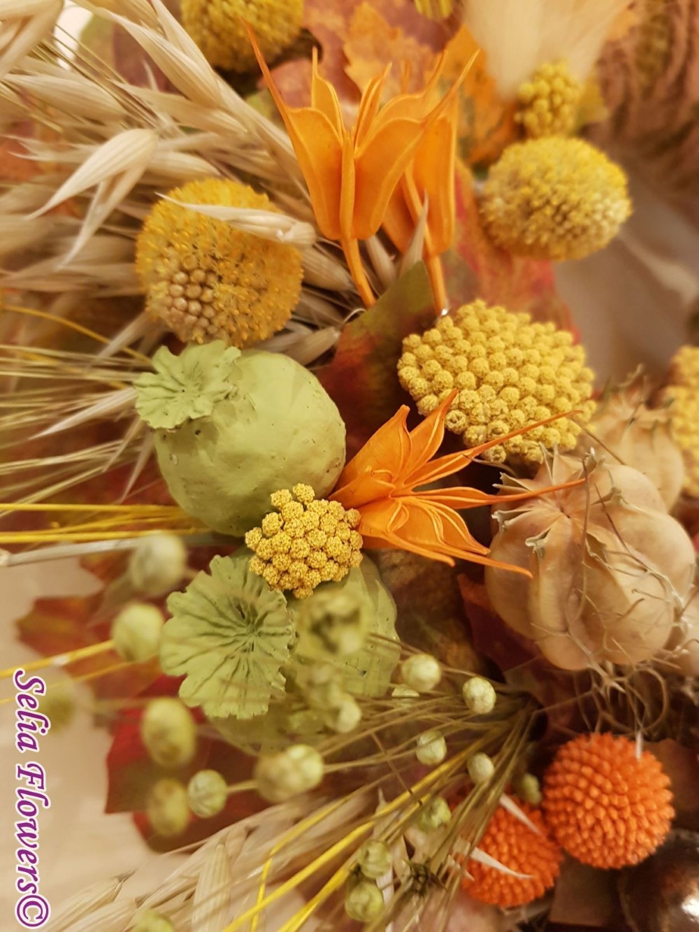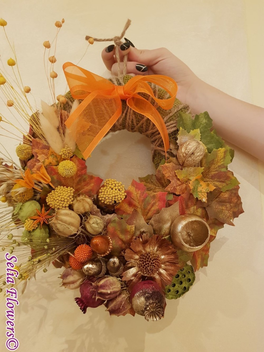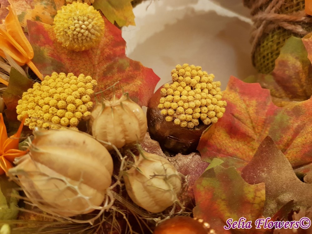 Coronita construita pe o baza hande made, din flori uscate si stabilizate: frunze aramii, verzi si burgundy, floare de protea, floare de lotus, ghinde, nuci, achillea, craspedia, flori de nigella, papaver capsule, in si orz.