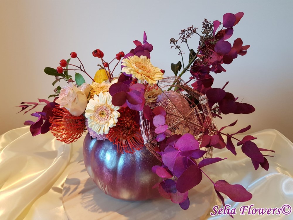 Un dovleac vopsit in doua culori, decorat cu flori naturale si minidovlecei, cu capac realizat cu ajutotul tehnicii spider web.
